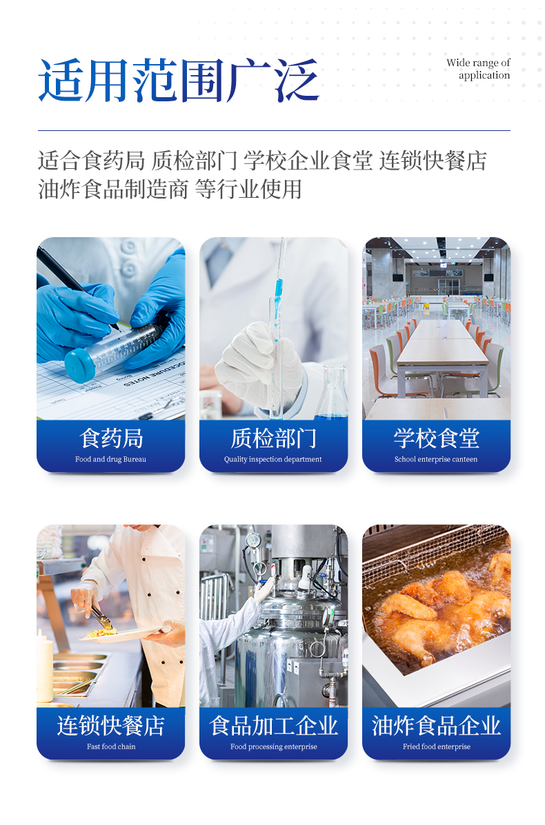 廣泛應(yīng)用于質(zhì)量監(jiān)督檢驗(yàn)、工商管理、油炸食品生產(chǎn)基地、食藥監(jiān)局、衛(wèi)生部門、肉制品食品深加工企業(yè)、商場超市、各大食品安全監(jiān)測系統(tǒng)等單位使用。