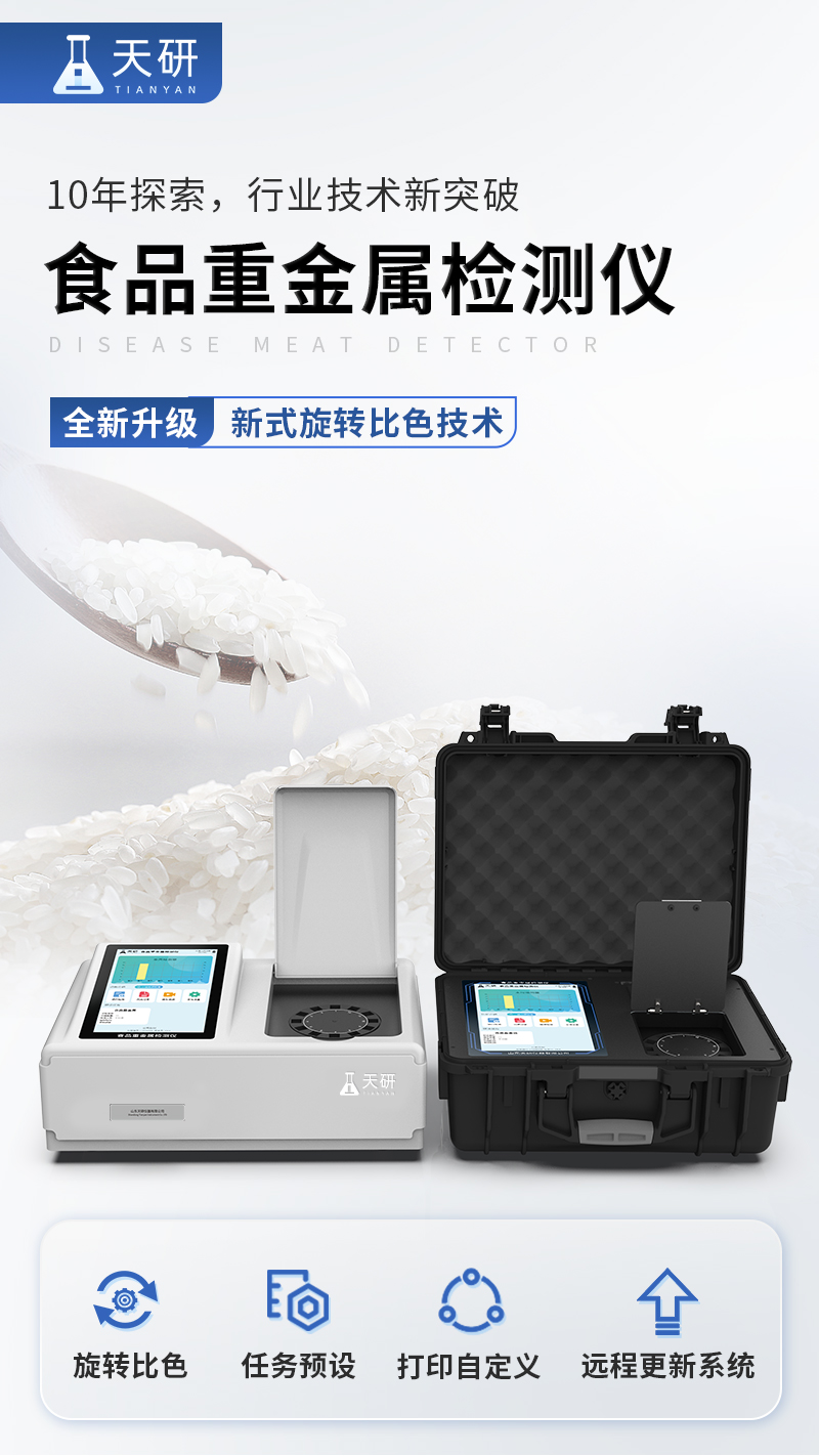 山東天研儀器有限公司生產(chǎn)的重金屬檢測(cè)儀為集成化食品安全快速檢測(cè)分析設(shè)備,采用臺(tái)式一體化設(shè)計(jì),重金屬檢測(cè)儀可廣泛應(yīng)用于大米、糧谷、果品、蔬菜、藥材、水產(chǎn)品中重金屬鉛、鎘、六價(jià)鉻、汞、砷、鐵、鎳、鋁等項(xiàng)目進(jìn)行快速定量檢測(cè),檢測(cè)項(xiàng)目可根據(jù)客戶的需求定制,儀器預(yù)留其他項(xiàng)目檢測(cè)程序和端口,根據(jù)日后需求可進(jìn)行遠(yuǎn)程升級(jí)