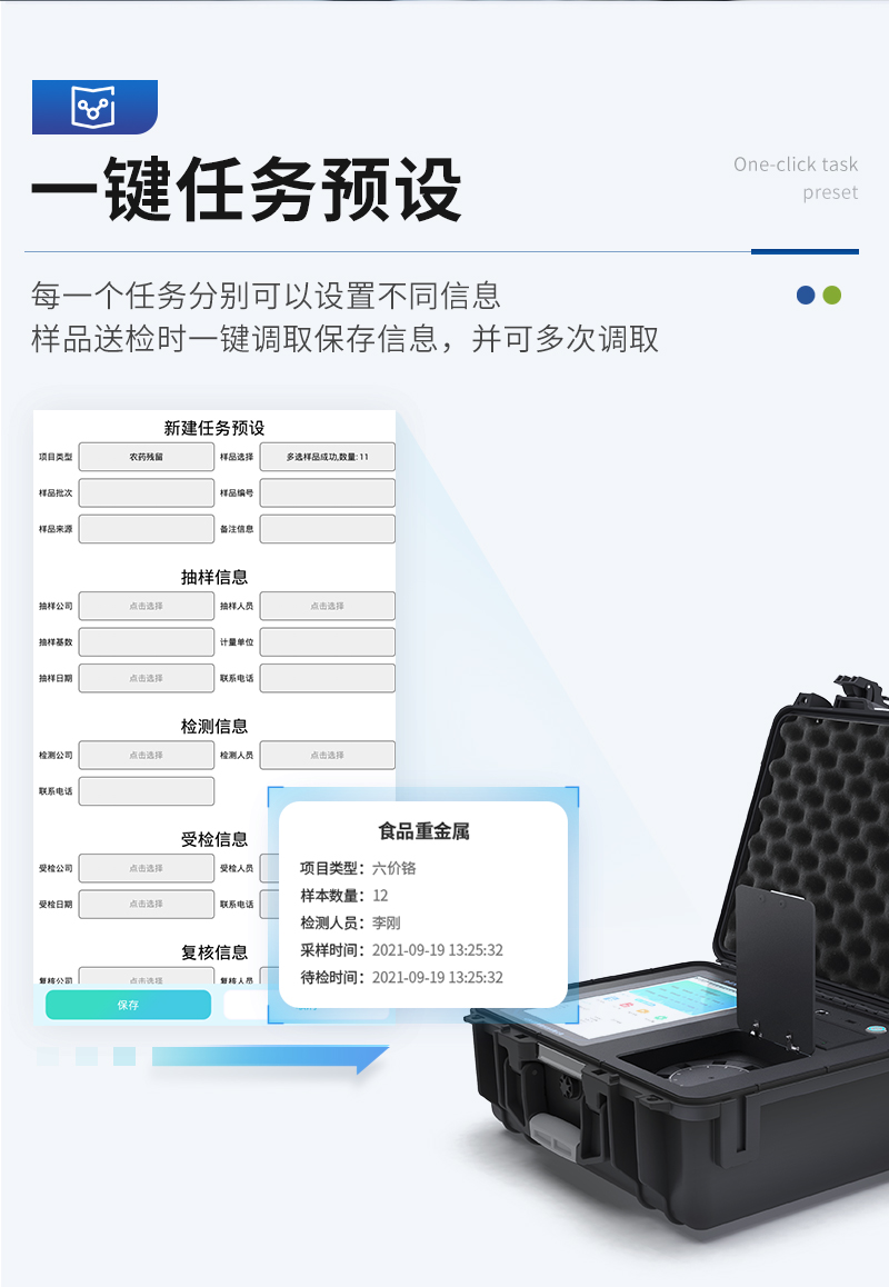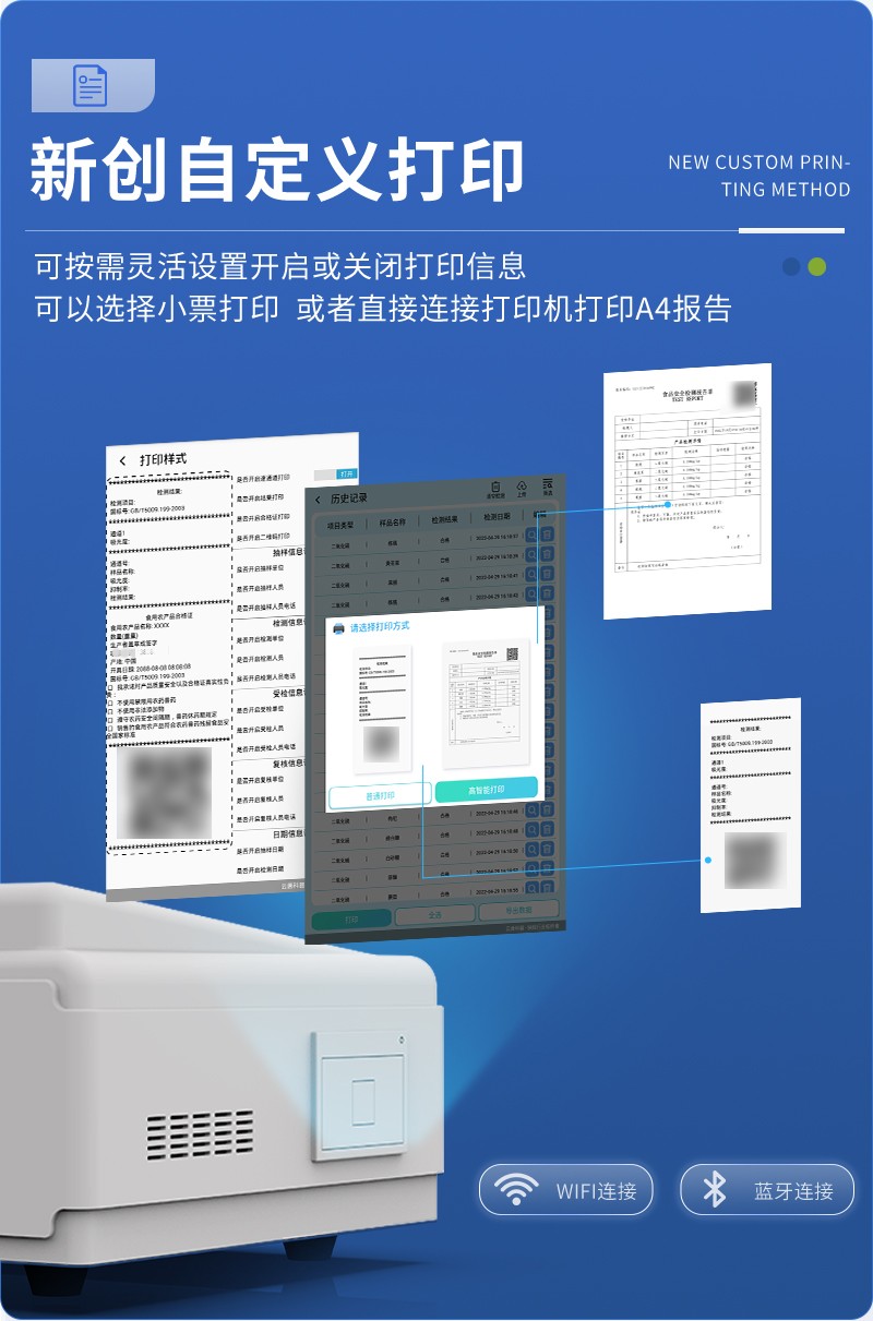 | 儀器采用臺(tái)式一體化系統(tǒng)檢測(cè)技術(shù),將分光光度模塊、數(shù)字化管理模塊、無(wú)線通訊模塊高度集成于一體,可支持檢測(cè)60種食品安全檢測(cè)項(xiàng)目,同時(shí)預(yù)留升級(jí)檢測(cè)方法。 | 儀器檢測(cè)模塊標(biāo)準(zhǔn)化、智能化,檢測(cè)項(xiàng)目可隨意自由組合。檢測(cè)箱體內(nèi)置多個(gè)標(biāo)準(zhǔn)檢測(cè)單元,檢測(cè)模塊可以調(diào)整配置。 | 儀器采用全新安卓智能系統(tǒng),主控芯片采用 ARM Cortex-A7,RK3288/4核處理器,10.1寸高清液晶觸摸豎屏,更加**的UI交互界面,運(yùn)轉(zhuǎn)快捷;儀器配備無(wú)線通信模塊: 4G(APN)通訊模塊、Wifi模塊,藍(lán)牙傳輸,同時(shí)具有雙USB接口以及RJ45接口能以多種方式實(shí)現(xiàn)數(shù)據(jù)保存和數(shù)據(jù)傳輸功能。 | 顯示屏幕:儀器采用10.1英寸豎向液晶觸摸屏顯,搭配運(yùn)行安卓智能操作系統(tǒng),主控芯片采用ARM Cortex-A7,RK3288/4核處理器,主頻1.88Ghz,操作方便,性能更強(qiáng)。 | 檢測(cè)通道:≥12通道;采用精密旋轉(zhuǎn)比色池設(shè)計(jì),使用同芯片同光源校準(zhǔn)精度,解決不同光源之間的誤差值,更加準(zhǔn)確**。(1-12通道間誤差0.1%,**號(hào):ZL202022821055.2) | 儀器光源:高精度進(jìn)口四波長(zhǎng)冷光源,每個(gè)通道均配置 410、520、590、630nm 波長(zhǎng)光源,標(biāo)配**的光路切換裝置,**光路切換功能可實(shí)現(xiàn)64波長(zhǎng),并且所有檢測(cè)項(xiàng)目可實(shí)現(xiàn)所有通道同時(shí)檢測(cè)。 | 設(shè)備可一鍵校準(zhǔn),自動(dòng)保存校準(zhǔn)數(shù)據(jù),自動(dòng)對(duì)比校驗(yàn),得到精準(zhǔn)光源,采用Android SP存儲(chǔ)數(shù)據(jù),光源數(shù)據(jù)永不丟失,方便每一次使用。 | 通訊接口:配備無(wú)線通信模塊、4G(APN)通訊模塊、藍(lán)牙傳輸,同時(shí)具有雙USB接口以及RJ45網(wǎng)線接口,可以多方式實(shí)現(xiàn)數(shù)據(jù)保存及數(shù)據(jù)傳輸。 | 存儲(chǔ)方式:支持U盤存儲(chǔ),標(biāo)準(zhǔn)USB接口,免驅(qū)動(dòng)安裝。檢測(cè)結(jié)果存儲(chǔ)容量20萬(wàn)條以上,可生成Excel表格進(jìn)行拷貝,并具有登錄保護(hù)功能。 | 智能化操作系統(tǒng): | 1、操作系統(tǒng):儀器可在同一檢測(cè)界面自動(dòng)對(duì)應(yīng)相關(guān)檢測(cè)通道,一次性選擇1-12個(gè)樣品名稱,無(wú)需退出界面,節(jié)省操作時(shí)間。并可以對(duì)每個(gè)通道屬性和樣品信息單獨(dú)進(jìn)行編輯,例如送檢單位、人員,檢測(cè)人員等,打印時(shí)勾選打印顯示。 | 2、數(shù)據(jù)集成系統(tǒng):設(shè)備首頁(yè)自動(dòng)匯總分析檢測(cè)數(shù)據(jù),包含:周檢測(cè)數(shù)據(jù)、月檢測(cè)數(shù)據(jù),全部檢測(cè)總數(shù)量,均包含檢測(cè)總數(shù),合格數(shù),不合格數(shù),以及相關(guān)柱形分析圖,各項(xiàng)檢測(cè)數(shù)據(jù)一目了然,無(wú)需電腦查詢,更加快捷直觀。 | 3、數(shù)據(jù)庫(kù)系統(tǒng):十幾項(xiàng)數(shù)據(jù)庫(kù)分類管理儀器:包含項(xiàng)目類型、項(xiàng)目數(shù)據(jù)、檢測(cè)數(shù)據(jù)、歷史記錄、國(guó)標(biāo)信息、曲線信息、采樣信息、檢測(cè)信息、受檢信息、復(fù)核信息、圖表信息、光源校準(zhǔn)信息、打印樣式信息、樣品庫(kù)信息等等,數(shù)據(jù)庫(kù)之間互相協(xié)調(diào)聯(lián)動(dòng)保證數(shù)據(jù)的真實(shí)完整性。同時(shí)產(chǎn)品數(shù)據(jù)庫(kù)以及歷史檢測(cè)記錄支持一鍵檢索功能。 | 4、限量規(guī)判系統(tǒng):具有限量查詢、添加物質(zhì)合規(guī)判定系統(tǒng)。檢測(cè)出結(jié)果后,系統(tǒng)自動(dòng)調(diào)用系統(tǒng)數(shù)據(jù)庫(kù)中相關(guān)國(guó)標(biāo)進(jìn)行比對(duì)判定,客觀顯示判定結(jié)果是否合格。 | 5、項(xiàng)目預(yù)設(shè)系統(tǒng):儀器具有任務(wù)預(yù)設(shè)模塊,一鍵提前預(yù)設(shè),給出方便快捷的新檢測(cè)方案,每一個(gè)任務(wù)分別可以設(shè)置不同的樣品、批次、編號(hào)、來(lái)源、備注、抽樣信息、檢測(cè)信息、受檢信息、復(fù)核信息等更多信息。樣品送檢時(shí)一鍵調(diào)取保存信息,并可多次調(diào)取,大大提高檢測(cè)效率。 | 6、數(shù)據(jù)監(jiān)管系統(tǒng):同步對(duì)接監(jiān)管平臺(tái),數(shù)據(jù)可局域網(wǎng)和互聯(lián)網(wǎng)數(shù)據(jù)上傳,檢測(cè)結(jié)果可選擇直接傳至食品安全監(jiān)管平臺(tái)。進(jìn)行區(qū)域食品安全監(jiān)管及大數(shù)據(jù)分析處理與數(shù)據(jù)統(tǒng)計(jì),檢測(cè)區(qū)域食品安全長(zhǎng)短期動(dòng)態(tài),達(dá)到食品安全問(wèn)題預(yù)估、預(yù)警。 | 7、全新打印系統(tǒng):內(nèi)置全新打印機(jī),新創(chuàng)自定義打印方式,可按需靈活勾選控制:二維碼,抽樣信息、檢測(cè)信息,受檢信息、復(fù)核信息、抽樣日期、檢測(cè)日期等信息的打印。 | 8、A4紙版本報(bào)告打印功能(可選配):設(shè)備擁有兩種結(jié)果展示方式,可以自動(dòng)生成A4打印模板和小票打印模板兩種樣式,可通過(guò)WiFi及網(wǎng)線等方式鏈接外置打印機(jī)可進(jìn)行打印。 | 供電模式:儀器交直流兩用,直流12V供電,可連接車載電源,可配6ah大容量充電鋰電池,電量可實(shí)時(shí)顯示,方便戶外流動(dò