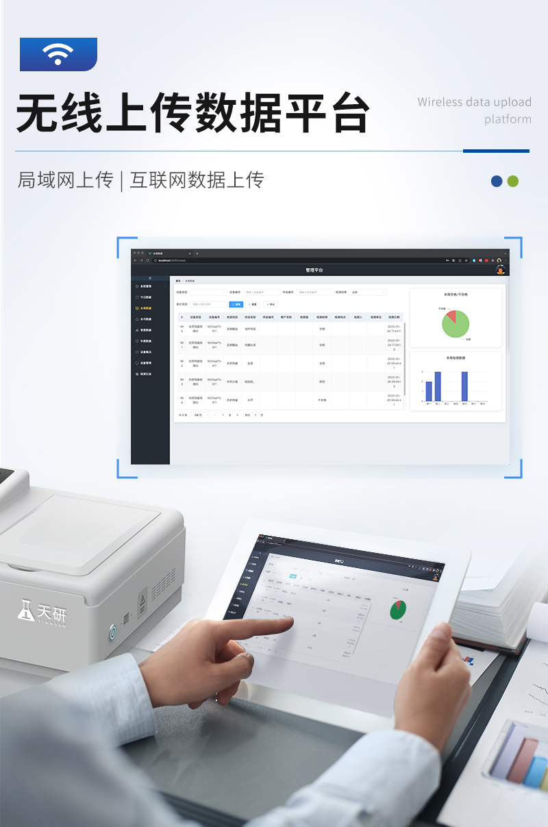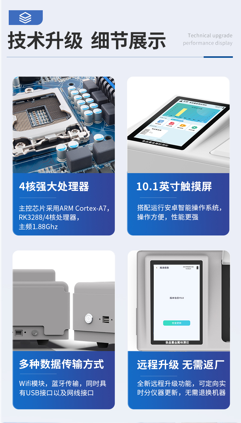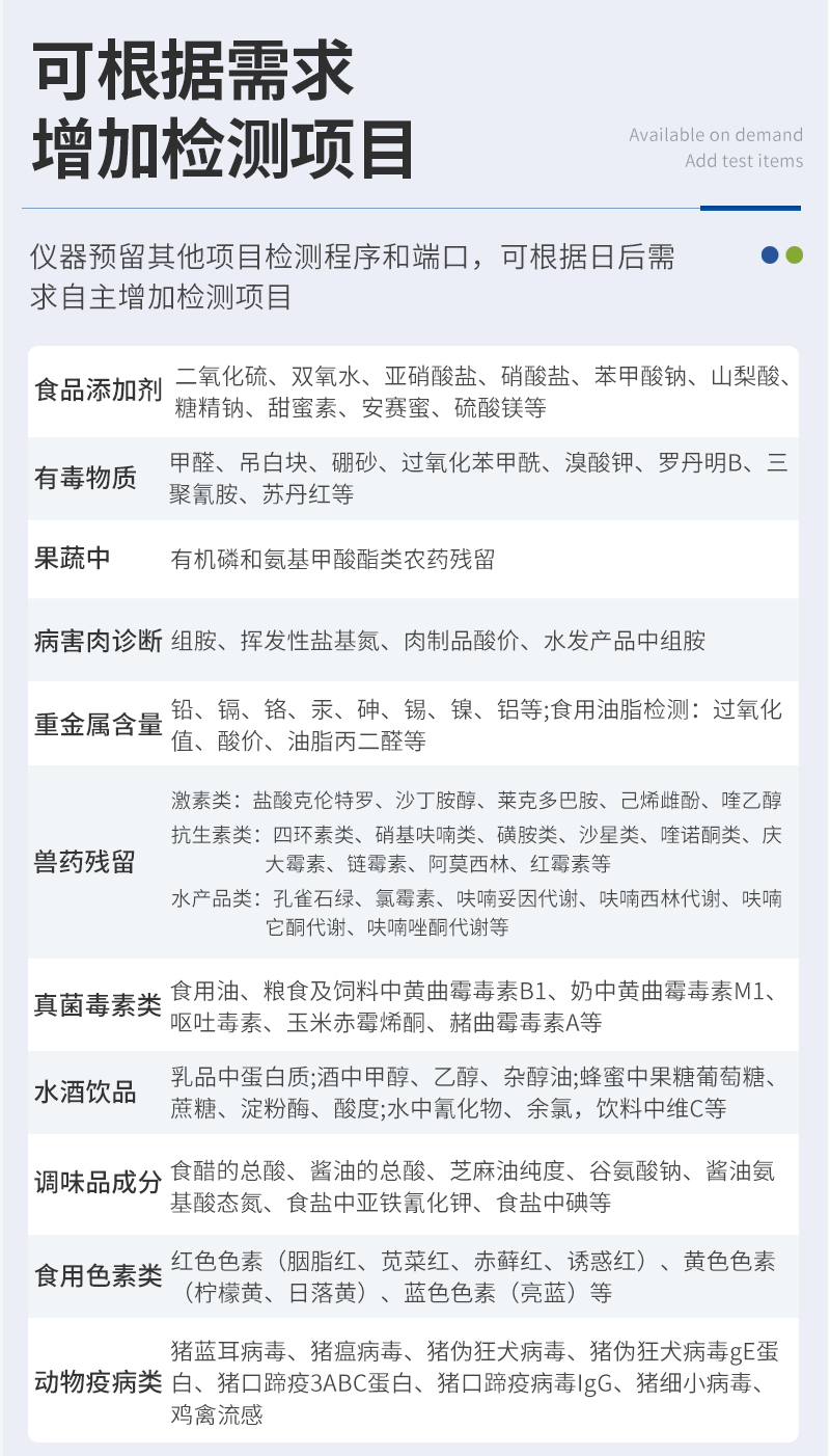 | 儀器采用手提一體化系統(tǒng)檢測技術(shù),將分光光度模塊、數(shù)字化管理模塊、無線通訊模塊高度集成于一體,可支持檢測60種食品安全檢測項目,同時預(yù)留升級檢測方法。 | 儀器檢測模塊標(biāo)準(zhǔn)化、智能化,檢測項目可隨意自由組合。檢測箱體內(nèi)置多個標(biāo)準(zhǔn)檢測單元,檢測模塊可以調(diào)整配置。 | 儀器采用全新安卓智能系統(tǒng),主控芯片采用 ARM Cortex-A7,RK3288/4核處理器,10.1寸高清液晶觸摸豎屏,更加**的UI交互界面,運(yùn)轉(zhuǎn)快捷;儀器配備無線通信模塊: 4G(APN)通訊模塊、Wifi模塊,藍(lán)牙傳輸,同時具有雙USB接口以及RJ45接口能以多種方式實(shí)現(xiàn)數(shù)據(jù)保存和數(shù)據(jù)傳輸功能。 | 顯示屏幕:儀器采用10.1英寸豎向液晶觸摸屏顯,搭配運(yùn)行安卓智能操作系統(tǒng),主控芯片采用ARM Cortex-A7,RK3288/4核處理器,主頻1.88Ghz,操作方便,性能更強(qiáng)。 | 檢測通道:≥12通道;采用精密旋轉(zhuǎn)比色池設(shè)計,使用同芯片同光源校準(zhǔn)精度,解決不同光源之間的誤差值,更加準(zhǔn)確**。(1-12通道間誤差0.1%,**號:ZL202022821055.2) | 儀器光源:高精度進(jìn)口四波長冷光源,每個通道均配置 410、520、590、630nm 波長光源,標(biāo)配**的光路切換裝置,**光路切換功能可實(shí)現(xiàn)64波長,并且所有檢測項目可實(shí)現(xiàn)所有通道同時檢測。 | 設(shè)備可一鍵校準(zhǔn),自動保存校準(zhǔn)數(shù)據(jù),自動對比校驗(yàn),得到精準(zhǔn)光源,采用Android SP存儲數(shù)據(jù),光源數(shù)據(jù)永不丟失,方便每一次使用。 | 通訊接口:配備無線通信模塊、4G(APN)通訊模塊、藍(lán)牙傳輸,同時具有雙USB接口以及RJ45網(wǎng)線接口,可以多方式實(shí)現(xiàn)數(shù)據(jù)保存及數(shù)據(jù)傳輸。 | 存儲方式:支持U盤存儲,標(biāo)準(zhǔn)USB接口,免驅(qū)動安裝。檢測結(jié)果存儲容量20萬條以上,可生成Excel表格進(jìn)行拷貝,并具有登錄保護(hù)功能。 | 智能化操作系統(tǒng): | 1、操作系統(tǒng):儀器可在同一檢測界面自動對應(yīng)相關(guān)檢測通道,一次性選擇1-12個樣品名稱,無需退出界面,節(jié)省操作時間。并可以對每個通道屬性和樣品信息單獨(dú)進(jìn)行編輯,例如送檢單位、人員,檢測人員等,打印時勾選打印顯示。 | 2、數(shù)據(jù)集成系統(tǒng):設(shè)備首頁自動匯總分析檢測數(shù)據(jù),包含:周檢測數(shù)據(jù)、月檢測數(shù)據(jù),全部檢測總數(shù)量,均包含檢測總數(shù),合格數(shù),不合格數(shù),以及相關(guān)柱形分析圖,各項檢測數(shù)據(jù)一目了然,無需電腦查詢,更加快捷直觀。 | 3、數(shù)據(jù)庫系統(tǒng):十幾項數(shù)據(jù)庫分類管理儀器:包含項目類型、項目數(shù)據(jù)、檢測數(shù)據(jù)、歷史記錄、國標(biāo)信息、曲線信息、采樣信息、檢測信息、受檢信息、復(fù)核信息、圖表信息、光源校準(zhǔn)信息、打印樣式信息、樣品庫信息等等,數(shù)據(jù)庫之間互相協(xié)調(diào)聯(lián)動保證數(shù)據(jù)的真實(shí)完整性。同時產(chǎn)品數(shù)據(jù)庫以及歷史檢測記錄支持一鍵檢索功能。 | 4、限量規(guī)判系統(tǒng):具有限量查詢、添加物質(zhì)合規(guī)判定系統(tǒng)。檢測出結(jié)果后,系統(tǒng)自動調(diào)用系統(tǒng)數(shù)據(jù)庫中相關(guān)國標(biāo)進(jìn)行比對判定,客觀顯示判定結(jié)果是否合格。 | 5、項目預(yù)設(shè)系統(tǒng):儀器具有任務(wù)預(yù)設(shè)模塊,一鍵提前預(yù)設(shè),給出方便快捷的新檢測方案,每一個任務(wù)分別可以設(shè)置不同的樣品、批次、編號、來源、備注、抽樣信息、檢測信息、受檢信息、復(fù)核信息等更多信息。樣品送檢時一鍵調(diào)取保存信息,并可多次調(diào)取,大大提高檢測效率。 | 6、數(shù)據(jù)監(jiān)管系統(tǒng):同步對接監(jiān)管平臺,數(shù)據(jù)可局域網(wǎng)和互聯(lián)網(wǎng)數(shù)據(jù)上傳,檢測結(jié)果可選擇直接傳至食品安全監(jiān)管平臺。進(jìn)行區(qū)域食品安全監(jiān)管及大數(shù)據(jù)分析處理與數(shù)據(jù)統(tǒng)計,檢測區(qū)域食品安全長短期動態(tài),達(dá)到食品安全問題預(yù)估、預(yù)警。 | 7、全新打印系統(tǒng):內(nèi)置全新打印機(jī),新創(chuàng)自定義打印方式,可按需靈活勾選控制:二維碼,抽樣信息、檢測信息,受檢信息、復(fù)核信息、抽樣日期、檢測日期等信息的打印。 | 8、A4紙版本報告打印功能(可選配):設(shè)備擁有兩種結(jié)果展示方式,可以自動生成A4打印模板和小票打印模板兩種樣式,可通過WiFi及網(wǎng)線等方式鏈接外置打印機(jī)可進(jìn)行打印。 | 供電模式:儀器交直流兩用,直流12V供電,可連接車載電源,可配6ah大容量充電鋰電池,電量可實(shí)時顯示,方便戶外流動測試。 | 儀器具備遠(yuǎn)程升級功能,可定向分客戶分儀器更新,開機(jī)后自動更新,并可持續(xù)性免費(fèi)更新系統(tǒng)版本,無需像傳統(tǒng)產(chǎn)品返廠更新,節(jié)省時間及人力成本并避免了物流運(yùn)輸返廠升級導(dǎo)致設(shè)備損壞的潛在風(fēng)險。 |