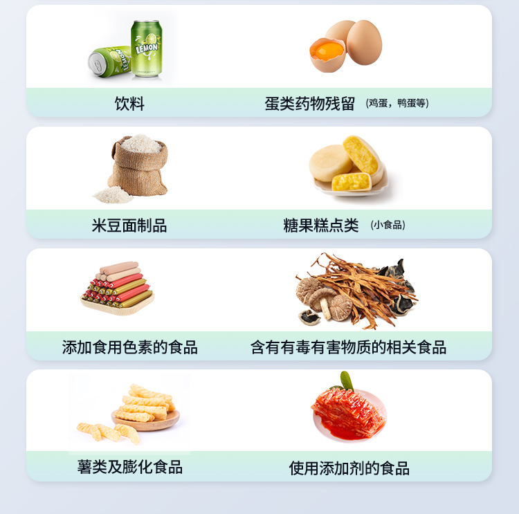 | 食品添加劑:二氧化硫、雙氧水、亞硝酸鹽、硝酸鹽、苯甲酸鈉、山梨酸鉀、糖精鈉、甜蜜素、木耳硫酸鎂等 | 有毒有害物質(zhì):甲醛、吊白塊、硼砂、過氧化苯甲酰、溴酸鉀、羅丹明B、三聚氰胺、蘇丹紅、工業(yè)堿、尿素、明礬等 | 食用油脂:過氧化值、酸價(jià)等 | 果蔬:農(nóng)藥殘留(酶抑制率法) | 病害肉:組胺、揮發(fā)性鹽基氮 | 重金屬含量: 鉛、鎘、鉻、汞、砷、錫、鎳、鋁等 | 瘦肉精激素:鹽酸克倫特羅、沙丁胺醇、萊克多巴胺、己烯雌酚等 | 抗生素殘留:四環(huán)素類、硝基呋喃類、磺胺類、β-興奮劑類、沙星類、磺胺類、喹諾酮類,甲砜霉素,氟苯尼考,金剛烷胺、替米考星、慶大霉素、林可霉素、鏈霉素、恩諾沙星、環(huán)丙沙星、頭孢啦啶、青霉素、阿莫西林等 | 水產(chǎn)品安全類:孔雀石綠、氯霉素、呋喃妥因、呋喃西林、呋喃它酮、呋喃唑酮等 | 蛋類藥物殘留:氯霉素,四環(huán)素,磺胺類,喹諾酮類,呋喃西林,呋喃它酮,呋喃妥因,呋喃唑酮,氟苯尼考,阿莫西林、頭孢氨芐、紅霉素、鏈霉素等 | 真菌毒素殘留:食用油、糧食及飼料中黃曲霉毒素B1、黃曲霉毒素總量,奶中黃曲霉毒素M1、嘔吐毒素、玉米赤霉烯酮、赭曲霉毒素A、T2毒素、伏馬毒素等 | 水酒飲品分析:酒中甲醇、乙醇、乳品及牛奶中蛋白質(zhì), | 蜂蜜成分:果糖和葡萄糖、蔗糖、淀粉酶、酸度等 | 調(diào)味品成分:食醋的總酸、醬油的總酸、芝麻油純度、谷氨酸鈉、醬油氨基酸態(tài)氮、食鹽中亞鐵氰化鉀、食鹽中碘等 | 食用色素類:紅色色素(胭脂紅、莧菜紅、莧菜紅)、黃色色素(檸檬黃、日落黃)、藍(lán)色色素(亮藍(lán))等 | 動(dòng)物疫病類:禽流感、新城疫、牛羊口蹄疫、牛羊結(jié)核病、牛羊包蟲、牛羊布病、小反芻獸、豬藍(lán)耳病毒、豬瘟病毒、豬偽狂犬病毒、豬細(xì)小、豬圓環(huán)、犬細(xì)小病毒、犬瘟熱病毒、犬狂犬病毒等 |