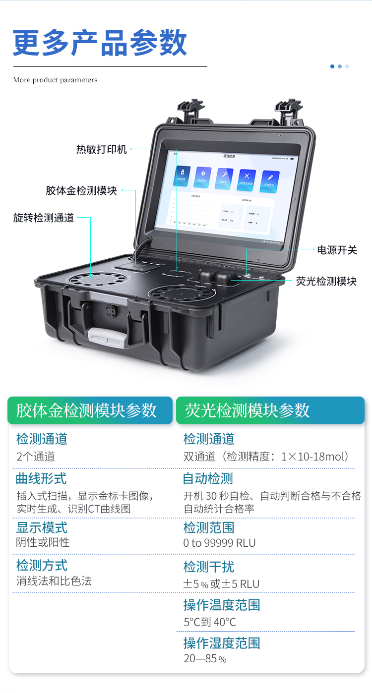 | 儀器采用臺(tái)式一體化系統(tǒng)檢測技術(shù),將分光光度模塊、膠體金檢測模塊、新型農(nóng)殘檢測模塊、數(shù)字化管理模塊、無線通訊模塊高度集成于一體,支持檢測200種食品安全檢測項(xiàng)目,同時(shí)預(yù)留升級(jí)檢測方法。 | 儀器檢測模塊標(biāo)準(zhǔn)化、智能化,可隨意自由組合。檢測箱體內(nèi)置多個(gè)標(biāo)準(zhǔn)檢測單元,檢測模塊可以調(diào)整配置。 | 顯示屏幕:儀器采用10.1英寸豎向液晶觸摸屏顯,搭配運(yùn)行安卓智能操作系統(tǒng),主控芯片采用ARM Cortex-A7,RK3288/4核處理器,主頻1.88Ghz,操作方便,性能更強(qiáng)。 | 檢測通道:≥24通道;采用精密旋轉(zhuǎn)比色池設(shè)計(jì),使用同芯片同光源校準(zhǔn)精度,解決不同光源之間的誤差值,更加準(zhǔn)確**。(1-12通道間誤差0.1%,**號(hào):ZL202022821055.2) | 儀器光源:高精度進(jìn)口四波長冷光源,每個(gè)通道均配置 410、520、590、630nm 波長光源,標(biāo)配**的光路切換裝置,**光路切換功能可實(shí)現(xiàn)64波長,并且所有檢測項(xiàng)目可實(shí)現(xiàn)所有通道同時(shí)檢測。 | 設(shè)備可一鍵校準(zhǔn),自動(dòng)保存校準(zhǔn)數(shù)據(jù),自動(dòng)對(duì)比校驗(yàn),得到精準(zhǔn)光源,采用Android SP存儲(chǔ)數(shù)據(jù),光源數(shù)據(jù)永不丟失,方便每一次使用。 | 通訊接口:配備無線通信模塊、可選配4G(APN)通訊模塊和藍(lán)牙傳輸,同時(shí)具有雙USB接口以及RJ45網(wǎng)線接口,可以多方式實(shí)現(xiàn)數(shù)據(jù)保存及數(shù)據(jù)傳輸。 | 存儲(chǔ)方式:支持U盤存儲(chǔ),標(biāo)準(zhǔn)USB接口,免驅(qū)動(dòng)安裝。檢測結(jié)果存儲(chǔ)容量20萬條以上,可生成Excel表格進(jìn)行拷貝,并具有登錄保護(hù)功能。 | 智能化操作系統(tǒng): | 1、操作系統(tǒng):儀器可在同一檢測界面自動(dòng)對(duì)應(yīng)相關(guān)檢測通道,一次性選擇1-12個(gè)樣品名稱,無需退出界面,節(jié)省操作時(shí)間。并可以對(duì)每個(gè)通道屬性和樣品信息單獨(dú)進(jìn)行編輯,例如送檢單位、人員,檢測人員等,打印時(shí)勾選打印顯示。 | 2、數(shù)據(jù)集成系統(tǒng):設(shè)備首頁自動(dòng)匯總分析檢測數(shù)據(jù),包含:周檢測數(shù)據(jù)、月檢測數(shù)據(jù),總檢測數(shù)量,均包含檢測總數(shù),合格數(shù),不合格數(shù),以及相關(guān)柱形分析圖,各項(xiàng)檢測數(shù)據(jù)一目了然,無需電腦查詢,更加快捷直觀。 | 3、數(shù)據(jù)庫系統(tǒng):十幾項(xiàng)數(shù)據(jù)庫分類管理儀器:包含項(xiàng)目類型、項(xiàng)目數(shù)據(jù)、檢測數(shù)據(jù)、歷史記錄、國標(biāo)信息、曲線信息、采樣信息、檢測信息、受檢信息、復(fù)核信息、圖表信息、光源校準(zhǔn)信息、打印樣式信息、樣品庫信息等等,數(shù)據(jù)庫之間互相協(xié)調(diào)聯(lián)動(dòng)保證數(shù)據(jù)的真實(shí)完整性。同時(shí)產(chǎn)品數(shù)據(jù)庫以及歷史檢測記錄支持一鍵檢索功能。 | 4、限量規(guī)判系統(tǒng):具有限量查詢、添加物質(zhì)合規(guī)判定系統(tǒng)。檢測出結(jié)果后,系統(tǒng)自動(dòng)調(diào)用系統(tǒng)數(shù)據(jù)庫中相關(guān)國標(biāo)進(jìn)行比對(duì)判定,客觀顯示判定結(jié)果是否合格。 | 5、項(xiàng)目預(yù)設(shè)系統(tǒng):儀器具有任務(wù)預(yù)設(shè)模塊,一鍵提前預(yù)設(shè),給出方便快捷的新檢測方案,每一個(gè)任務(wù)分別可以設(shè)置不同的樣品、批次、編號(hào)、來源、備注、抽樣信息、檢測信息、受檢信息、復(fù)核信息等更多信息。樣品送檢時(shí)一鍵調(diào)取保存信息,并可多次調(diào)取,大大提高檢測效率。 | 6、數(shù)據(jù)監(jiān)管系統(tǒng):同步對(duì)接監(jiān)管平臺(tái),數(shù)據(jù)可局域網(wǎng)和互聯(lián)網(wǎng)數(shù)據(jù)上傳,檢測結(jié)果可直接傳至食品安全監(jiān)管平臺(tái)。進(jìn)行區(qū)域食品安全監(jiān)管及大數(shù)據(jù)分析處理與數(shù)據(jù)統(tǒng)計(jì),監(jiān)測區(qū)域食品安全長短期動(dòng)態(tài)及問題預(yù)估、預(yù)警。 | 7、全新打印系統(tǒng):內(nèi)置全新打印機(jī),新創(chuàng)自定義打印方式,可按需靈活勾選控制:產(chǎn)品合格證(國家農(nóng)業(yè)部標(biāo)準(zhǔn)要求),二維碼,抽樣信息、檢測信息,受檢信息、復(fù)核信息、抽樣日期、檢測日期等信息的打印。 | 8、A4紙版本報(bào)告打印功能(可選配):設(shè)備擁有兩種結(jié)果展示方式,可以自動(dòng)生成A4打印模板和小票打印模板兩種樣式,可通過WiFi及網(wǎng)線等方式鏈接外置打印機(jī)可進(jìn)行打印。 | 供電模式:儀器交直流兩用,直流12V供電,可連接車載電源,可配6ah大容量充電鋰電池,電量可實(shí)時(shí)顯示,方便戶外流動(dòng)測試。 | 膠體金檢測模塊:采用雙通道CMOS成像處理技術(shù)及膠體金免疫層析技術(shù),可同時(shí)讀取雙膠體金卡數(shù)據(jù),自動(dòng)采集、處理分析,將檢測結(jié)果顯示,并可根據(jù)參考限值自動(dòng)判斷檢測結(jié)果,可檢測常見的獸藥殘留、生物毒素、抗生素、違禁添加物等。 | 1、探測技術(shù):CMOS成像探測; | 2、檢測通道:2通道,可同時(shí)讀取2個(gè)膠體金卡數(shù)據(jù); | 3、檢測方式:消線法和比色法; | 4、顯示模式:陰性或陽性; | 5、曲線形