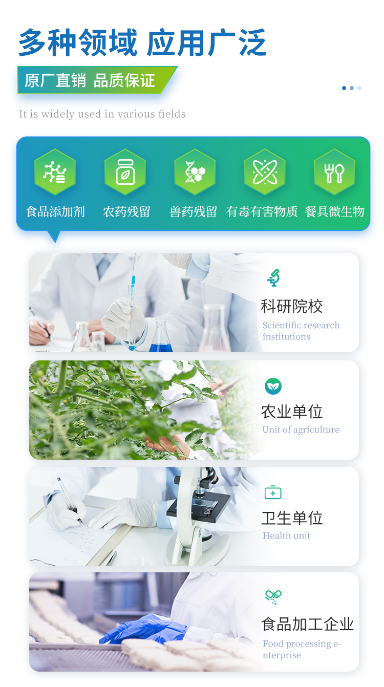 山東天研儀器有限公司生產(chǎn)的高智能食品安全檢測儀為集成化食品安全快速檢測分析設備,采用臺式一體化設計,可快速檢測200多種食品安全項目,包含非食用化學物質(zhì)、濫用食品添加劑、農(nóng)藥殘留、獸藥殘留、重金屬、病害肉、營養(yǎng)強化劑、抗生素類殘留、激素類殘留、真菌毒素類殘留、化學類殘留等項目的定性定量檢測。目前廣泛應用于市場監(jiān)管局、檢測中心、衛(wèi)生監(jiān)督部門、農(nóng)業(yè)部門、院校及各單位食堂、食品肉產(chǎn)品深加工企業(yè)、商超市場、司法部門、餐飲機構(gòu)、養(yǎng)殖場、屠宰場、檢驗檢疫部門等單位。