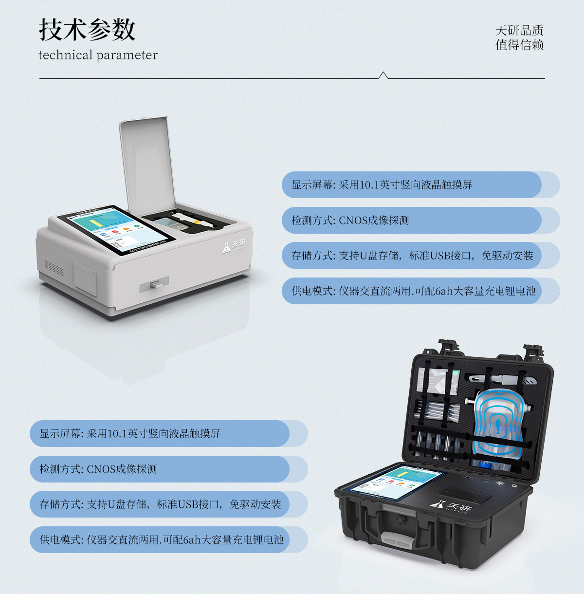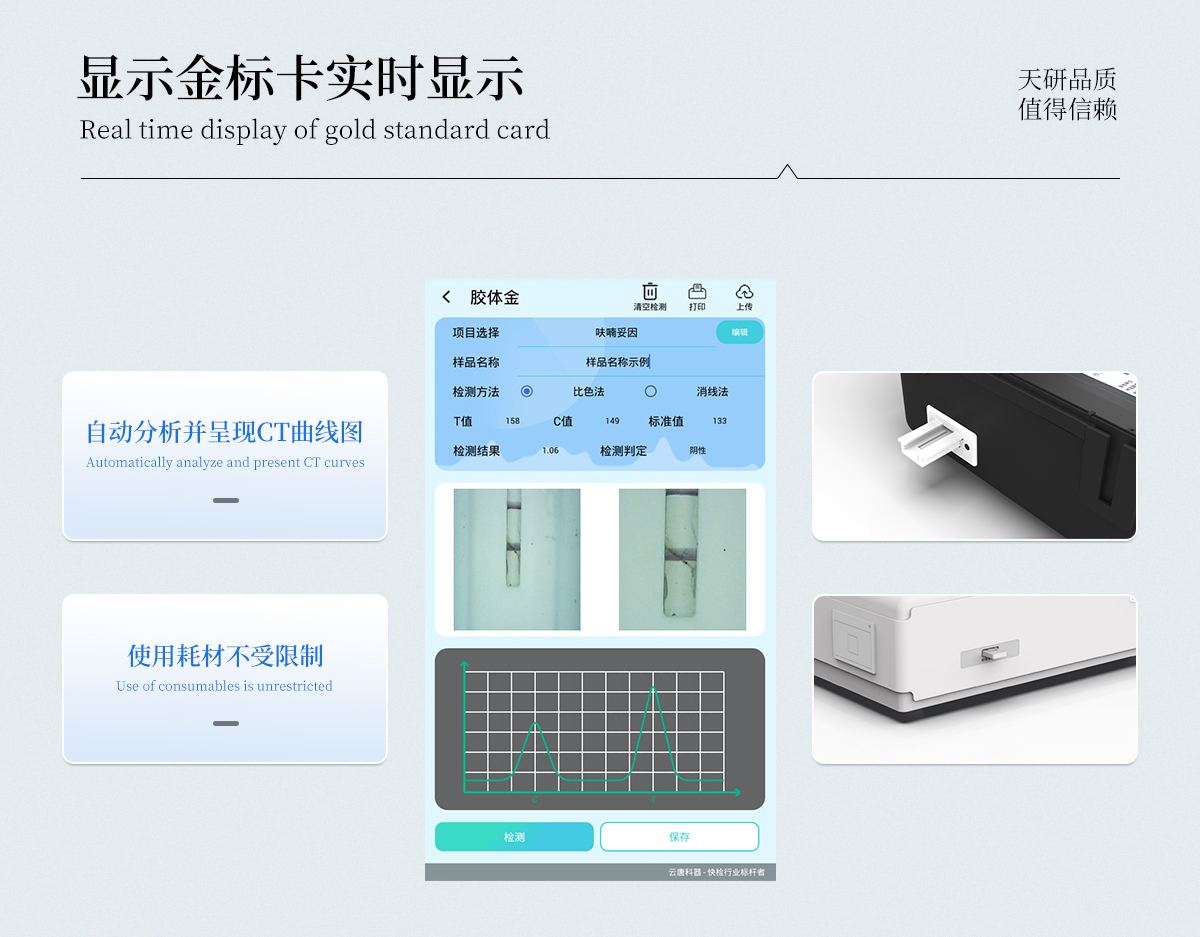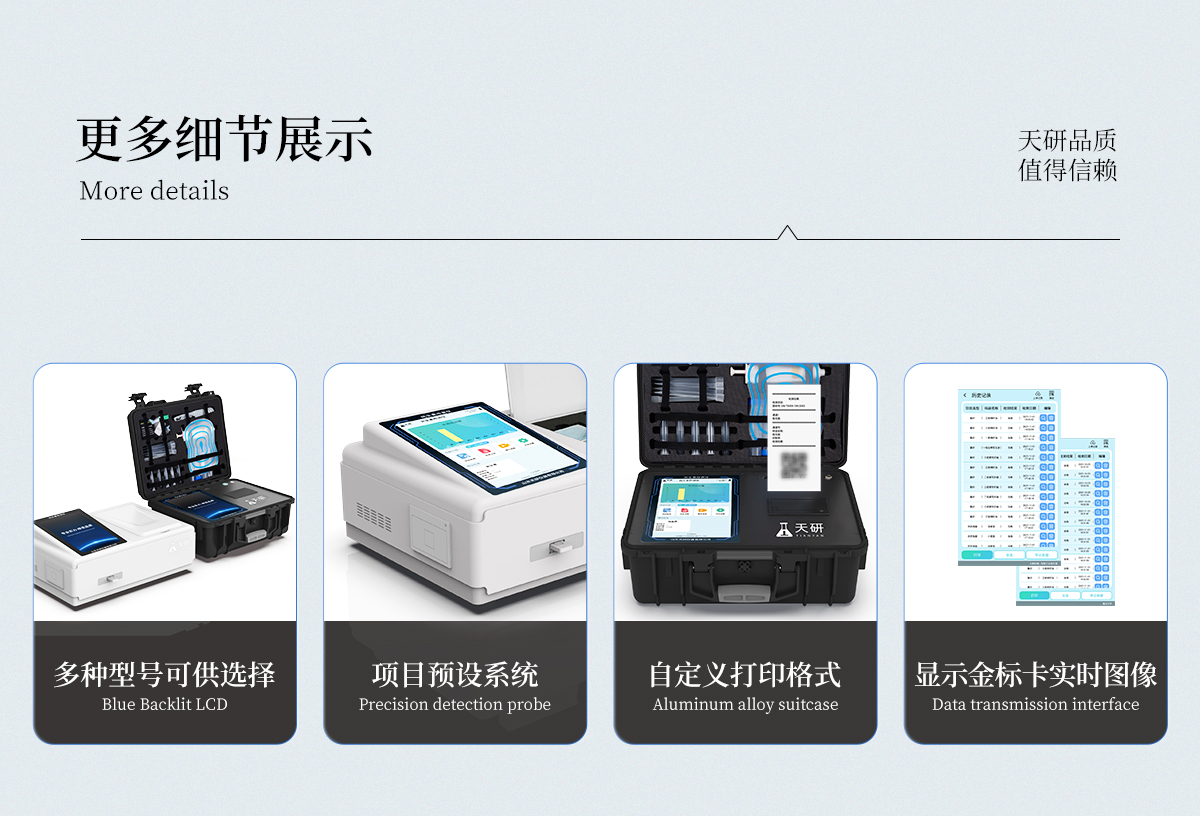 | 儀器采用手提一體化系統(tǒng)檢測技術(shù),將分光光度模塊、膠體金檢測模塊、新型農(nóng)殘檢測模塊、數(shù)字化管理模塊、無線通訊模塊高度集成于一體,支持檢測200種食品安全檢測項目,同時預(yù)留升級檢測方法。 | 儀器檢測模塊標(biāo)準(zhǔn)化、智能化,檢測項目可隨意自由組合。檢測箱體內(nèi)置多個標(biāo)準(zhǔn)檢測單元,檢測模塊可以調(diào)整配置。 | 顯示屏幕:儀器采用10.1英寸豎向液晶觸摸屏顯,搭配運行安卓智能操作系統(tǒng),主控芯片采用ARM Cortex-A7,RK3288/4核處理器,主頻1.88Ghz,操作方便,性能更強。 | 檢測通道:≥12通道;采用精密旋轉(zhuǎn)比色池設(shè)計,使用同芯片同光源校準(zhǔn)精度,解決不同光源之間的誤差值,更加準(zhǔn)確**。(1-12通道間誤差0.1%,**號:ZL202022821055.2) | 儀器光源:高精度進(jìn)口四波長冷光源,每個通道均配置 410、520、590、630nm 波長光源,標(biāo)配**的光路切換裝置,**光路切換功能可實現(xiàn)64波長,并且所有檢測項目可實現(xiàn)所有通道同時檢測。 | 設(shè)備可一鍵校準(zhǔn),自動保存校準(zhǔn)數(shù)據(jù),自動對比校驗,得到精準(zhǔn)光源,采用Android SP存儲數(shù)據(jù),光源數(shù)據(jù)永不丟失,方便每一次使用。 | 通訊接口:配備無線通信模塊、4G(APN)通訊模塊、藍(lán)牙傳輸,同時具有雙USB接口以及RJ45網(wǎng)線接口,可以多方式實現(xiàn)數(shù)據(jù)保存及數(shù)據(jù)傳輸。 | 存儲方式:支持U盤存儲,標(biāo)準(zhǔn)USB接口,免驅(qū)動安裝。檢測結(jié)果存儲容量20萬條以上,可生成Excel表格進(jìn)行拷貝,并具有登錄保護(hù)功能。 | 智能化操作系統(tǒng):: ★操作系統(tǒng):儀器可在同一檢測界面自動對應(yīng)相關(guān)檢測通道,一次性選擇1-12個樣品名稱,無需退出界面,節(jié)省操作時間。并可以對每個通道屬性和樣品信息單獨進(jìn)行編輯,例如送檢單位、人員,檢測人員等,打印時勾選打印顯示。 | ★數(shù)據(jù)集成系統(tǒng):設(shè)備首頁自動匯總分析檢測數(shù)據(jù),包含:周檢測數(shù)據(jù)、月檢測數(shù)據(jù),全部檢測總數(shù)量,均包含檢測總數(shù),合格數(shù),不合格數(shù),以及相關(guān)柱形分析圖,各項檢測數(shù)據(jù)一目了然,無需電腦查詢,更加快捷直觀。 | ★數(shù)據(jù)庫系統(tǒng):十幾項數(shù)據(jù)庫分類管理儀器:包含項目類型、項目數(shù)據(jù)、檢測數(shù)據(jù)、歷史記錄、國標(biāo)信息、曲線信息、采樣信息、檢測信息、受檢信息、復(fù)核信息、圖表信息、光源校準(zhǔn)信息、打印樣式信息、樣品庫信息等等,數(shù)據(jù)庫之間互相協(xié)調(diào)聯(lián)動保證數(shù)據(jù)的真實完整性。同時產(chǎn)品數(shù)據(jù)庫以及歷史檢測記錄支持一鍵檢索功能。 | ★限量規(guī)判系統(tǒng):具有限量查詢、添加物質(zhì)合規(guī)判定系統(tǒng)。檢測出結(jié)果后,系統(tǒng)自動調(diào)用系統(tǒng)數(shù)據(jù)庫中相關(guān)國標(biāo)進(jìn)行比對判定,客觀顯示判定結(jié)果是否合格 | ★項目預(yù)設(shè)系統(tǒng):儀器具有任務(wù)預(yù)設(shè)模塊,一鍵提前預(yù)設(shè),給出方便快捷的新檢測方案,每一個任務(wù)分別可以設(shè)置不同的樣品、批次、編號、來源、備注、抽樣信息、檢測信息、受檢信息、復(fù)核信息等更多信息。樣品送檢時一鍵調(diào)取保存信息,并可多次調(diào)取,大大提高檢測效率。 | ★數(shù)據(jù)監(jiān)管系統(tǒng):同步對接監(jiān)管平臺,數(shù)據(jù)可局域網(wǎng)和互聯(lián)網(wǎng)數(shù)據(jù)上傳,檢測結(jié)果可選擇直接傳至食品安全監(jiān)管平臺。進(jìn)行區(qū)域食品安全監(jiān)管及大數(shù)據(jù)分析處理與數(shù)據(jù)統(tǒng)計,檢測區(qū)域食品安全長短期動態(tài),達(dá)到食品安全問題預(yù)估、預(yù)警。 | ★打印系統(tǒng):內(nèi)置全新打印機(jī),新創(chuàng)自定義打印方式,可按需靈活勾選控制:產(chǎn)品合格證(國家農(nóng)業(yè)部標(biāo)準(zhǔn)要求),二維碼,抽樣信息、檢測信息,受檢信息、復(fù)核信息、抽樣日期、檢測日期等信息的打印。 | 供電模式:儀器交直流兩用,直流12V供電,可連接車載電源,可配6ah大容量充電鋰電池,電量可實時顯示,方便戶外流動測試。 | 膠體金檢測模塊:采用雙通道CMOS成像處理技術(shù)及膠體金免疫層析技術(shù),可同時讀取雙膠體金卡數(shù)據(jù),自動采集、處理分析,將檢測結(jié)果顯示,并可根據(jù)參考限值自動判斷檢測結(jié)果,可檢測常見的獸藥殘留、生物毒素、抗生素、違禁添加物等。 | ★探測技術(shù):CMOS成像探測; | ★檢測通道:1個通道; | ★檢測方式:消線法和比色法; | ★顯示模式:陰性或陽性; | 曲線形式:軌道式掃描方式,顯示金標(biāo)卡圖像,實時生成、識別CT曲線圖,無需手動調(diào)整,完成檢測后自動退出檢測卡。兼容市場上其他金標(biāo)卡,使用耗材不受限制。 | 儀器具備遠(yuǎn)程升級功能,可定向分客戶分儀器更新,開機(jī)后自動更新,并可持續(xù)性免費更新系統(tǒng)版本,無需像傳統(tǒng)產(chǎn)品返廠更新,節(jié)省時間及人力成本并避免了物流運輸返廠升級導(dǎo)致設(shè)備損壞的潛在風(fēng)險。 |