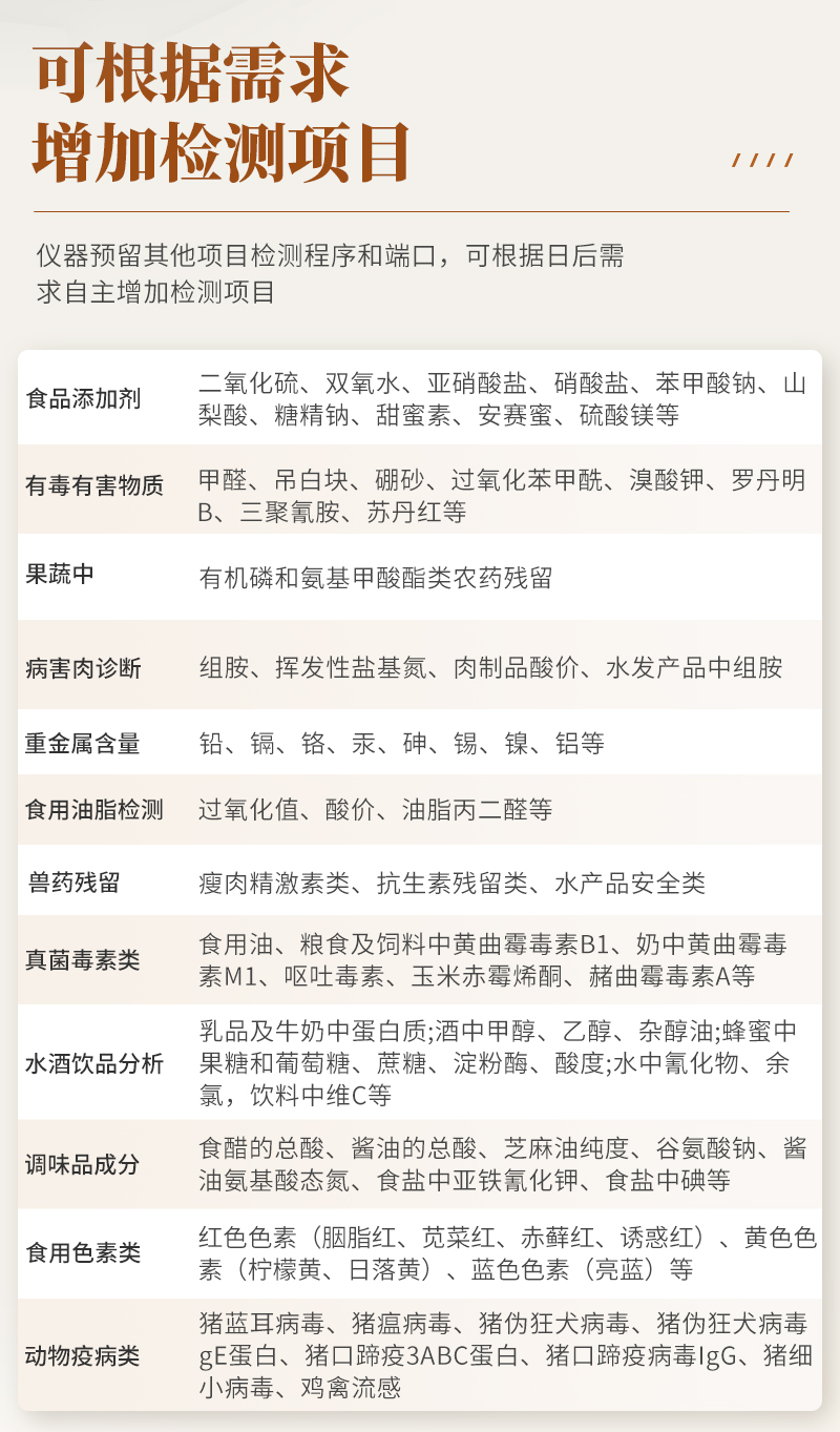 | 食品添加劑:二氧化硫、雙氧水、亞硝酸鹽、硝酸鹽、苯甲酸鈉、山梨酸鉀、糖精鈉、甜蜜素、木耳硫酸鎂等 | 有毒有害物質(zhì):甲醛、吊白塊、硼砂、過(guò)氧化苯甲酰、溴酸鉀、羅丹明B、三聚氰胺、蘇丹紅、工業(yè)堿、尿素、明礬等 | 食用油脂:過(guò)氧化值、酸價(jià)等 | 果蔬:農(nóng)藥殘留(酶抑制率法) | 病害肉:組胺、揮發(fā)性鹽基氮 | 重金屬含量:鉛、鎘、鉻、汞、砷、錫、鎳、鋁等 | 水酒飲品分析:酒中甲醇、乙醇、乳品及牛奶中蛋白質(zhì), | 蜂蜜成分:果糖和葡萄糖、蔗糖、淀粉酶、酸度等 | 調(diào)味品成分:食醋的總酸、醬油的總酸、芝麻油純度、谷氨酸鈉、醬油氨基酸態(tài)氮、食鹽中亞鐵氰化鉀、食鹽中碘等 | 食用色素類(lèi):紅色色素(胭脂紅、莧菜紅、莧菜紅)、黃色色素(檸檬黃、日落黃)、藍(lán)色色素(亮藍(lán))等 |