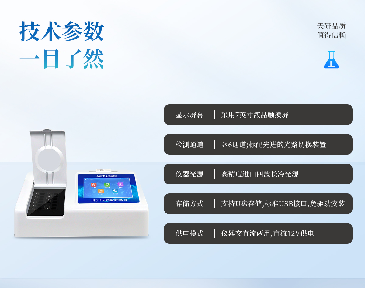 | 安卓智能操作系統(tǒng),采用更加**和人性化操作,儀器具有網(wǎng)線連接、wifi聯(lián)網(wǎng)上傳、GPRS無線遠傳功能,快速上傳數(shù)據(jù)。 | 智能化程度高,儀器具有自檢功能:具有開機自檢和調(diào)零功能,具有自動檢測重復(fù)性功能。 | 檢測通道:≥12個檢測通道,可以同時測試多個樣品,每個樣品由程序控制分別獨立工作,不會互相干擾。 | 顯示方式:≥8英寸液晶觸摸屏顯示,人性化中文操作界面,讀數(shù)直觀、簡單。 | 配備新一代嵌入式熱敏打印機,可選擇手動打印或者自動打印,檢測完成可自動打印檢測報告和二維碼。 | 光源采用進口超高亮發(fā)光二極管,高精度、穩(wěn)定性強、光源可控、可以關(guān)掉不使用的光源,功耗更低。 | 采用USB2.0接口設(shè)計,方便數(shù)據(jù)的存貯和移動,并可隨時與計算機直接相連,并且可用計算機控制儀器。實現(xiàn)數(shù)據(jù)查詢、瀏覽、分析、統(tǒng)計、打印等。 | 儀器帶有監(jiān)管平臺。數(shù)據(jù)可局域網(wǎng)和互聯(lián)網(wǎng)數(shù)據(jù)上傳,檢測結(jié)果直接傳至食品安全監(jiān)管平臺。進行區(qū)域食品安全監(jiān)管及大數(shù)據(jù)分析處理,檢測區(qū)域食品安全長短期動態(tài),達到食品安全問題預(yù)估、預(yù)警 | 一體化便攜式快檢設(shè)備,滿足現(xiàn)場及流動檢測使用需求,能夠在同一軟件下實現(xiàn)所有檢測項目的檢測,并可通過同一窗口直觀顯示檢測結(jié)果。 | 儀器具有多品類多種類樣品菜單庫,可靈活選擇檢測樣品,不同的檢測通道可同時檢測不同的樣品項目。也可在儀器上直接編輯錄入樣品名稱、檢測指標(biāo)、送檢單位等信息并保存進樣品數(shù)據(jù)庫。 | 樣品處理簡單省力,整體操作快速、安全、便捷。 | 儀器具有自身保護功能,可設(shè)置用戶名及密碼,防止非工作人員操作等。 | 高靈敏度,高檢測精度,高重復(fù)性精度,掃描式高精度光學(xué)傳感器。 | 儀器具有重新校準(zhǔn)、鎖定、恢復(fù)出廠設(shè)置功能。 | 支持U盤存儲。 結(jié)果判定線可修改,對照值標(biāo)定值可保存,斷電不丟失數(shù)據(jù)。 |