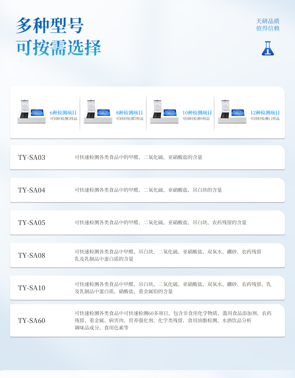 產(chǎn)品介紹: 多功能食品安全檢測儀可快速檢測200多項目,包含非食用化學(xué)物質(zhì)、濫用食品添加劑、農(nóng)藥殘留、獸藥殘留、重金屬、病害肉、營養(yǎng)強化劑、抗生素類殘留、激素類殘留、真菌毒素類殘留、化學(xué)類殘留等現(xiàn)場的定性定量檢測。該多功能食品安全檢測儀為集成化食品安全快速檢測分析設(shè)備,廣泛應(yīng)用于市場
