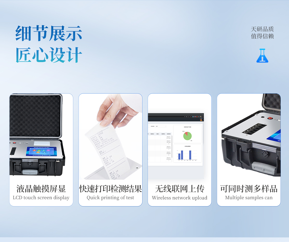 | 安卓智能操作系統(tǒng),采用更加**的UI交互界面,儀器具有wifi聯(lián)網(wǎng)上傳、4G聯(lián)網(wǎng)傳輸、GPRS無線遠(yuǎn)傳、網(wǎng)線連接功能,快速批量上傳數(shù)據(jù)。 | 智能化程度高,儀器具有自檢功能:具有開機(jī)自檢和調(diào)零功能,具有自動(dòng)檢測(cè)重復(fù)性功能。 | 新一代高速熱敏打印機(jī),檢測(cè)完成可自動(dòng)打印或批量打印檢測(cè)報(bào)告和二維碼。 | 儀器帶有監(jiān)管平臺(tái),數(shù)據(jù)可局域網(wǎng)和互聯(lián)網(wǎng)數(shù)據(jù)上傳,檢測(cè)結(jié)果直接傳至食品安全監(jiān)管平臺(tái)。進(jìn)行區(qū)域食品安全監(jiān)管及大數(shù)據(jù)分析處理與數(shù)據(jù)統(tǒng)計(jì),檢測(cè)區(qū)域食品安全長(zhǎng)短期動(dòng)態(tài),達(dá)到食品安全問題預(yù)估、預(yù)警 | 一體化主機(jī),包含食品安全檢測(cè)模塊、多通道農(nóng)藥殘留檢測(cè)模塊、膠體金免疫層析檢測(cè)模塊。 | 一體化便攜式快檢設(shè)備,滿足現(xiàn)場(chǎng)及流動(dòng)檢測(cè)使用需求,能夠在同一軟件下實(shí)現(xiàn)所有檢測(cè)項(xiàng)目的檢測(cè),并可通過同一窗口直觀顯示檢測(cè)結(jié)果。 | 膠體金模塊檢測(cè)方式:軌道式自動(dòng)傳輸掃描,檢測(cè)完成后自動(dòng)退出檢測(cè)卡。 | CT線自動(dòng)識(shí)別,無需手動(dòng)調(diào)整。 | 內(nèi)置強(qiáng)大的數(shù)據(jù)庫,具有多品類多種類樣品菜單功能,可靈活選擇檢測(cè)樣品,不同的檢測(cè)通道可同時(shí)檢測(cè)不同的樣品項(xiàng)目。也可在儀器上直接編輯錄入樣品名稱、檢測(cè)指標(biāo)、送檢單位等信息并保存進(jìn)樣品數(shù)據(jù)庫。 | 產(chǎn)品內(nèi)置操作演示視頻,是您身邊的化驗(yàn)指導(dǎo)專家。 | 樣品處理簡(jiǎn)單省力,整體操作快速、安全、便捷。 | 儀器具有自身保護(hù)功能,可設(shè)置用戶名及密碼,防止非工作人員操作等。 | 高靈敏度,高檢測(cè)精度,高重復(fù)性精度,掃描式高精度光學(xué)傳感器。 | 結(jié)果判定線可修改,對(duì)照值標(biāo)定值可保存,斷電不丟失數(shù)據(jù)。 | 兼容市場(chǎng)上所有的膠體金卡,使用耗材不受限制,極大增強(qiáng)用戶使用體驗(yàn)。 | 儀器具有重新校準(zhǔn)、鎖定、恢復(fù)出廠設(shè)置功能。 |
