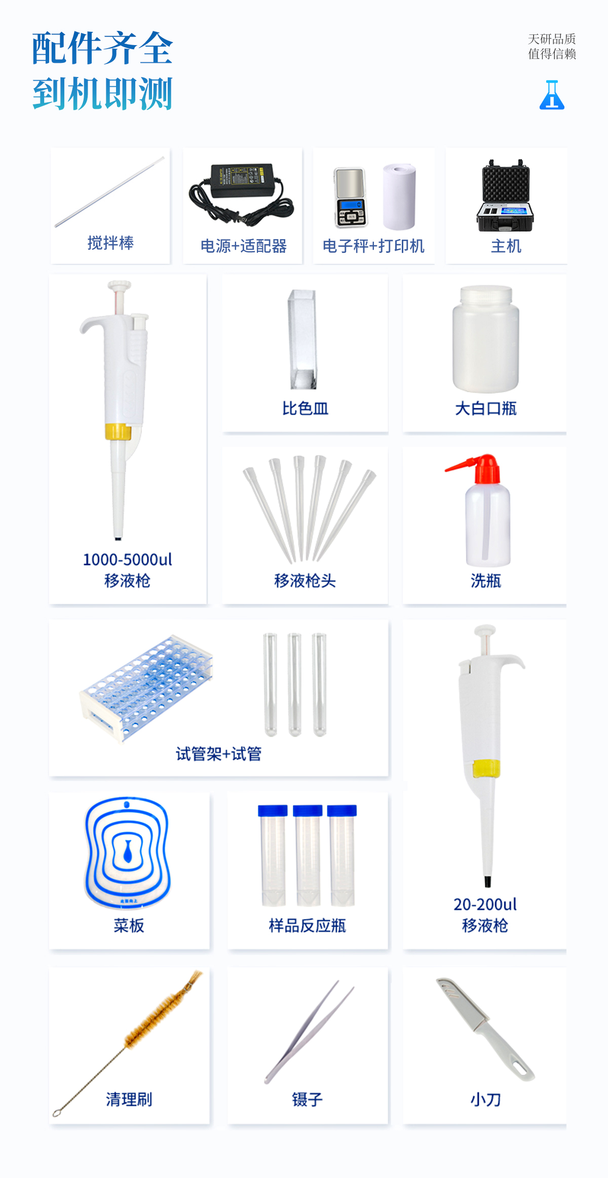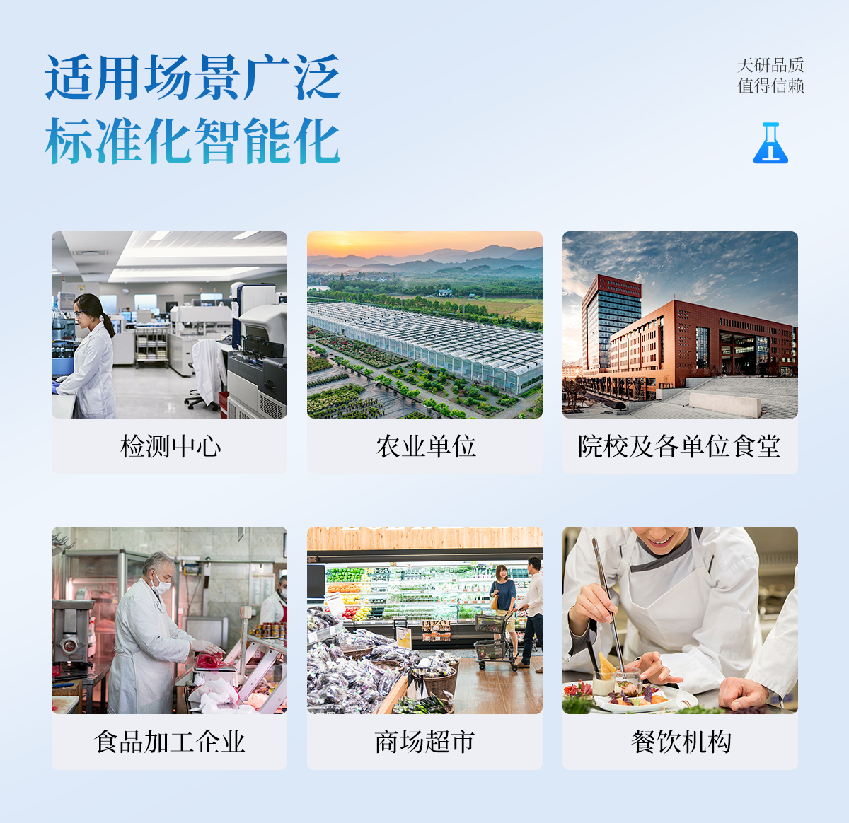 | 食品添加劑:二氧化硫、雙氧水、亞硝酸鹽、硝酸鹽、苯甲酸鈉、山梨酸、糖精鈉、甜蜜素、安賽蜜、硫酸鎂等 | 有毒有害物質(zhì):甲醛、吊白塊、硼砂、過氧化苯甲酰、溴酸鉀、羅丹明B、三聚氰胺、蘇丹紅等 | 果蔬中:有機(jī)磷和氨基甲酸酯類農(nóng)藥殘留; | 病害肉診斷:組胺、揮發(fā)性鹽基氮、肉制品酸價(jià)、水發(fā)產(chǎn)品中組胺 | 重金屬含量:鉛、鎘、鉻、汞、砷、錫、鎳、鋁等;食用油脂檢測(cè):過氧化值、酸價(jià)、油脂丙二醛等。 | 瘦肉精激素類(獸藥):鹽酸克倫特羅、沙丁胺醇、萊克多巴胺、己烯雌酚、喹乙醇等 | 抗生素殘留類(獸藥):四環(huán)素類、硝基呋喃類、磺胺類、沙星類、喹諾酮類、慶大霉素、鏈霉素、阿莫西林、紅霉素等 | 水產(chǎn)品安全類:孔雀石綠、氯霉素、呋喃妥因代謝、呋喃西林代謝、呋喃它酮代謝、呋喃唑酮代謝等 | 真菌毒素類:食用油、糧食及飼料中黃曲霉毒素B1、奶中黃曲霉毒素M1、嘔吐毒素、玉米赤霉烯酮、赭曲霉毒素A等 | 水酒飲品分析:乳品及牛奶中蛋白質(zhì);酒中甲醇、乙醇、雜醇油;蜂蜜中果糖和葡萄糖、蔗糖、淀粉酶、酸度;水中氰化物、余氯,飲料中維C等 | 調(diào)味品成分:食醋的總酸、醬油的總酸、芝麻油純度、谷氨酸鈉、醬油氨基酸態(tài)氮、食鹽中亞鐵氰化鉀、食鹽中碘等 | 食用色素類:紅色色素(胭脂紅、莧菜紅、赤蘚紅、誘惑紅)、黃色色素(檸檬黃、日落黃)、藍(lán)色色素(亮藍(lán))等 | 動(dòng)物疫病類:豬藍(lán)耳病毒、豬瘟病毒、豬偽狂犬病毒、豬偽狂犬病毒gE蛋白、豬口蹄疫3ABC蛋白、豬口蹄疫病毒IgG、豬細(xì)小病毒、雞禽流感等 |