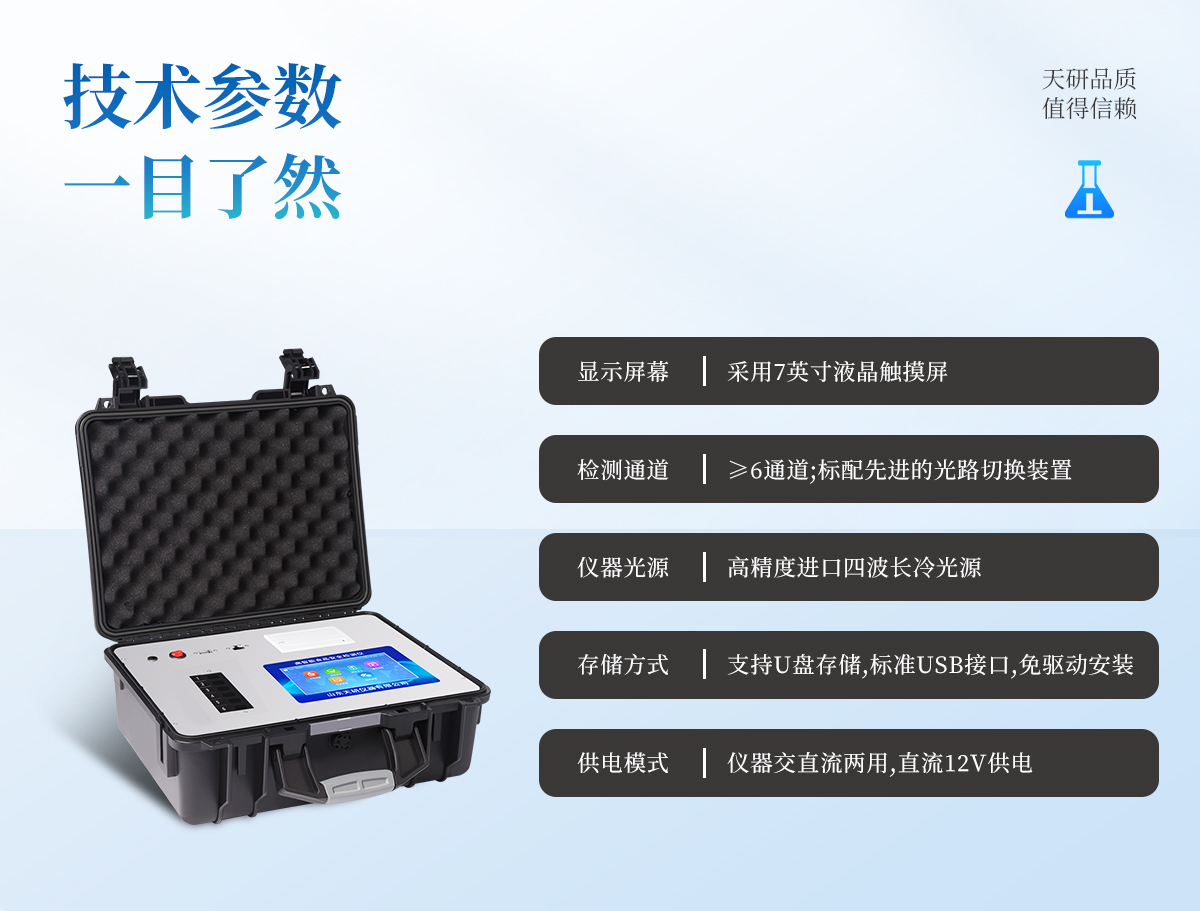 | 主控芯片采用ARM Cortex-A7,RK3288/4核處理器,主頻1.88Ghz,運(yùn)轉(zhuǎn)速度更快速,穩(wěn)定性更強(qiáng)。 | 顯示方式:7英寸液晶觸摸屏顯示,人性化中文操作界面,讀數(shù)直觀、簡(jiǎn)單。 | 交直流兩用,直流12V供電,可連接車載電源,可配6ah大容量充電鋰電池,方便戶外流動(dòng)測(cè)試。 | 四波長(zhǎng)冷光源,6個(gè)檢測(cè)通道,每個(gè)通道均配置410、520、590、630nm波長(zhǎng)光源,標(biāo)配**的光路切換裝置,專業(yè)光路切換功能可實(shí)現(xiàn)最多64波長(zhǎng),并且所有檢測(cè)項(xiàng)目可實(shí)現(xiàn)所有通道同時(shí)檢測(cè)。 | 智能恒流穩(wěn)壓,光強(qiáng)自動(dòng)調(diào)節(jié)與校準(zhǔn),長(zhǎng)時(shí)間連續(xù)工作光源無溫漂現(xiàn)象。 | 內(nèi)置新國(guó)家限量標(biāo)準(zhǔn),與所測(cè)結(jié)果進(jìn)行現(xiàn)場(chǎng)比對(duì),并持續(xù)更新標(biāo)準(zhǔn)。 | 不間斷進(jìn)樣,連續(xù)檢測(cè) | 樣本編號(hào)自動(dòng)累加。 | 數(shù)據(jù)無線上傳平臺(tái),并可從平臺(tái)導(dǎo)出為Excel表格。 | 檢測(cè)結(jié)果存儲(chǔ)容量20萬條 | 同時(shí)支持U盤拷貝,標(biāo)準(zhǔn)USB接口,免驅(qū)動(dòng)插拔。 | 檢測(cè)項(xiàng)目可擴(kuò)充,固件可升級(jí) | 儀器尺寸:43×35×19cm, 主機(jī)凈重:5.1kg |