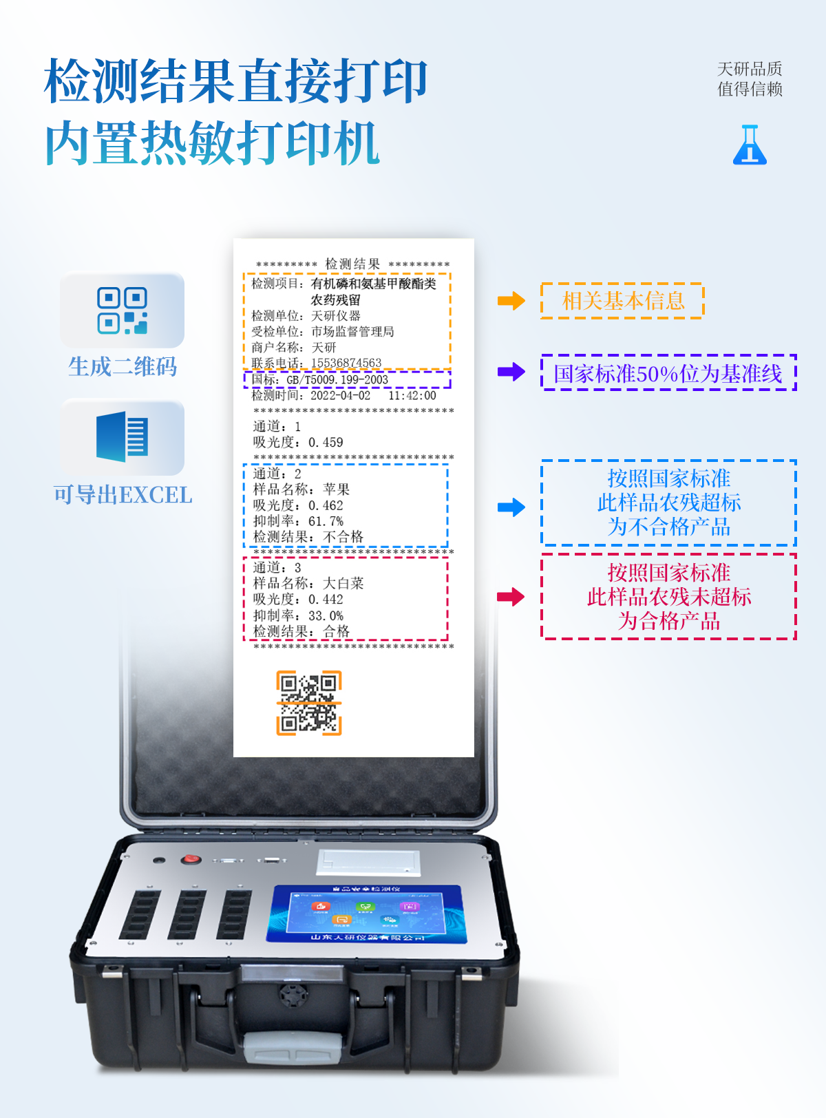 | 安卓智能操作系統(tǒng),采用更加**的UI交互界面,儀器具有wifi聯(lián)網(wǎng)上傳、4G聯(lián)網(wǎng)傳輸、GPRS無線遠(yuǎn)傳、網(wǎng)線連接功能,快速批量上傳數(shù)據(jù)。 | 智能化程度高,儀器具有自檢功能:具有開機自檢和調(diào)零功能,具有自動檢測重復(fù)性功能。 | 新一代高速熱敏打印機,檢測完成可自動打印或批量打印檢測報告和二維碼。 | 儀器帶有監(jiān)管平臺,數(shù)據(jù)可局域網(wǎng)和互聯(lián)網(wǎng)數(shù)據(jù)上傳,檢測結(jié)果直接傳至食品安全監(jiān)管平臺。進行區(qū)域食品安全監(jiān)管及大數(shù)據(jù)分析處理與數(shù)據(jù)統(tǒng)計,檢測區(qū)域食品安全長短期動態(tài),達(dá)到食品安全問題預(yù)估、預(yù)警 | 一體化主機,包含食品安全檢測模塊、多通道農(nóng)藥殘留檢測模塊、膠體金免疫層析檢測模塊。 | 一體化便攜式快檢設(shè)備,滿足現(xiàn)場及流動檢測使用需求,能夠在同一軟件下實現(xiàn)所有檢測項目的檢測,并可通過同一窗口直觀顯示檢測結(jié)果。 | 膠體金模塊檢測方式:軌道式自動傳輸掃描,檢測完成后自動退出檢測卡。 | CT線自動識別,無需手動調(diào)整。 | 內(nèi)置強大的數(shù)據(jù)庫,具有多品類多種類樣品菜單功能,可靈活選擇檢測樣品,不同的檢測通道可同時檢測不同的樣品項目。也可在儀器上直接編輯錄入樣品名稱、檢測指標(biāo)、送檢單位等信息并保存進樣品數(shù)據(jù)庫。 | 產(chǎn)品內(nèi)置操作演示視頻,是您身邊的化驗指導(dǎo)專家。 | 樣品處理簡單省力,整體操作快速、安全、便捷。 | 儀器具有自身保護功能,可設(shè)置用戶名及密碼,防止非工作人員操作等。 | 高靈敏度,高檢測精度,高重復(fù)性精度,掃描式高精度光學(xué)傳感器。 | 結(jié)果判定線可修改,對照值標(biāo)定值可保存,斷電不丟失數(shù)據(jù)。 | 兼容市場上所有的膠體金卡,使用耗材不受限制,極大增強用戶使用體驗。 | 儀器具有重新校準(zhǔn)、鎖定、恢復(fù)出廠設(shè)置功能。 |
