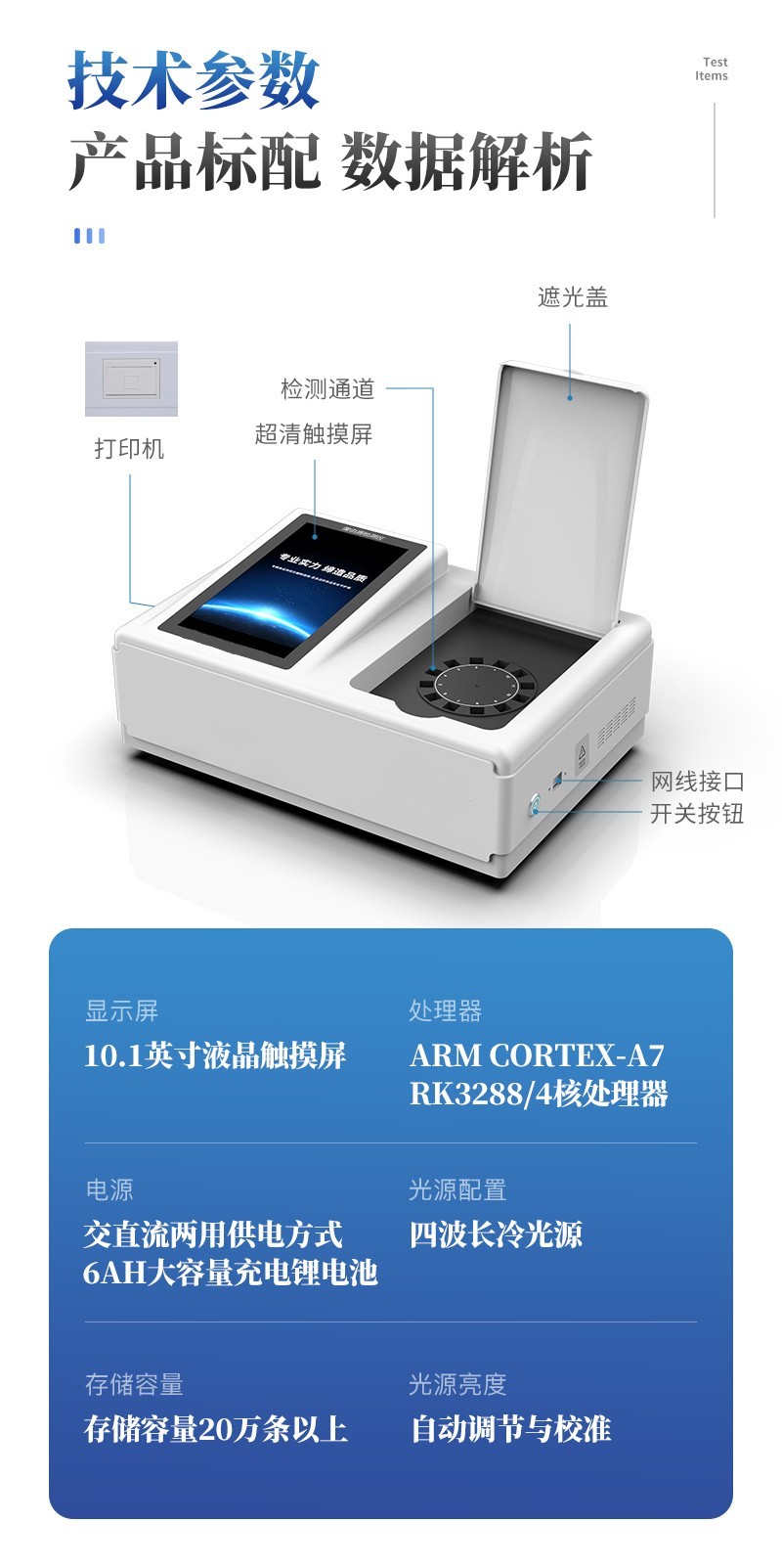 | 儀器采用臺式一體化系統(tǒng)檢測技術(shù),將分光光度模塊、新型農(nóng)殘檢測模塊、數(shù)字化管理模塊、無線通訊模塊高度集成于一體,支持檢測200種食品安全檢測項目,同時預(yù)留升級檢測方法。 | 儀器檢測模塊標準化、智能化,可隨意自由組合。檢測箱體內(nèi)置多個標準檢測單元,檢測模塊可以調(diào)整配置。 | 儀器采用全新安卓智能系統(tǒng),主控芯片采用 ARM Cortex-A7,RK3288/4核處理器,10.1寸高清液晶觸摸豎屏,更加**的UI交互界面,運轉(zhuǎn)快捷;儀器配備無線通信模塊: 4G(APN)通訊模塊、Wifi模塊,藍牙傳輸,同時具有雙USB接口以及RJ45接口能以多種方式實現(xiàn)數(shù)據(jù)保存和數(shù)據(jù)傳輸功能。 | 創(chuàng)新檢測模式: | ★檢測通道:≥12通道;采用精密旋轉(zhuǎn)比色池設(shè)計,使用同芯片同光源校準精度,解決不同光源之間的誤差值。1-12通道間誤差0.1%。(**號:ZL202022821055.2) | ★儀器具有自動識別比色皿檢測功能,即:將樣品比色皿放入儀器后,點擊樣品檢測,儀器自動識別比色皿進行通道檢測。 | 進口高精光源: | 高精度進口四波長冷光源,通道配置 410、520、590、630nm 波長光源,一個光源芯片驅(qū)動一個光源,誤差極小,每臺設(shè)備單獨**校準光源,**比對,同時參照四種不同波段光源全方位覆蓋市面上99%的農(nóng)殘食品項目檢測。 | 智能化操作系統(tǒng): | 便捷操作系統(tǒng):設(shè)備檢測時可在同一檢測界面自動對應(yīng)相關(guān)檢測通道一次性選擇1-12個樣品名稱,無須退出界面,節(jié)省操作時間。 | 數(shù)據(jù)集成系統(tǒng):設(shè)備首頁自動統(tǒng)計檢測數(shù)據(jù)包含:周檢測數(shù)據(jù)、月檢測數(shù)據(jù),全部檢測總數(shù)量,均包含檢測總數(shù),合格數(shù),不合格數(shù),以及相關(guān)柱形分析圖,對各項檢測數(shù)據(jù)清晰掌握,無需電腦查詢,更加快捷直觀。 | 項目預(yù)設(shè)系統(tǒng):支持添加單個及多個相同或不相同的任務(wù)預(yù)設(shè),一鍵快速調(diào)取,每一個任務(wù)分別可以設(shè)置不同的樣品、批次、編號、來源、備注、抽樣信息、檢測信息、受檢信息、復(fù)核信息等更多信息。無縫鏈接平臺和APP實時查看下發(fā)任務(wù)。 | 數(shù)據(jù)監(jiān)管系統(tǒng):同步對接監(jiān)管平臺,數(shù)據(jù)可局域網(wǎng)和互聯(lián)網(wǎng)數(shù)據(jù)上傳,檢測結(jié)果可選擇直接傳至食品安全監(jiān)管平臺。集成OSS輸出存儲服務(wù)、區(qū)分設(shè)備定向管理應(yīng)用,進行區(qū)域食品安全監(jiān)管及大數(shù)據(jù)分析處理與數(shù)據(jù)統(tǒng)計,檢測區(qū)域食品安全長短期動態(tài),達到食品安全問題預(yù)估、預(yù)警。 | 自定義打印系統(tǒng):內(nèi)置全新打印系統(tǒng),新創(chuàng)自定義打印方式,可按需靈活設(shè)置開啟或關(guān)閉:產(chǎn)品合格證(國家農(nóng)業(yè)部標準要求),二維碼,抽樣信息、檢測信息,受檢信息、復(fù)核信息、抽樣日期、檢測日期等信息的打印。 | 系統(tǒng)遠程更新功能:可定向分客戶分儀器更新系統(tǒng),按照不同客戶后期實際需求添加項目,無需機器返廠,即可遠程實時升級全新系統(tǒng),節(jié)省時間成本及避免運輸造成設(shè)備損壞。 | 儀器主機采用一體化防水、抗壓、防撞擊、防腐蝕箱體設(shè)計,同時配備交直流供電,可連接車載電源,可選配大容量充電鋰電池,滿足現(xiàn)場野外檢測需求。 | 安全證書,放心保障:儀器具有中國計量科學(xué)研究院校準證書,**認證。 |