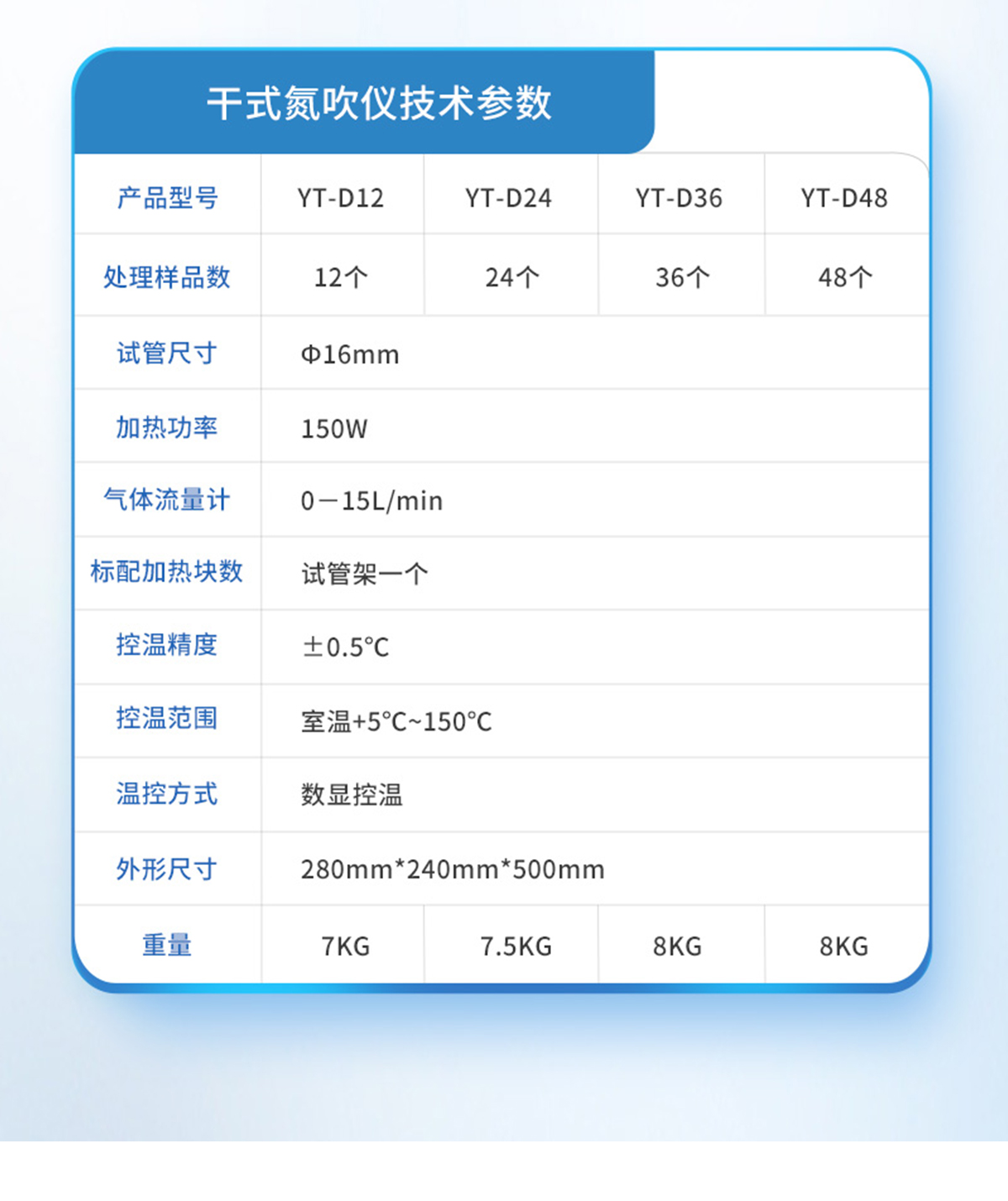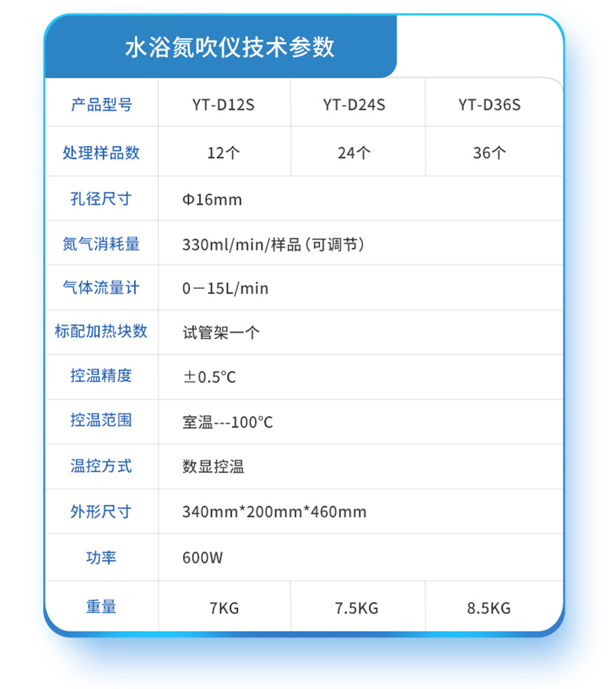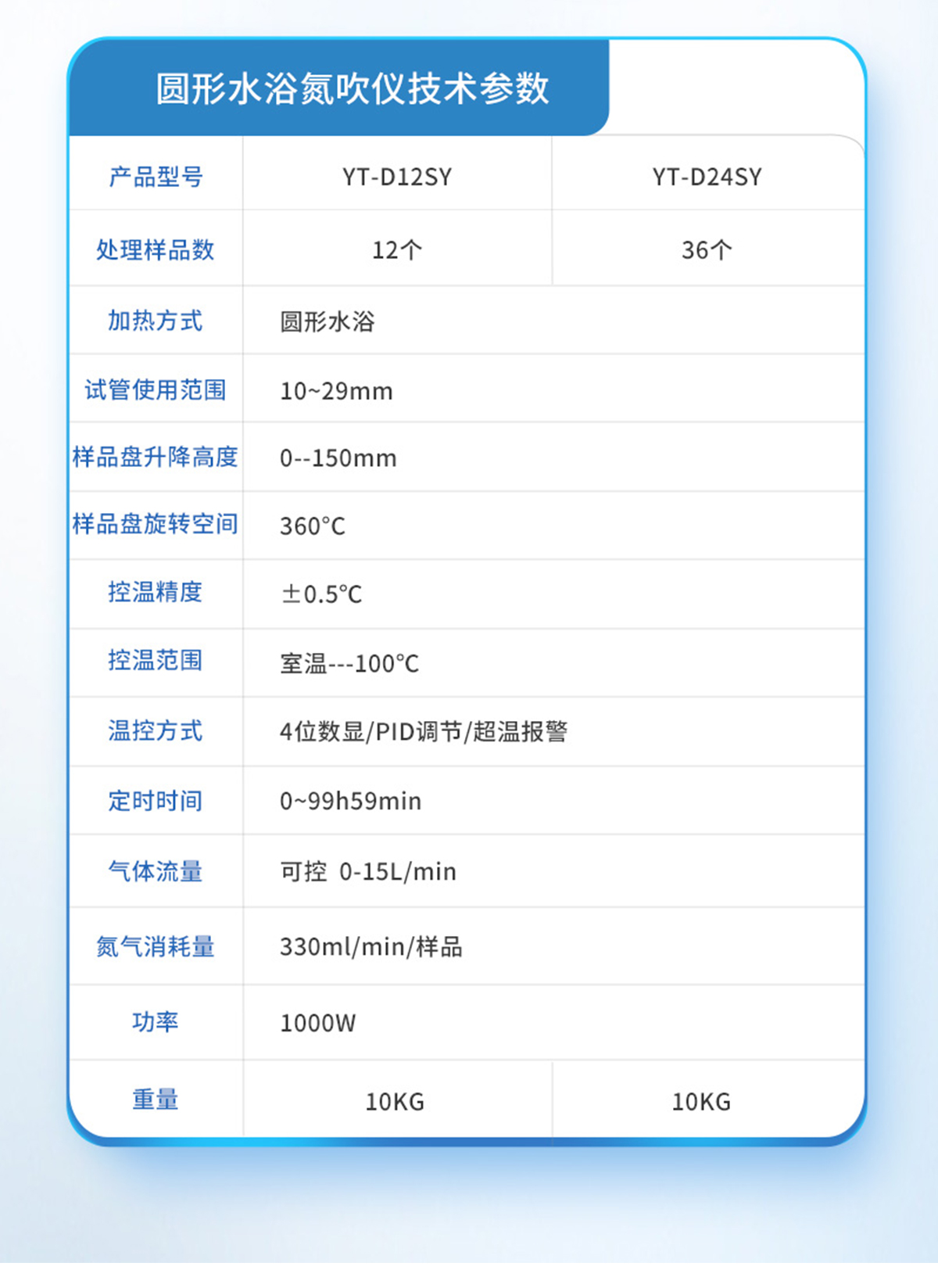 | YT-D12SY | 12個獨立控制 | 圓形水浴 | 10~29mm | 0--150mm | 360°C | ±0.5℃ | 室溫---100℃ | 4位數(shù)顯/PID調節(jié)/超溫報警 | 0~99h59min | 可控 0-15L/min | 330ml/min/樣品 | 1000W | 10KG |