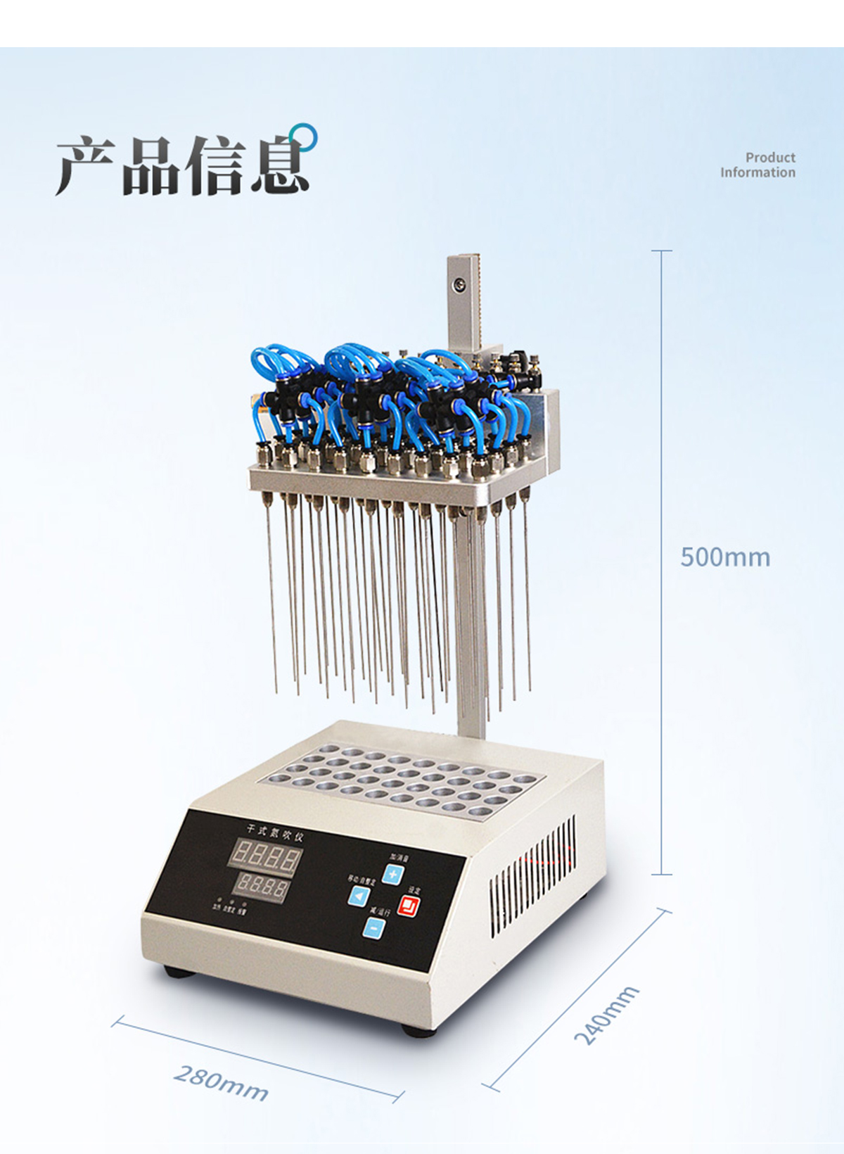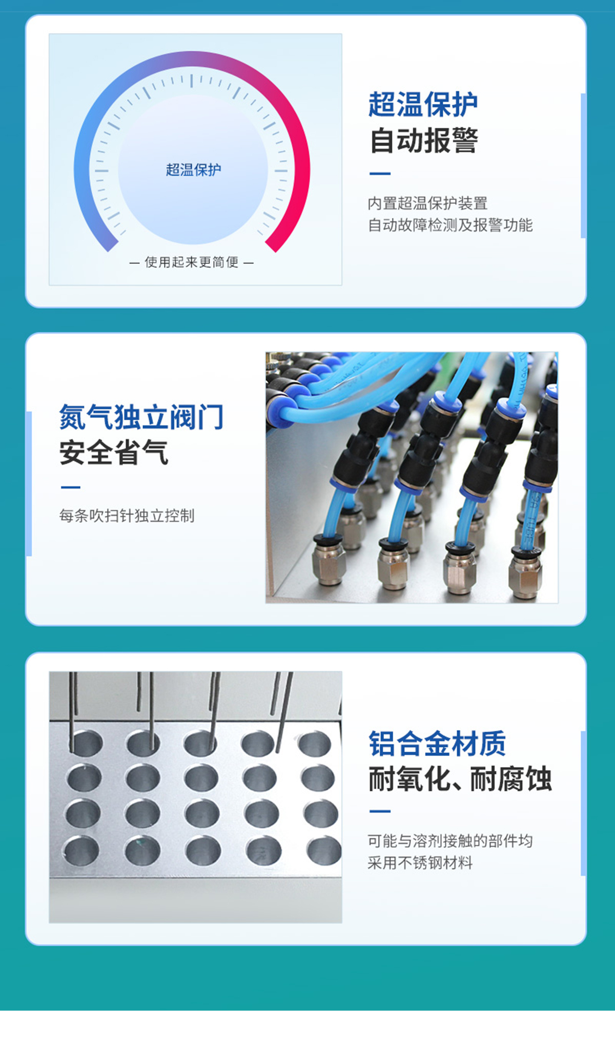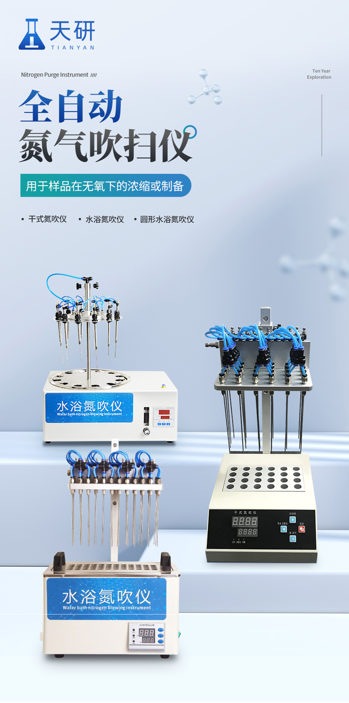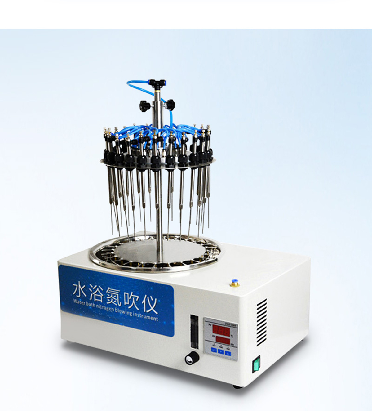 12位 圓形水浴氮氣吹干儀 氮氣吹掃裝置360度旋轉自由升降 產(chǎn)品說明: 圓形水浴氮吹儀利用吹掃捕集技術,同時可對樣品進行控溫加熱,通過氮氣等惰性氣體快速、可控、連續(xù)地吹到樣品表面來達到樣品溶液快速無氧濃縮。該方法具有省時、便捷、準確的特點。廣泛用于食品安全、醫(yī)藥、農藥殘留檢測、臨床