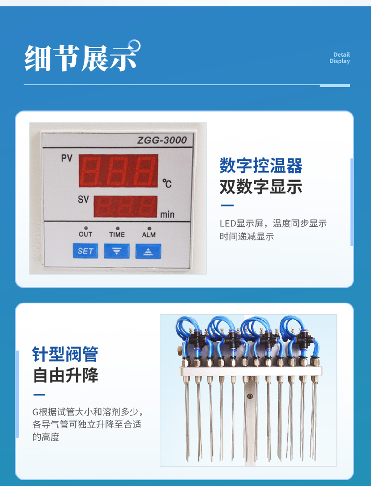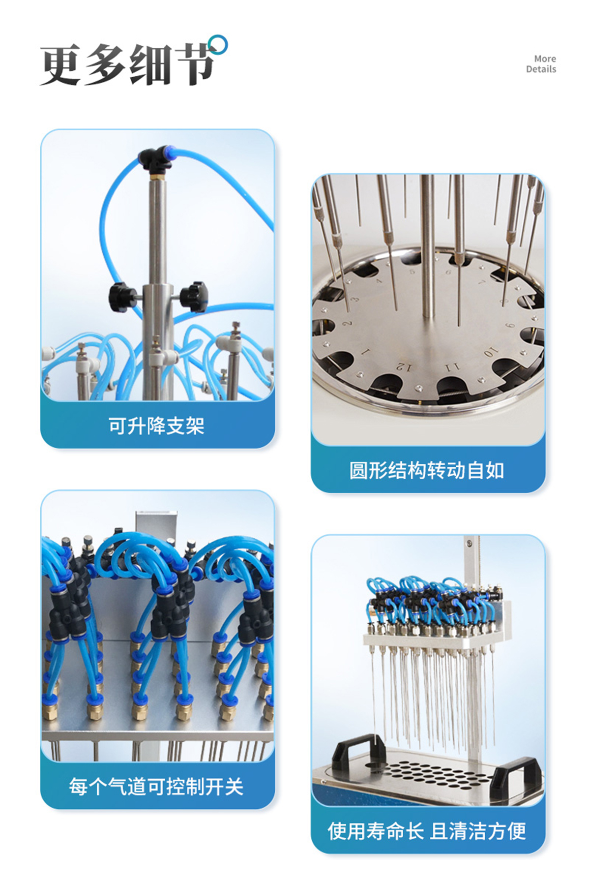 | 圓形水浴氮吹儀適用于試管、錐形瓶、離心管等不同規(guī)格的容器。 | 樣品位數(shù):12位/24位,彈簧試管夾的樣品架固定定位,每個樣品都有數(shù)字編號。 | 試管通過帶彈簧的試管夾和支撐盤來固定位置,可任意調節(jié)高度方向。 | 自由升降的針型閥管,根據(jù)試管大小和溶劑多少,各導氣管可獨立升降至合適的高度,同時可調的針型閥能管控制氣體流量。 | 圓形結構,轉動自如,方便樣品支架進出水浴,操作方便。 | 智能數(shù)字溫控器,可定時,雙數(shù)字顯示,調節(jié)采用PID技術并可實現(xiàn)超溫報警及防干燒。 | 圓形氮吹儀的所有部件均勻不銹鋼制造,可耐酸堿等有機溶劑。 | 調節(jié)閥:保證良好的氣密性,經(jīng)久耐用。 | 在濃縮有毒溶劑時,整個系統(tǒng)可置于通風柜中。 |