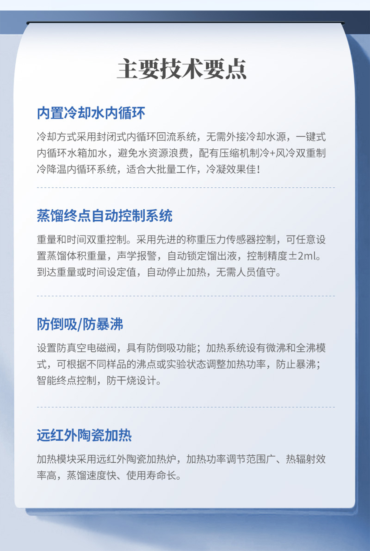 該儀器實(shí)驗(yàn)了控溫、自動(dòng)防倒吸、加熱均勻、防止暴沸、智能終點(diǎn)控制等功能。使用方便,節(jié)能環(huán)保。經(jīng)過實(shí)驗(yàn)室蒸餾回收率比對驗(yàn)證,結(jié)果準(zhǔn)確,回收率達(dá)95%以上。該儀器可廣泛適用于環(huán)保、疾控、水產(chǎn)、供排水、高校、科研院所、廠礦企業(yè)等各類化學(xué)實(shí)驗(yàn)室需要蒸餾處理的場所,如揮發(fā)酚、氨氮、凱氏氮油中水分等項(xiàng)目的蒸餾處理。
