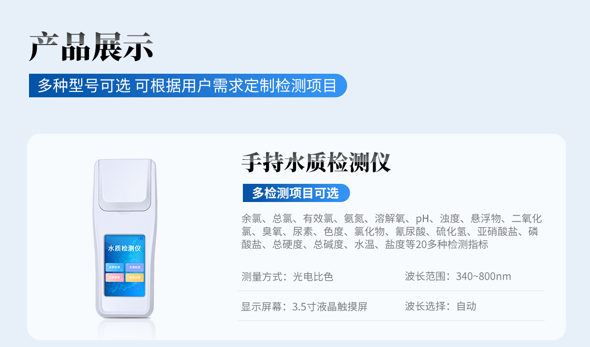 | PH、溶解氧、氨氮、亞硝酸鹽、總堿度、硫化氫、鹽度、磷酸鹽、總硬度、水溫、余氯、檢測指標等 | 安卓智能系統(tǒng)操作更佳簡便快捷 | 內(nèi)置操作流程、操作簡單、無需培訓(xùn)、直接上手 | 檢測速度快,現(xiàn)場讀取數(shù)據(jù) | 便攜式體積小,重量輕,方便戶外檢測 | 外形小巧美觀,工作穩(wěn)定免維護,具有較好的性價比 | 采用進口冷光源,光學性能穩(wěn)定,壽命長達10萬小時 |