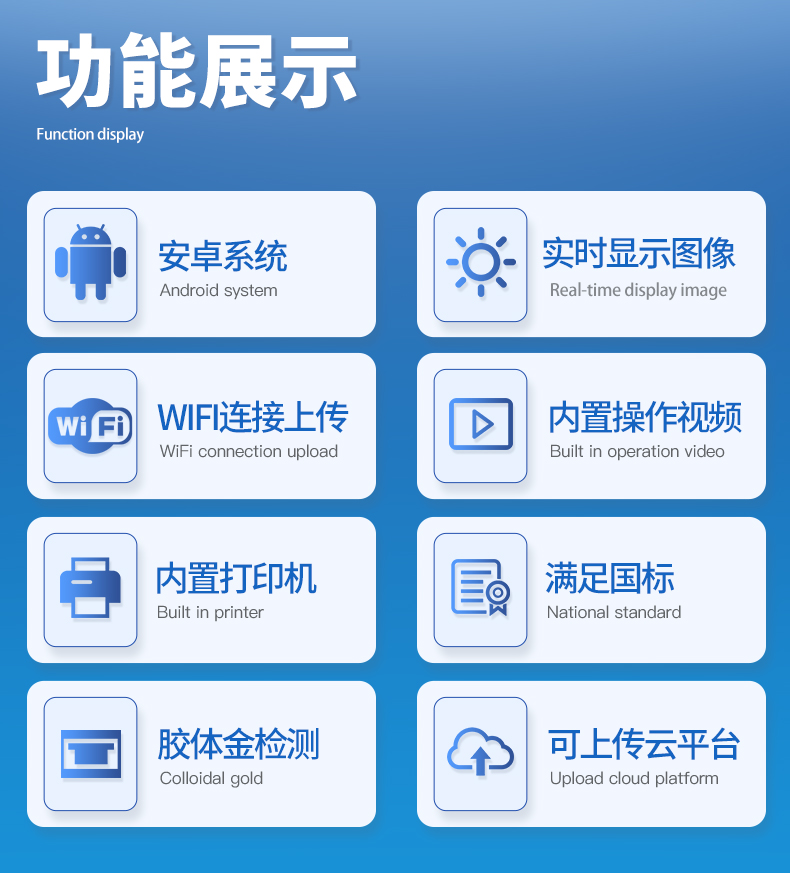 | 儀器采用10.1英寸液晶觸摸屏顯,搭配運行安卓智能操作系統(tǒng),主控芯片采用ARM Cortex-A7,RK3288/4核處理器,主頻1.88Ghz,運轉(zhuǎn)速度更快速,性能更強。 | 儀器功能包括:膠體金檢測模塊、數(shù)字化管理模塊、無線通訊模塊等,可以滿足同一軟件下實現(xiàn)所有檢測項目的檢測,并在同一窗口展示檢測結(jié)果。 | 一體化便攜式快檢設(shè)備,采用交直流兩用供電方式,可連接車載電源,配備6ah大容量充電鋰電池,可以滿足現(xiàn)場及流動檢測使用的需求。儀器尺寸:43×35×20cm, 主機凈重:5.1kg | 系統(tǒng)自帶數(shù)據(jù)集成模塊,設(shè)備首頁自動統(tǒng)計檢測數(shù)據(jù)包含:周檢測數(shù)據(jù)、月檢測數(shù)據(jù),全部檢測總數(shù)量,均包含檢測總數(shù),合格數(shù),不合格數(shù),以及相關(guān)柱形分析圖,對各項檢測數(shù)據(jù)清晰掌握,無需電腦查詢,更加快捷直觀。 | 儀器具有任務(wù)預(yù)設(shè)模塊,可在樣品送檢前提前預(yù)設(shè)樣品名稱、檢測指標、送檢單位等信息,樣品送檢時一鍵調(diào)取保存信息,檢測更加方便快捷。 | 膠體金檢測模塊:軌道式自動傳輸掃描方式,可實時顯示金標卡實時圖像,系統(tǒng)自動分析并呈現(xiàn)出CT曲線圖,CT線自動識別,無需手動調(diào)整,完成檢測后自動退出檢測卡。 結(jié)果判定線可修改,對照值標定值可保存,斷電不丟失數(shù)據(jù)。 兼容市場上其他膠體金卡,使用耗材不受限制,極大增強用戶使用體驗。 | 儀器檢測系統(tǒng)擁有龐大數(shù)據(jù)庫,并且構(gòu)建了完善的檢索、修訂功能。食品庫涵蓋多種樣品名稱,可按需添加或刪除、編輯樣品名稱;產(chǎn)品數(shù)據(jù)庫以及歷史檢測記錄支持一鍵檢索功能。 | 系統(tǒng)打印自定義化,打印格式多樣化,產(chǎn)品合格證(國家標準要求),二維碼,抽樣信息、檢測信息,受檢信息、復(fù)核信息、抽樣日期、檢測日期等信息結(jié)果,可按需求自行設(shè)置打印內(nèi)容。 | A4紙版本報告打印功能(可選配):設(shè)備擁有兩種結(jié)果展示方式,可以自動生成A4打印模板和小票打印模板兩種樣式,可通過WiFi及網(wǎng)線等方式鏈接外置打印機可進行打印 | 儀器具有 wifi 聯(lián)網(wǎng)上傳、RJ45網(wǎng)線連接功能,可以快速上傳數(shù)據(jù)。同步對接監(jiān)管平臺,數(shù)據(jù)可局域網(wǎng)和互聯(lián)網(wǎng)數(shù)據(jù)上傳,檢測結(jié)果直接傳至食品安全監(jiān)管平臺。進行區(qū)域食品安全監(jiān)管及大數(shù)據(jù)分析處理與數(shù)據(jù)統(tǒng)計,檢測區(qū)域食品安全長短期動態(tài),達到食品安全問題預(yù)估、預(yù)警。 | 設(shè)備支持U盤存儲,標準USB接口,免驅(qū)動安裝。檢測結(jié)果存儲容量20萬條以上,可生成Excel表格,進行一鍵拷貝,并具有登錄保護功能,可設(shè)置用戶名及密碼,規(guī)范不同人員操作權(quán)限,防止非工作人員操作,并且可以進行重新校準、鎖定、恢復(fù)出廠設(shè)置功能。儀器固件可升級,后期檢測項目可擴充。 | 儀器具備遠程升級功能,可定向分客戶分儀器更新,開機后自動更新,并可持續(xù)性免費更新系統(tǒng)版本,無需像傳統(tǒng)產(chǎn)品返廠更新,節(jié)省時間及人力成本并避免了物流運輸返廠升級導(dǎo)致設(shè)備損壞的潛在風(fēng)險。 |