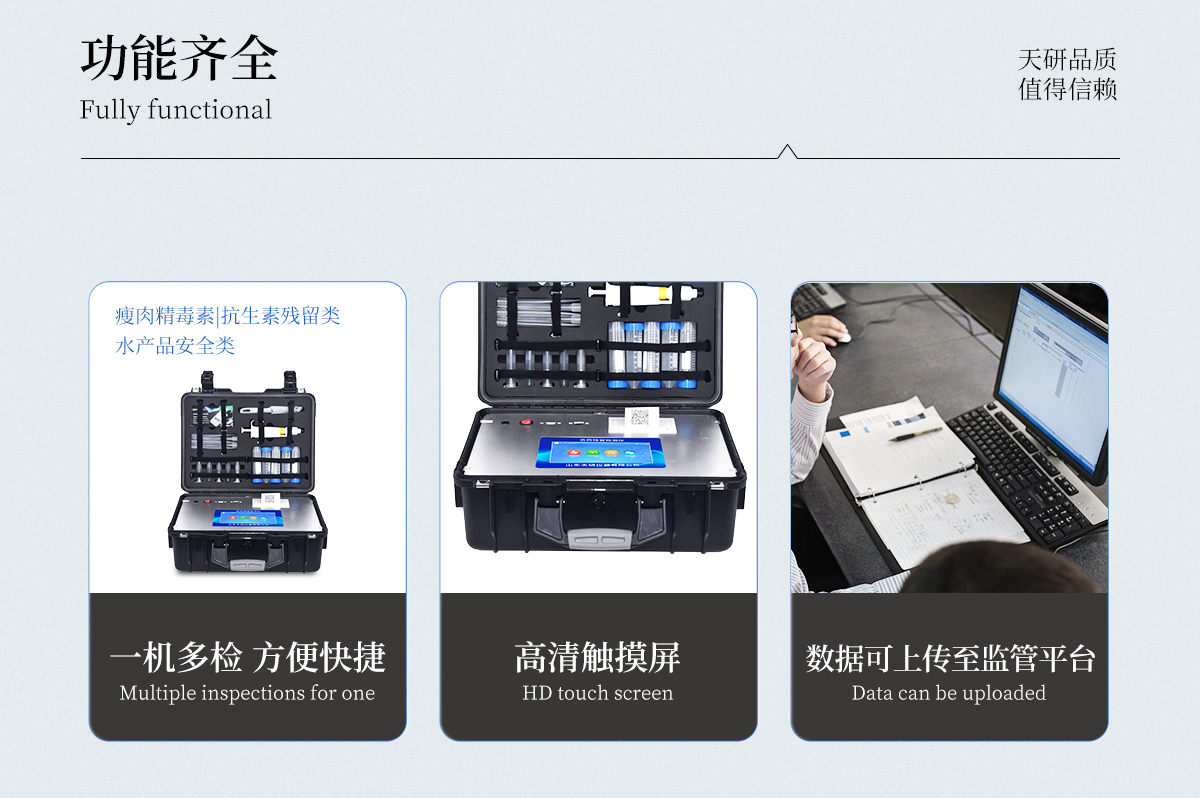 | 安卓智能操作系統(tǒng),采用更加**和人性化操作,儀器具有網(wǎng)線連接、wifi聯(lián)網(wǎng)上傳、4G無(wú)線遠(yuǎn)傳功能,快速上傳數(shù)據(jù)。 | 智能化程度高,儀器具有自檢功能:具有開機(jī)自檢和調(diào)零功能,具有自動(dòng)檢測(cè)重復(fù)性功能。 | 新一代高速熱敏打印機(jī),檢測(cè)完成可自動(dòng)打印檢測(cè)報(bào)告和二維碼。 | 儀器帶有監(jiān)管平臺(tái)。數(shù)據(jù)可局域網(wǎng)和互聯(lián)網(wǎng)數(shù)據(jù)上傳,檢測(cè)結(jié)果直接傳至食品安全監(jiān)管平臺(tái)。進(jìn)行區(qū)域食品安全監(jiān)管及大數(shù)據(jù)分析處理與數(shù)據(jù)統(tǒng)計(jì),檢測(cè)區(qū)域食品安全長(zhǎng)短期動(dòng)態(tài),達(dá)到食品安全問(wèn)題預(yù)估、預(yù)警。 | 一體化便攜式快檢設(shè)備,滿足現(xiàn)場(chǎng)及流動(dòng)檢測(cè)使用需求,能夠在同一軟件下實(shí)現(xiàn)所有檢測(cè)項(xiàng)目的檢測(cè),并可通過(guò)同一窗口直觀顯示檢測(cè)結(jié)果。 | 膠體金模塊檢測(cè)方式:軌道式自動(dòng)傳輸掃描,檢測(cè)完成后自動(dòng)退出檢測(cè)卡。 | CT線自動(dòng)識(shí)別,無(wú)需手動(dòng)調(diào)整。 | 儀器具有品類多種類樣品菜單庫(kù),可靈活選擇檢測(cè)樣品,不同的檢測(cè)通道可同時(shí)檢測(cè)不同的樣品項(xiàng)目。 | 樣品處理簡(jiǎn)單省力,整體操作快速、安全、便捷。 | 儀器具有自身保護(hù)功能,可設(shè)置用戶名及密碼,防止非工作人員操作等。 | 高靈敏度,高檢測(cè)精度,高重復(fù)性精度,掃描式高精度光學(xué)傳感器。 | 內(nèi)置強(qiáng)大的數(shù)據(jù)庫(kù),可在儀器上直接選擇樣品名稱、檢測(cè)指標(biāo)、送檢單位等信息,也可在儀器上直接編輯錄入樣品名稱、檢測(cè)指標(biāo)、送檢單位等信息并保存進(jìn)樣品數(shù)據(jù)庫(kù)。 | 儀器具有重新校準(zhǔn)、鎖定、恢復(fù)出廠設(shè)置功能。 | 支持U盤存儲(chǔ)。 結(jié)果判定線可修改,對(duì)照值標(biāo)定值可保存,斷電不丟失數(shù)據(jù)。 | 兼容市場(chǎng)上所有的膠體金卡,使用耗材不受限制,極大增強(qiáng)用戶使用體驗(yàn)。 |