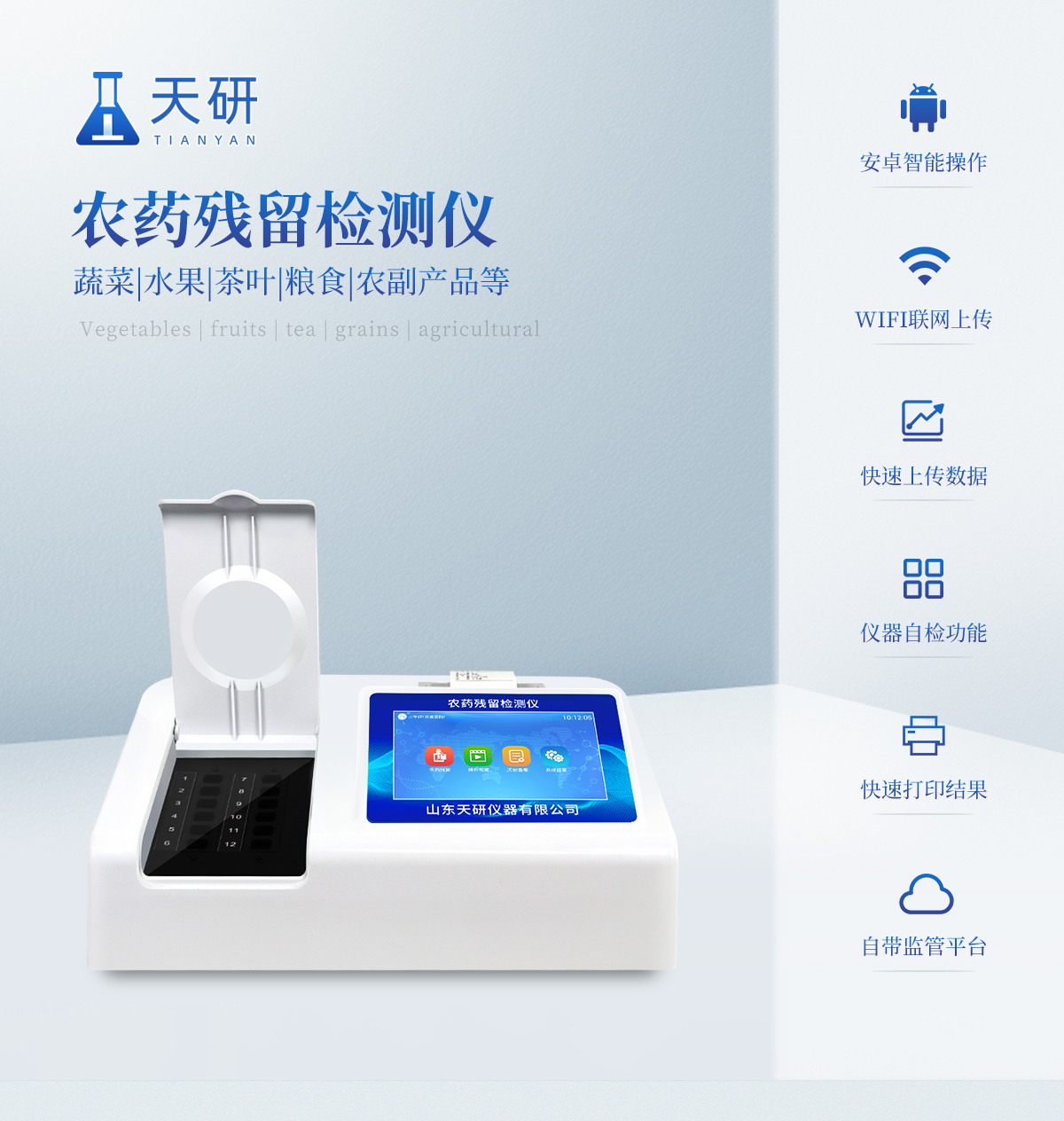 | 乙酰膽堿酯酶和丁酰膽堿酯酶試劑均可以使用,符合國(guó)家標(biāo)準(zhǔn)和農(nóng)業(yè)部標(biāo)準(zhǔn)的要求。 | 自動(dòng)判斷樣品是否合格,檢測(cè)結(jié)果更加直觀。 | 儀器具有100多種蔬菜名稱菜單庫(kù),分類管理,并可按需添加或刪除蔬菜名,編輯蔬菜名稱,可直接打印出蔬菜名稱。 | 檢測(cè)通道:12個(gè)檢測(cè)通道,可以同時(shí)測(cè)試多個(gè)樣品,循環(huán)檢測(cè),即放即檢,每個(gè)樣品由程序控制分別獨(dú)立工作,不會(huì)互相干擾。 | 智能操作系統(tǒng),采用更加人性化操作,主控采用多核處理器,主頻1.88Ghz,運(yùn)轉(zhuǎn)速度更快速,穩(wěn)定性更強(qiáng)。 | 顯示方式:7英寸高靈敏真彩觸摸屏顯示,人性化中文操作界面,讀數(shù)直觀、簡(jiǎn)單。 | 打印機(jī)采用串口5v打印,可選擇手動(dòng)打印或者自動(dòng)打印,三分鐘出打印結(jié)果,打印格式為檢測(cè)人姓名、吸光度差值、檢測(cè)時(shí)間、檢測(cè)機(jī)構(gòu)、樣品名稱及結(jié)果判定。 | 光源采用進(jìn)口超高亮發(fā)光二極管,具有低功耗、高精度、穩(wěn)定性強(qiáng)、光源可控可以關(guān)掉不使用的光源,響應(yīng)速度快等優(yōu)點(diǎn)。 | 智能恒流穩(wěn)壓,光強(qiáng)自動(dòng)校準(zhǔn),長(zhǎng)時(shí)間連續(xù)工作光源無溫漂現(xiàn)象。 | 儀器具有GPRS遠(yuǎn)傳功能,可插手機(jī)卡實(shí)現(xiàn)數(shù)據(jù)遠(yuǎn)傳平臺(tái),wifi聯(lián)網(wǎng)功能,可將數(shù)據(jù)快速上傳電腦,進(jìn)行數(shù)據(jù)管理與統(tǒng)計(jì)。 | 采用USB2.0接口設(shè)計(jì),方便數(shù)據(jù)的存貯和移動(dòng),并可隨時(shí)與計(jì)算機(jī)直接相連,并且可用計(jì)算機(jī)控制儀器。實(shí)現(xiàn)數(shù)據(jù)查詢、瀏覽、分析、統(tǒng)計(jì)、打印等。 | 智能化程度高,儀器具有自檢功能:具有開機(jī)自檢和調(diào)零功能,具有自動(dòng)檢測(cè)重復(fù)性功能 | 儀器具有自身保護(hù)功能,可設(shè)置用戶名及密碼,防止非工作人員操作等。 | 采用DC12v直流供電,安全系統(tǒng)更高,并且配備6A鋰電池充電器。 | 儀器具有重新校準(zhǔn)、鎖定、恢復(fù)出廠設(shè)置功能。 |