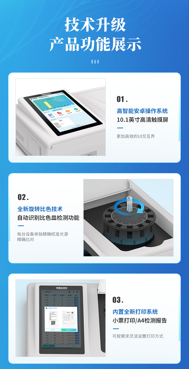 可快速定量檢測各類食品中的甲醛的含量,儀器預(yù)留其他項(xiàng)目檢測程序和端口,根據(jù)日后需求可方便的自主增加檢測項(xiàng)目。日后可升級為檢測,水產(chǎn)品,肉制品,面制品的綜合類型儀器。