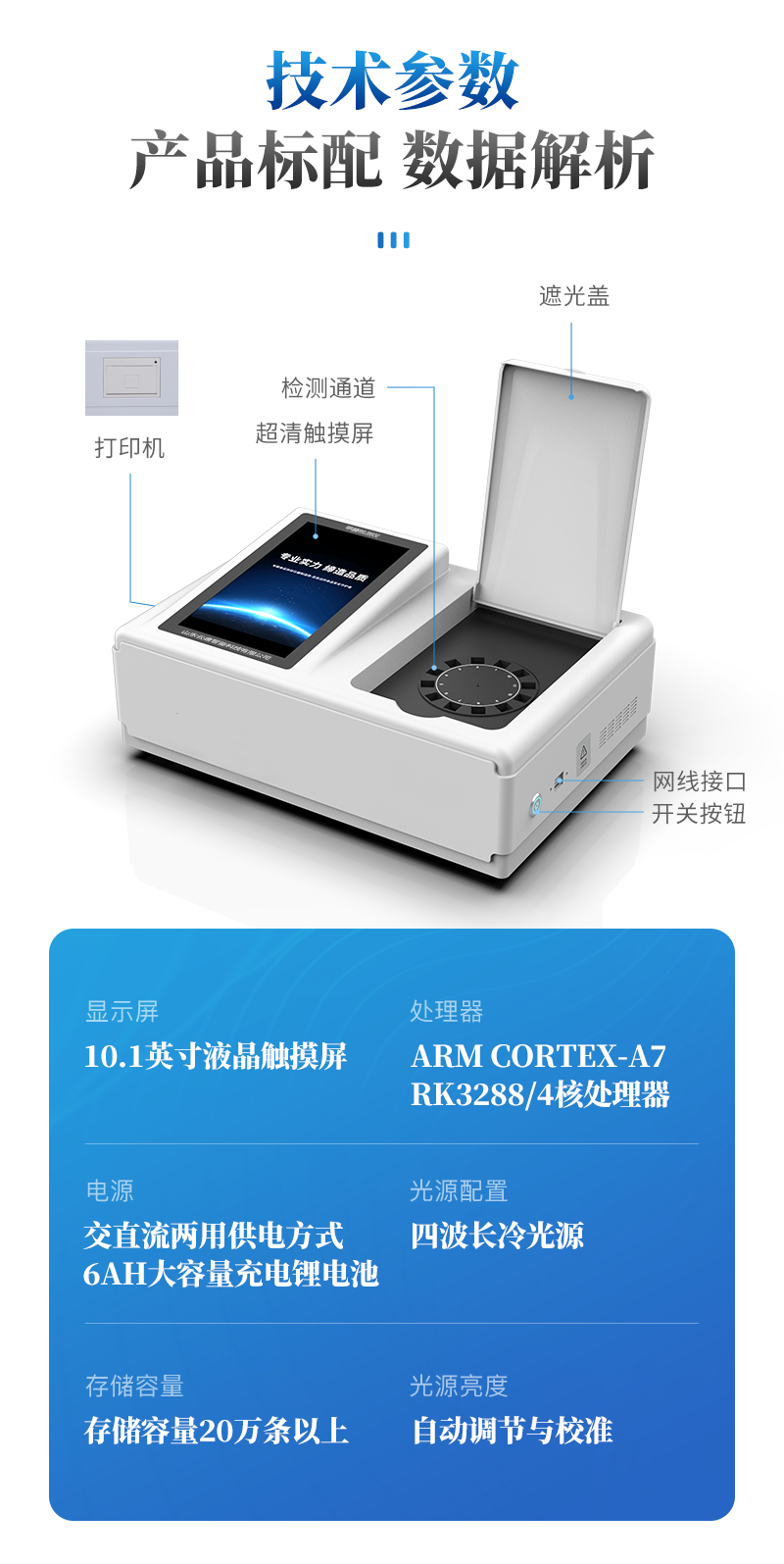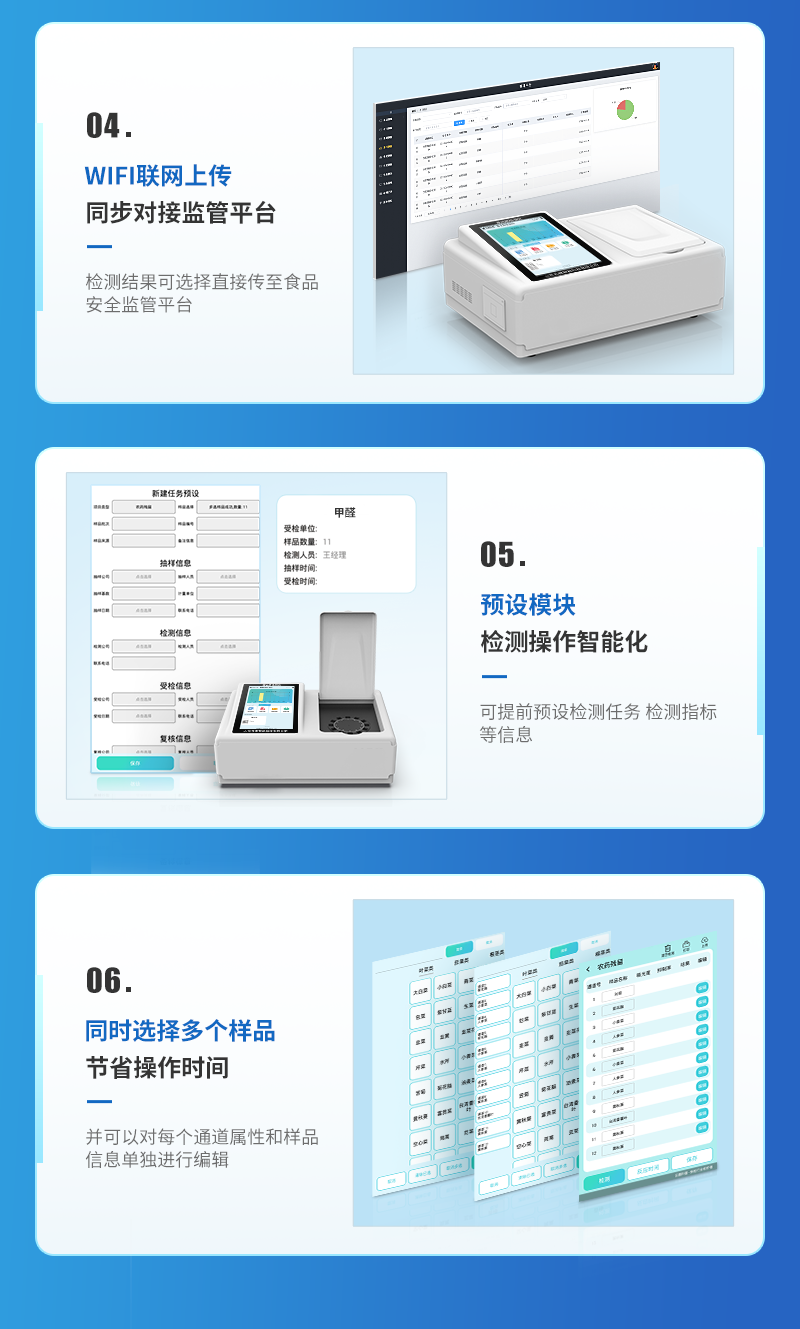 | 儀器采用臺式一體化系統(tǒng)檢測技術(shù),將分光光度模塊、新型農(nóng)殘檢測模塊、數(shù)字化管理模塊、無線通訊模塊高度集成于一體,支持檢測200種食品安全檢測項(xiàng)目,同時(shí)預(yù)留升級檢測方法。 | 儀器檢測模塊標(biāo)準(zhǔn)化、智能化,可隨意自由組合。檢測箱體內(nèi)置多個(gè)標(biāo)準(zhǔn)檢測單元,檢測模塊可以調(diào)整配置。 | 儀器采用全新安卓智能系統(tǒng),主控芯片采用 ARM Cortex-A7,RK3288/4核處理器,10.1寸高清液晶觸摸豎屏,更加**的UI交互界面,運(yùn)轉(zhuǎn)快捷;儀器配備無線通信模塊: 4G(APN)通訊模塊、Wifi模塊,藍(lán)牙傳輸,同時(shí)具有雙USB接口以及RJ45接口能以多種方式實(shí)現(xiàn)數(shù)據(jù)保存和數(shù)據(jù)傳輸功能。 | 創(chuàng)新檢測模式: | ★檢測通道:≥12通道;采用精密旋轉(zhuǎn)比色池設(shè)計(jì),使用同芯片同光源校準(zhǔn)精度,解決不同光源之間的誤差值。1-12通道間誤差0.1%。(**號:ZL202022821055.2) | ★儀器具有自動識別比色皿檢測功能,即:將樣品比色皿放入儀器后,點(diǎn)擊樣品檢測,儀器自動識別比色皿進(jìn)行通道檢測。 | 進(jìn)口高精光源: | 高精度進(jìn)口四波長冷光源,通道配置 410、520、590、630nm 波長光源,一個(gè)光源芯片驅(qū)動一個(gè)光源,誤差極小,每臺設(shè)備單獨(dú)**校準(zhǔn)光源,**比對,同時(shí)參照四種不同波段光源全方位覆蓋市面上99%的農(nóng)殘食品項(xiàng)目檢測。 | 智能化操作系統(tǒng): | 便捷操作系統(tǒng):設(shè)備檢測時(shí)可在同一檢測界面自動對應(yīng)相關(guān)檢測通道一次性選擇1-12個(gè)樣品名稱,無須退出界面,節(jié)省操作時(shí)間。 | 數(shù)據(jù)集成系統(tǒng):設(shè)備首頁自動統(tǒng)計(jì)檢測數(shù)據(jù)包含:周檢測數(shù)據(jù)、月檢測數(shù)據(jù),全部檢測總數(shù)量,均包含檢測總數(shù),合格數(shù),不合格數(shù),以及相關(guān)柱形分析圖,對各項(xiàng)檢測數(shù)據(jù)清晰掌握,無需電腦查詢,更加快捷直觀。 | 項(xiàng)目預(yù)設(shè)系統(tǒng):支持添加單個(gè)及多個(gè)相同或不相同的任務(wù)預(yù)設(shè),一鍵快速調(diào)取,每一個(gè)任務(wù)分別可以設(shè)置不同的樣品、批次、編號、來源、備注、抽樣信息、檢測信息、受檢信息、復(fù)核信息等更多信息。無縫鏈接平臺和APP實(shí)時(shí)查看下發(fā)任務(wù)。 | 數(shù)據(jù)監(jiān)管系統(tǒng):同步對接監(jiān)管平臺,數(shù)據(jù)可局域網(wǎng)和互聯(lián)網(wǎng)數(shù)據(jù)上傳,檢測結(jié)果可選擇直接傳至食品安全監(jiān)管平臺。集成OSS輸出存儲服務(wù)、區(qū)分設(shè)備定向管理應(yīng)用,進(jìn)行區(qū)域食品安全監(jiān)管及大數(shù)據(jù)分析處理與數(shù)據(jù)統(tǒng)計(jì),檢測區(qū)域食品安全長短期動態(tài),達(dá)到食品安全問題預(yù)估、預(yù)警。 | 自定義打印系統(tǒng):內(nèi)置全新打印系統(tǒng),新創(chuàng)自定義打印方式,可按需靈活設(shè)置開啟或關(guān)閉:產(chǎn)品合格證(國家農(nóng)業(yè)部標(biāo)準(zhǔn)要求),二維碼,抽樣信息、檢測信息,受檢信息、復(fù)核信息、抽樣日期、檢測日期等信息的打印。 | 系統(tǒng)遠(yuǎn)程更新功能:可定向分客戶分儀器更新系統(tǒng),按照不同客戶后期實(shí)際需求添加項(xiàng)目,無需機(jī)器返廠,即可遠(yuǎn)程實(shí)時(shí)升級全新系統(tǒng),節(jié)省時(shí)間成本及避免運(yùn)輸造成設(shè)備損壞。 | 儀器主機(jī)采用一體化防水、抗壓、防撞擊、防腐蝕箱體設(shè)計(jì),同時(shí)配備交直流供電,可連接車載電源,可選配大容量充電鋰電池,滿足現(xiàn)場野外檢測需求。 | 安全證書,放心保障:儀器具有中國計(jì)量科學(xué)研究院校準(zhǔn)證書,**認(rèn)證。 |