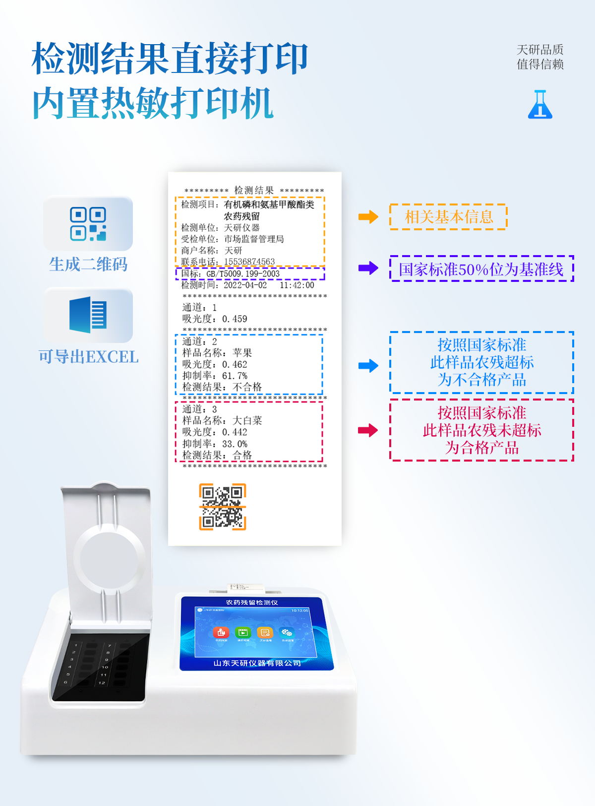 | 乙酰膽堿酯酶和丁酰膽堿酯酶試劑均可以使用,符合國(guó)家標(biāo)準(zhǔn)和農(nóng)業(yè)部標(biāo)準(zhǔn)的要求。 | 自動(dòng)判斷樣品是否合格,檢測(cè)結(jié)果更加直觀。 | 儀器具有100多種蔬菜名稱菜單庫(kù),分類管理,并可按需添加或刪除蔬菜名,編輯蔬菜名稱,可直接打印出蔬菜名稱。 | 檢測(cè)通道:12個(gè)檢測(cè)通道,可以同時(shí)測(cè)試多個(gè)樣品,循環(huán)檢測(cè),即放即檢,每個(gè)樣品由程序控制分別獨(dú)立工作,不會(huì)互相干擾。 | 智能操作系統(tǒng),采用更加人性化操作,主控采用多核處理器,主頻1.88Ghz,運(yùn)轉(zhuǎn)速度更快速,穩(wěn)定性更強(qiáng)。 | 顯示方式:7英寸高靈敏真彩觸摸屏顯示,人性化中文操作界面,讀數(shù)直觀、簡(jiǎn)單。 | 打印機(jī)采用串口5v打印,可選擇手動(dòng)打印或者自動(dòng)打印,三分鐘出打印結(jié)果,打印格式為檢測(cè)人姓名、吸光度差值、檢測(cè)時(shí)間、檢測(cè)機(jī)構(gòu)、樣品名稱及結(jié)果判定。 | 光源采用進(jìn)口超高亮發(fā)光二極管,具有低功耗、高精度、穩(wěn)定性強(qiáng)、光源可控可以關(guān)掉不使用的光源,響應(yīng)速度快等優(yōu)點(diǎn)。 | 智能恒流穩(wěn)壓,光強(qiáng)自動(dòng)校準(zhǔn),長(zhǎng)時(shí)間連續(xù)工作光源無(wú)溫漂現(xiàn)象。 | 儀器具有GPRS遠(yuǎn)傳功能,可插手機(jī)卡實(shí)現(xiàn)數(shù)據(jù)遠(yuǎn)傳平臺(tái),wifi聯(lián)網(wǎng)功能,可將數(shù)據(jù)快速上傳電腦,進(jìn)行數(shù)據(jù)管理與統(tǒng)計(jì)。 | 采用USB2.0接口設(shè)計(jì),方便數(shù)據(jù)的存貯和移動(dòng),并可隨時(shí)與計(jì)算機(jī)直接相連,并且可用計(jì)算機(jī)控制儀器。實(shí)現(xiàn)數(shù)據(jù)查詢、瀏覽、分析、統(tǒng)計(jì)、打印等。 | 智能化程度高,儀器具有自檢功能:具有開(kāi)機(jī)自檢和調(diào)零功能,具有自動(dòng)檢測(cè)重復(fù)性功能 | 儀器具有自身保護(hù)功能,可設(shè)置用戶名及密碼,防止非工作人員操作等。 | 采用DC12v直流供電,安全系統(tǒng)更高,并且配備6A鋰電池充電器。 | 儀器具有重新校準(zhǔn)、鎖定、恢復(fù)出廠設(shè)置功能。 |