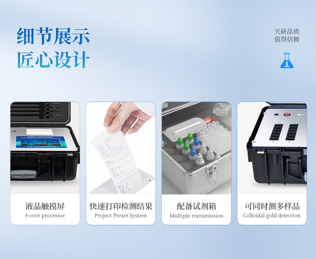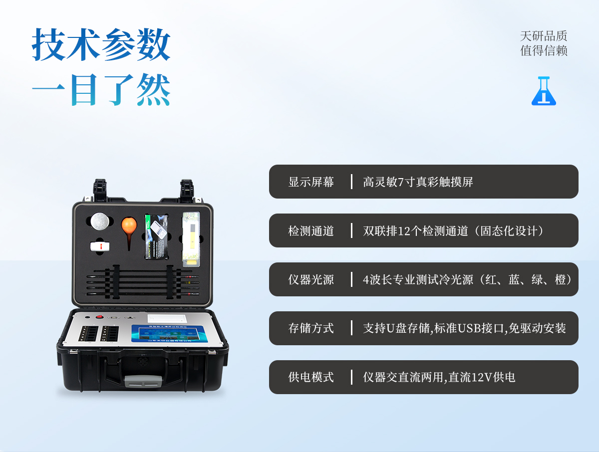 | 1、本儀器集各功能于一身,無需用戶自配附件,可靈活流動(dòng)檢測。 | 2、安卓(Android)智能操作系統(tǒng),主控芯片采用ARM Cortex-A7,RK3288/4核處理器,主頻1.88Ghz,運(yùn)轉(zhuǎn)速度更快速,穩(wěn)定性更強(qiáng)。 | 3、雙聯(lián)排12個(gè)檢測通道(固態(tài)化設(shè)計(jì)),一次性可快速檢測12個(gè)樣品,極大提升檢測效率,降低檢測成本。 | 4、檢測過程中內(nèi)置校準(zhǔn)功能,智能恒流穩(wěn)壓,光強(qiáng)自動(dòng)校準(zhǔn),確保檢測準(zhǔn)確度。 | 5、內(nèi)置作物專家施肥系統(tǒng),可對百余種全國農(nóng)業(yè)經(jīng)濟(jì)作物、果樹等的目標(biāo)產(chǎn)量計(jì)算推薦施肥量,依據(jù)施肥配方科學(xué)指導(dǎo)農(nóng)業(yè)生產(chǎn)。測土配方施肥結(jié)果可打印,打印內(nèi)容包含:作物種類、肥料種類、目標(biāo)產(chǎn)量、需求總量、建議施肥方案。 | 6、儀器標(biāo)配wifi無線上傳、4G聯(lián)網(wǎng)傳輸、GPRS無線遠(yuǎn)傳功能,快速上傳數(shù)據(jù)。 | 7、儀器內(nèi)置大容量內(nèi)存,支持查看全部歷史檢測記錄,以及傳輸所有檢測數(shù)據(jù)。 | 8、配有智慧云農(nóng)業(yè)平臺,儀器連入無線網(wǎng)絡(luò)后,可將檢測數(shù)據(jù)可選擇性或批量無線上傳,方便用戶進(jìn)行長期數(shù)據(jù)管理和可視化分析。 | 9、儀器配同時(shí)具有USB接口、以太網(wǎng)接口,并可隨時(shí)用U盤拷貝出數(shù)據(jù)。 | 10、可用手機(jī)隨時(shí)登錄云平臺在線移動(dòng)查看歷史數(shù)據(jù) | 11、內(nèi)置植物營養(yǎng)診斷標(biāo)準(zhǔn)圖譜,根據(jù)各農(nóng)作物營養(yǎng)缺失的圖片,進(jìn)行葉面對比,診斷豐缺。 | 12、4波長專業(yè)測試?yán)涔庠矗t、藍(lán)、綠、橙),光源波長穩(wěn)定,長時(shí)間連續(xù)工作光源無溫漂現(xiàn)象,壽命長達(dá)10萬小時(shí)級別,重現(xiàn)性好,準(zhǔn)確度高。 | 13、比色池部分采用標(biāo)準(zhǔn)1cm比色皿,無機(jī)械位移及磨損,光路測試定位**,有效屏蔽外光干擾,保證檢測結(jié)果優(yōu)于國標(biāo)要求。 | 14、儀器系統(tǒng)內(nèi)帶有樣品前處理操作視頻,各種樣品檢測方法點(diǎn)擊視頻模塊即可觀看,檢測人員無需自學(xué)說明書,指導(dǎo)教學(xué)方便快速,方便新手快速操作。 | 15、內(nèi)置新一代高速熱敏打印機(jī)(無需色帶),打印內(nèi)容包含:檢測單位、檢測人員、檢測項(xiàng)目、通道號、吸光度、養(yǎng)分含量(mg/kg)、檢測時(shí)間、以及二維碼等信息 | 16、高靈敏7寸真彩觸摸屏,采用更加**和人性化操作,高清晰高交互顯示,大程度降低傳統(tǒng)儀器的繁瑣操作和失誤。 | 17、內(nèi)置時(shí)鐘功能,方便操作時(shí)間記錄,長期歷史追溯。 | 18、可設(shè)置多賬戶賬號密碼登錄,**UI交互界面,不同的用戶可自由添加編輯檢測信息,保存后可長期使用。 | 19、GPS功能:可在野外作業(yè)時(shí)記錄經(jīng)緯度地點(diǎn),滿足特殊用戶需求。 | 20、內(nèi)置低電壓提示功能,可在檢測時(shí)明確電量,避免測試數(shù)據(jù)偏移,同時(shí)具有斷電保護(hù)功能,斷電自動(dòng)保存數(shù)據(jù),防止數(shù)據(jù)丟失。 | 21、交直流兩用供電方式,內(nèi)置大容量充電鋰電池,滿電狀態(tài)下可連續(xù)工作10余小時(shí),同時(shí)可外接車載電源蓄電。 | 22、儀器具有中英文切換功能,可滿足出口要求。 | 23、高強(qiáng)度PVC工程塑料手提箱設(shè)計(jì),堅(jiān)固耐用,便于攜帶。 |