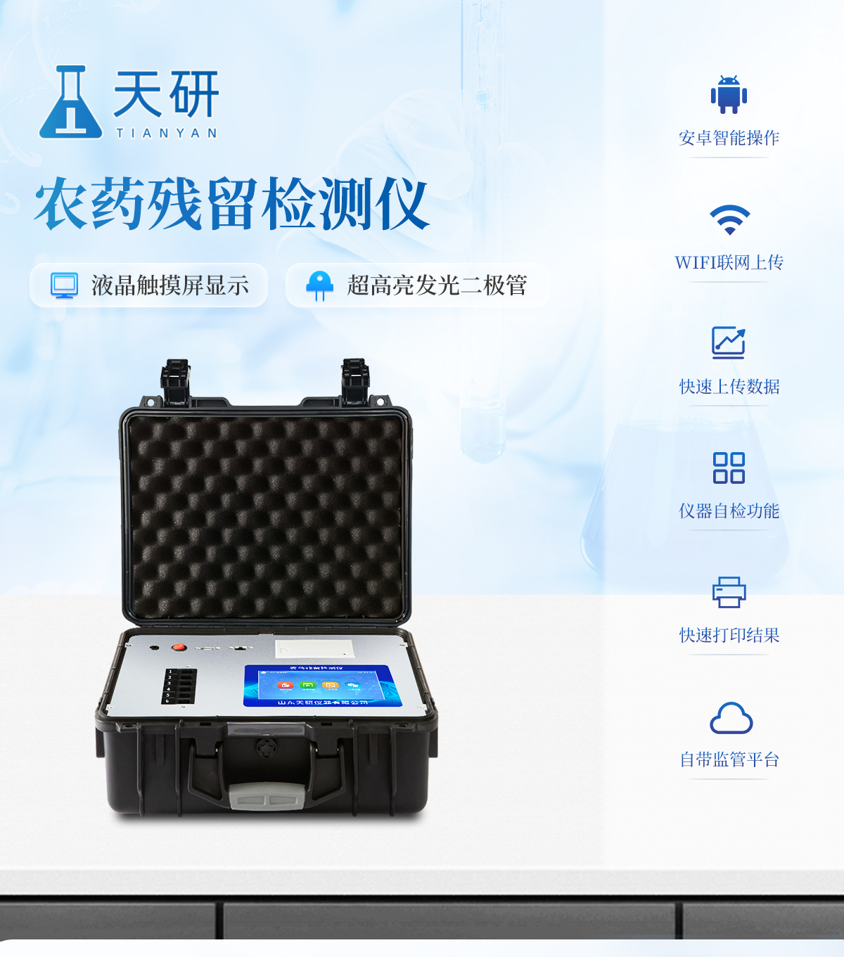 | 機箱采用工業(yè)級ABS工程塑料箱,方便攜帶,穩(wěn)固耐用,便于流動測試。 | 智能操作系統(tǒng),采用更加人性化操作,主控采用多核處理器,主頻1.88Ghz,運轉(zhuǎn)速度更快速,穩(wěn)定性更強。 | 自動判斷樣品是否合格,檢測結(jié)果更加直觀。 | 儀器具有100多種蔬菜名稱菜單庫,分類管理,并可按需添加或刪除蔬菜名,編輯蔬菜名稱,可直接打印出蔬菜名稱。 | 檢測通道:6個檢測通道,可以同時測試多個樣品,循環(huán)檢測,即放即檢,每個樣品由程序控制分別獨立工作,不會互相干擾。 | 儀器具有wifi聯(lián)網(wǎng)功能,可將數(shù)據(jù)快速上傳電腦,進行數(shù)據(jù)管理與統(tǒng)計,4G信號GPRS遠傳功能,可插手機卡實現(xiàn)數(shù)據(jù)遠傳平臺,。 | 顯示方式:7英寸高靈敏真彩觸摸屏顯示,人性化中文操作界面,讀數(shù)直觀、簡單。 | 打印機采用串口5v打印,可選擇手動打印或者自動打印,三分鐘出打印結(jié)果,打印格式為檢測人姓名、吸光度差值、檢測時間、檢測機構(gòu)、樣品名稱及結(jié)果判定。 | 光源采用進口超高亮發(fā)光二極管,具有低功耗、高精度、穩(wěn)定性強、光源可控可以關掉不使用的光源,響應速度快等優(yōu)點。 | 智能恒流穩(wěn)壓,光強自動校準,長時間連續(xù)工作光源無溫漂現(xiàn)象。 | 采用USB2.0接口設計,方便數(shù)據(jù)的存貯和移動,并可隨時與計算機直接相連,并且可用計算機控制儀器。實現(xiàn)數(shù)據(jù)查詢、瀏覽、分析、統(tǒng)計、打印等。 | 智能化程度高,儀器具有自檢功能:具有開機自檢和調(diào)零功能,具有自動檢測重復性功能 | 儀器具有自身保護功能,可設置用戶名及密碼,防止非工作人員操作等。 | 采用DC12v直流供電,安全系統(tǒng)更高,并且配備6A鋰電池充電器。 | 儀器具有重新校準、鎖定、恢復出廠設置功能。 |