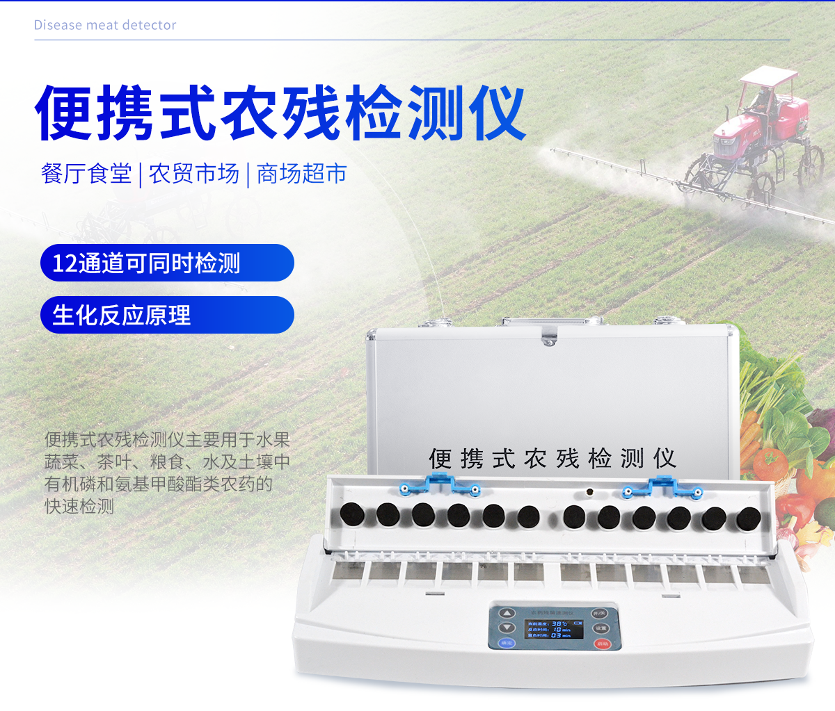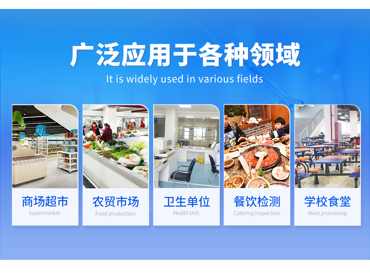 主要用于水果、蔬菜、茶葉、糧食、水及土壤中有機(jī)磷和氨基甲酸酯類農(nóng)藥的快速檢測(cè),特別適用于各級(jí)食品安全檢測(cè)機(jī)構(gòu)現(xiàn)場(chǎng)執(zhí)法使用,此外還可用于果蔬茶生產(chǎn)基地和農(nóng)貿(mào)批發(fā)銷售市場(chǎng)現(xiàn)場(chǎng)檢測(cè),餐館、食堂、家庭果蔬加工前的安全速測(cè)等