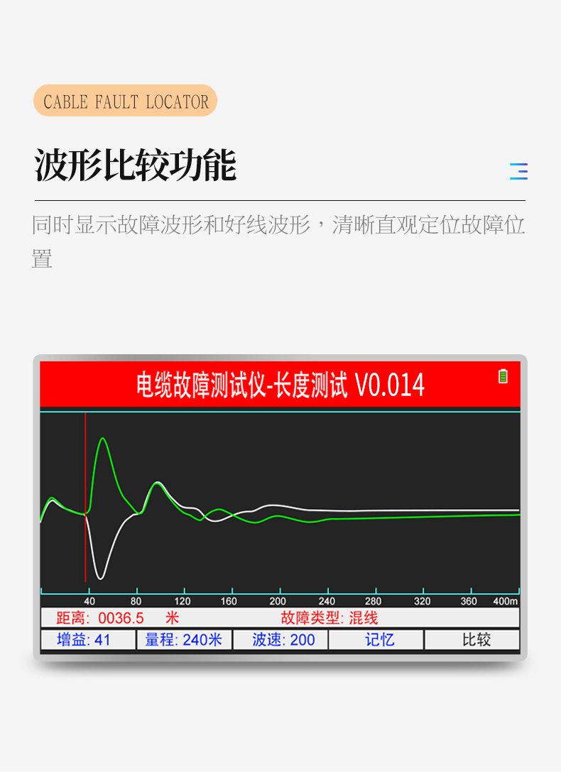 | 1.480*800大屏幕真彩手機細膩屏在陽光下也能清晰可辨。 | 2.自帶數(shù)據(jù)接口,支持客戶遠程升級。 | 3.采用ARM CPU配合FPGA技術(shù),可快速準確判斷故障波形。 | 4.波形比較功能,特別適用于線路某點氧化造成后端電壓 | 低故障的測試定位。 | 5.簡潔的對應功能按鍵易學易會直觀方便。 | 6.高能量鋰電池,使用時間可達6-8小時。 | 7.信號器自帶萬用表功能方便測試電壓電阻及絕緣。 |