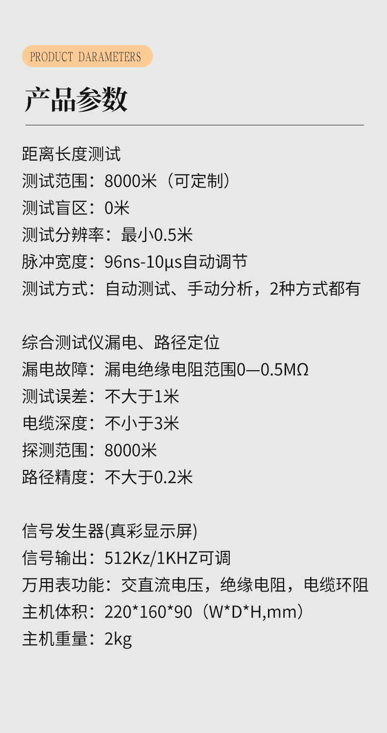 | 綜合測試儀距離長度測試: | 測試范圍: 8000米(可定制) | 測試盲區(qū): 0米 | 測試分辨率:最小0.5米 | 脈沖寬度: 96ns-10μs自動調(diào)節(jié) | 測試方式:自動測試、手動分析,2種方式都有 | 綜合測試儀漏電、路徑定位: | 漏電故障:漏電絕緣電阻范圍0-0.5MΩ | 測試誤差:不大于1米 | 電纜深度:不小于3米 | 探測范圍: 8000米 | 路徑精度:不大于0.2米. | 信號發(fā)生器(真彩顯示屏) : | 信號輸出:1KHZ可調(diào) | 萬用表功能:交直流電壓、絕緣電阻、電纜環(huán)阻 | 主機體積: 220*1 60*90 (W*D*H, mm) | 主機重量: 2kg |