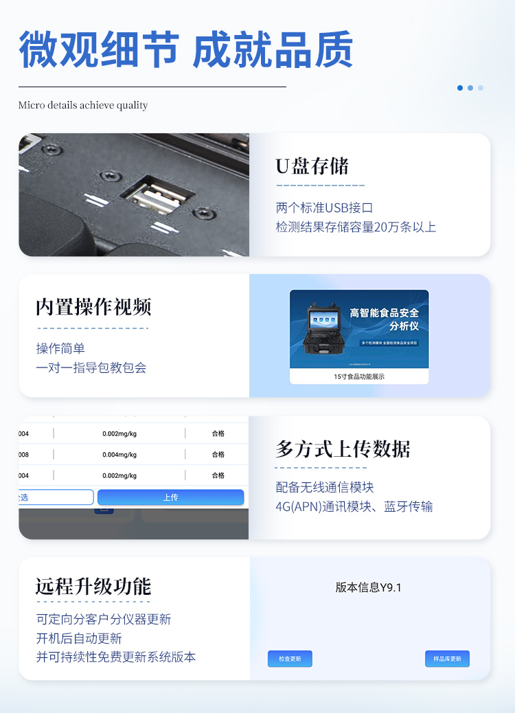 | 儀器采用臺式一體化系統(tǒng)檢測技術(shù),將分光光度模塊、膠體金檢測模塊、新型農(nóng)殘檢測模塊、數(shù)字化管理模塊、無線通訊模塊高度集成于一體,支持檢測200種食品安全檢測項(xiàng)目,同時(shí)預(yù)留升級檢測方法。 | 儀器檢測模塊標(biāo)準(zhǔn)化、智能化,檢測項(xiàng)目可隨意自由組合。檢測箱體內(nèi)置多個(gè)標(biāo)準(zhǔn)檢測單元,檢測模塊可以調(diào)整配置。 | 顯示屏幕:儀器采用10.1英寸豎向液晶觸摸屏顯,搭配運(yùn)行安卓智能操作系統(tǒng),主控芯片采用ARM Cortex-A7,RK3288/4核處理器,主頻1.88Ghz,操作方便,性能更強(qiáng)。 | 檢測通道:≥12通道;采用精密旋轉(zhuǎn)比色池設(shè)計(jì),使用同芯片同光源校準(zhǔn)精度,解決不同光源之間的誤差值,更加準(zhǔn)確**。(1-12通道間誤差0.1%,**號:ZL202022821055.2) | 儀器光源:高精度進(jìn)口四波長冷光源,每個(gè)通道均配置 410、520、590、630nm 波長光源,標(biāo)配**的光路切換裝置,**光路切換功能可實(shí)現(xiàn)64波長,并且所有檢測項(xiàng)目可實(shí)現(xiàn)所有通道同時(shí)檢測。 | 設(shè)備可一鍵校準(zhǔn),自動保存校準(zhǔn)數(shù)據(jù),自動對比校驗(yàn),得到精準(zhǔn)光源,采用Android SP存儲數(shù)據(jù),光源數(shù)據(jù)永不丟失,方便每一次使用。 | 通訊接口:配備無線通信模塊、可選配4G(APN)通訊模塊和藍(lán)牙傳輸,同時(shí)具有雙USB接口以及RJ45網(wǎng)線接口,可以多方式實(shí)現(xiàn)數(shù)據(jù)保存及數(shù)據(jù)傳輸。 | 存儲方式:支持U盤存儲,標(biāo)準(zhǔn)USB接口,免驅(qū)動安裝。檢測結(jié)果存儲容量20萬條以上,可生成Excel表格進(jìn)行拷貝,并具有登錄保護(hù)功能。 | 智能化操作系統(tǒng): | 1、操作系統(tǒng):儀器可在同一檢測界面自動對應(yīng)相關(guān)檢測通道,一次性選擇1-12個(gè)樣品名稱,無需退出界面,節(jié)省操作時(shí)間。并可以對每個(gè)通道屬性和樣品信息單獨(dú)進(jìn)行編輯,例如送檢單位、人員,檢測人員等,打印時(shí)勾選打印顯示。 | 2、數(shù)據(jù)集成系統(tǒng):設(shè)備首頁自動匯總分析檢測數(shù)據(jù),包含:周檢測數(shù)據(jù)、月檢測數(shù)據(jù),全部檢測總數(shù)量,均包含檢測總數(shù),合格數(shù),不合格數(shù),以及相關(guān)柱形分析圖,各項(xiàng)檢測數(shù)據(jù)一目了然,無需電腦查詢,更加快捷直觀。 | 3、數(shù)據(jù)庫系統(tǒng):十幾項(xiàng)數(shù)據(jù)庫分類管理儀器:包含項(xiàng)目類型、項(xiàng)目數(shù)據(jù)、檢測數(shù)據(jù)、歷史記錄、國標(biāo)信息、曲線信息、采樣信息、檢測信息、受檢信息、復(fù)核信息、圖表信息、光源校準(zhǔn)信息、打印樣式信息、樣品庫信息等等,數(shù)據(jù)庫之間互相協(xié)調(diào)聯(lián)動保證數(shù)據(jù)的真實(shí)完整性。同時(shí)產(chǎn)品數(shù)據(jù)庫以及歷史檢測記錄支持一鍵檢索功能。 | 4、限量規(guī)判系統(tǒng):具有限量查詢、添加物質(zhì)合規(guī)判定系統(tǒng)。檢測出結(jié)果后,系統(tǒng)自動調(diào)用系統(tǒng)數(shù)據(jù)庫中相關(guān)國標(biāo)進(jìn)行比對判定,客觀顯示判定結(jié)果是否合格。 | 5、項(xiàng)目預(yù)設(shè)系統(tǒng):儀器具有任務(wù)預(yù)設(shè)模塊,一鍵提前預(yù)設(shè),給出方便快捷的新檢測方案,每一個(gè)任務(wù)分別可以設(shè)置不同的樣品、批次、編號、來源、備注、抽樣信息、檢測信息、受檢信息、復(fù)核信息等更多信息。樣品送檢時(shí)一鍵調(diào)取保存信息,并可多次調(diào)取,大大提高檢測效率。 | 6、數(shù)據(jù)監(jiān)管系統(tǒng):同步對接監(jiān)管平臺,數(shù)據(jù)可局域網(wǎng)和互聯(lián)網(wǎng)數(shù)據(jù)上傳,檢測結(jié)果可選擇直接傳至食品安全監(jiān)管平臺。進(jìn)行區(qū)域食品安全監(jiān)管及大數(shù)據(jù)分析處理與數(shù)據(jù)統(tǒng)計(jì),檢測區(qū)域食品安全長短期動態(tài),達(dá)到食品安全問題預(yù)估、預(yù)警。 | 7、全新打印系統(tǒng):內(nèi)置全新打印機(jī),新創(chuàng)自定義打印方式,可按需靈活勾選控制:產(chǎn)品合格證(國家農(nóng)業(yè)部標(biāo)準(zhǔn)要求),二維碼,抽樣信息、檢測信息,受檢信息、復(fù)核信息、抽樣日期、檢測日期等信息的打印。 | 8、A4紙版本報(bào)告打印功能(可選配):設(shè)備擁有兩種結(jié)果展示方式,可以自動生成A4打印模板和小票打印模板兩種樣式,可通過WiFi及網(wǎng)線等方式鏈接外置打印機(jī)可進(jìn)行打印。 | 10、供電模式:儀器交直流兩用,直流12V供電,可連接車載電源,可配6ah大容量充電鋰電池,電量可實(shí)時(shí)顯示,方便戶外流動測試。 | 11、膠體金檢測模塊:采用單通道CMOS成像處理技術(shù)及膠體金免疫層析技術(shù),可讀取膠體金卡數(shù)據(jù),自動采集、處理分析,將檢測結(jié)果顯示,并可根據(jù)參考限值自動判斷檢測結(jié)果,可檢測常見的獸藥殘留、生物毒素、抗生素、違禁添加物等。 | 11.1、探測技術(shù):CMOS成像探測; | 11.2、檢測通道:1個(gè)通道; | 11.3、檢測方式:消線法和比色法; | 11.4、顯示模式:陰性或陽性; | 11.5、曲線形式:直插式掃描方式,顯示金標(biāo)卡圖像,實(shí)時(shí)生成、識別CT曲線圖,無需手動調(diào)整,完成檢測后自動退出檢測卡。兼