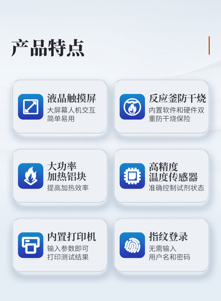 | 1. ☆采用濾袋技術(shù),濾袋孔徑25μm | 2. 耐腐蝕、耐高壓、特殊處理消煮鍋,安全可靠,經(jīng)久耐用 | 3. 彩色液晶觸摸屏,界面簡潔,操作簡單 | 4. ☆全自動測試過程,包括自動添加各種試劑、消煮、加熱、控溫、定時攪拌、清洗和排廢,無需人員值守 | 5. ☆**間歇攪拌技術(shù),模擬手工攪拌,使樣品處理更均勻,攪拌徹底、均勻,無試劑漏液風(fēng)險,安全可靠,攪拌速度15圈/分鐘,間歇周期1分鐘 | 6. **批處理能力,批處理能力為30個/批,效率高,節(jié)省試劑 | 7. ☆自動根據(jù)樣品數(shù)量添加試劑,降低使用成本 | 8. 獨(dú)立的酸液、堿液、蒸餾水耐腐蝕精密加液泵,使用可靠,更安全 | 9. 全面的監(jiān)控配置,包括試劑量、溫度、壓力監(jiān)測 | 10. ☆儀器內(nèi)置250組用戶自定義測試方案,使用更簡潔 | 11. 儀器具備定時啟動功能,測試更方便 | 12. ☆儀器采用高壓密閉測試,無需冷卻水,節(jié)水環(huán)保 | 13. 儀器可以直接在普通實(shí)驗室環(huán)境,無需通風(fēng)櫥 | 14. 儀器內(nèi)部無危險的玻璃材質(zhì)器件,安全可靠 |