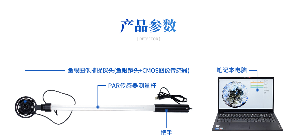 植物冠層圖像分析儀由魚眼圖像捕捉探頭(由魚眼鏡頭及CCD圖像傳感器組成)、內(nèi)置25個PAR傳感器的測量桿(搖臂)、筆記本電腦、圖像采集軟件及圖像 分析軟件、高容量的可充電電池組組成。魚眼探頭安裝在一個很輕的搖臂的頂端,它可以獲取150°視角的魚眼圖像。圖像的顯示和存貯由配置的筆記本計算機完 成。