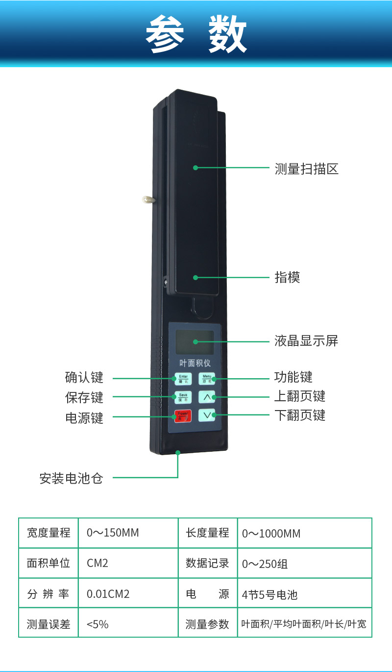 | (1)面積單位:cm2 | (2)分辨率:0.01cm2 | (3)測量誤差:<5% | (4)寬度量程:0~150mm | (5)長度量程:0~1000mm | (6)數據記錄:0~250組 | (7)電源:4節(jié)5號電池 |