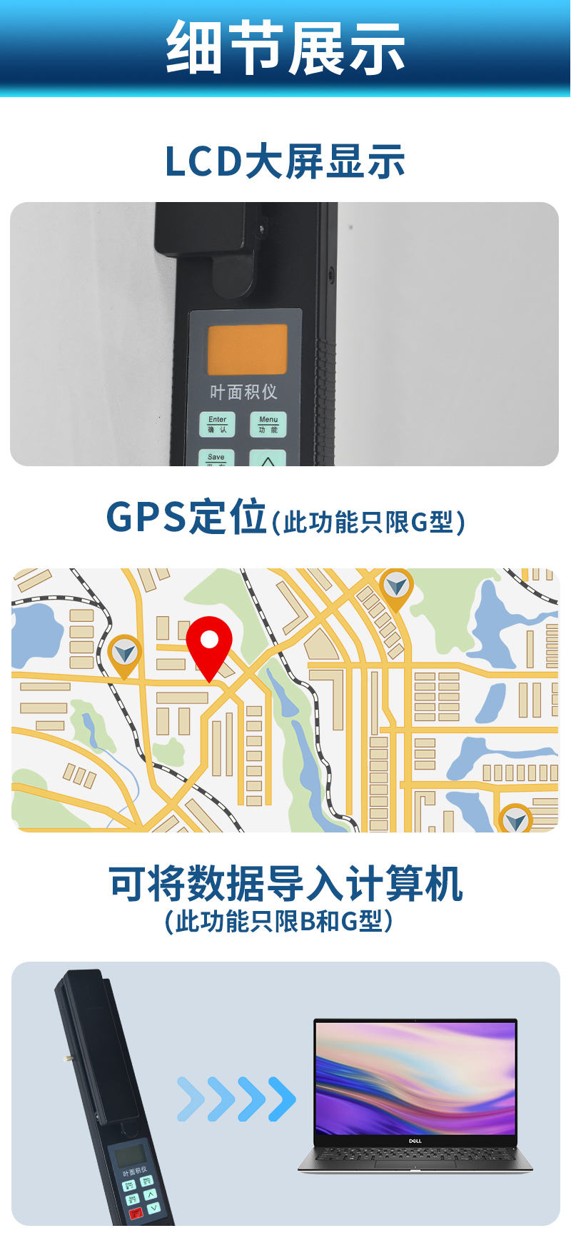 儀器可以直接測量葉片長度、寬度和面積,并集成了GPS定位系統(tǒng),增加了RS232接口,可將測量數據和定位信息同時導入計算機,方便廣大科研者對數據的進一步處理。