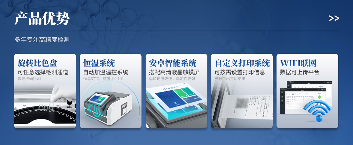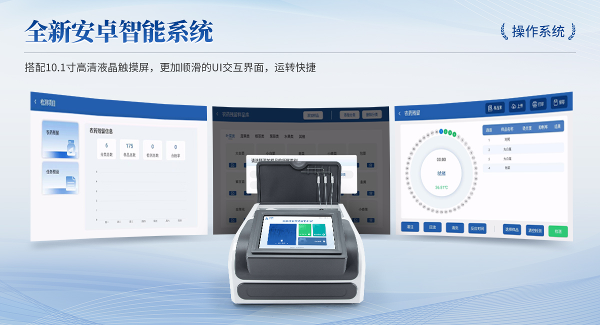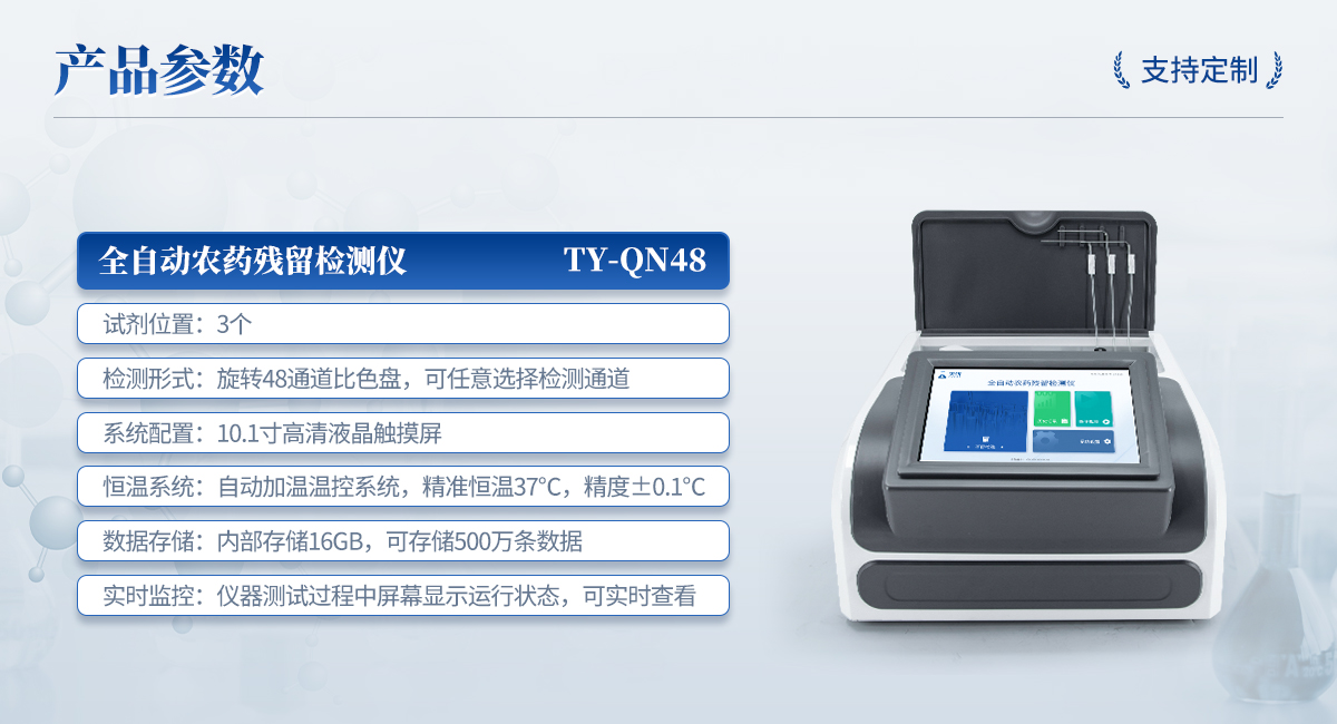 | 1. 試劑位置:3個 | 2. 檢測形式:旋轉48通道比色盤,可任意選擇檢測通道,自動對應選擇通道。 | 3. 系統配置:10.1寸高清液晶觸摸屏,采用ARM Cortex-A7,RK3288/4核處理器,運行內存1GB。Android7.1.1 系統分辨率1280×800。 | 4.恒溫系統:具有自動加溫溫控系統,精準恒溫37℃,精度±0.1℃。 | 5.添加系統:儀器按照試劑要求自動、按時、按量加入試劑,并且自動對未正常放置的樣本或異常的樣本進行檢查并提示。 | 6.清洗功能:儀器具備回流及自動清洗管路功能,避免試劑污染。 | 7.混勻功能:設備具備自動混勻功能。 | 8.光源校準:設備可自動校準,確保檢測準確度。 | 9.實時監(jiān)控:儀器測試過程中屏幕顯示運行狀態(tài),可實時查看。 | 10.數據存儲:內部存儲16GB,可存儲500萬條數據。 | 11.樣品多選功能:設備具備樣品一鍵多選功能,選擇樣品自動匹配檢測通道。 | 12.項目預設:可提前設置單個及多個相同或不相同的檢測任務,可單次或者多次調取,減少檢測時間。 | 13.自定義打印系統:內置自定義打印系統,可按需靈活設置開啟或關閉:產品合格證(國家農業(yè)部標準),二維碼,抽樣信息、檢測信息,受檢信息等信息的打印。 | 14.A4版本報告打印功能:設備可自動生成A4版報告,A4報告帶二維碼,可掃描二維碼生成電子版,并可識別真?zhèn)巍?/td> | 15.傳輸方式:儀器配備無線通信模塊: 4G(APN)通訊模塊、Wifi模塊,藍牙傳輸模塊,同時具有USB接口以及RJ45接口能以多種方式實現數據保存和數據傳輸功能,設備數據可以同步上傳至平臺。 | 16.數據監(jiān)管系統:設備自帶監(jiān)管平臺,并可同步對接監(jiān)管平臺,數據可局域網和互聯網數據上傳,檢測結果可直接傳至食品安全監(jiān)管平臺。達到食品安全問題預估、預警。 | 17.系統遠程更新功能:無需設備返廠,即可遠程實時升級全新系統,節(jié)省時間成本及避免運輸造成設備損。 |