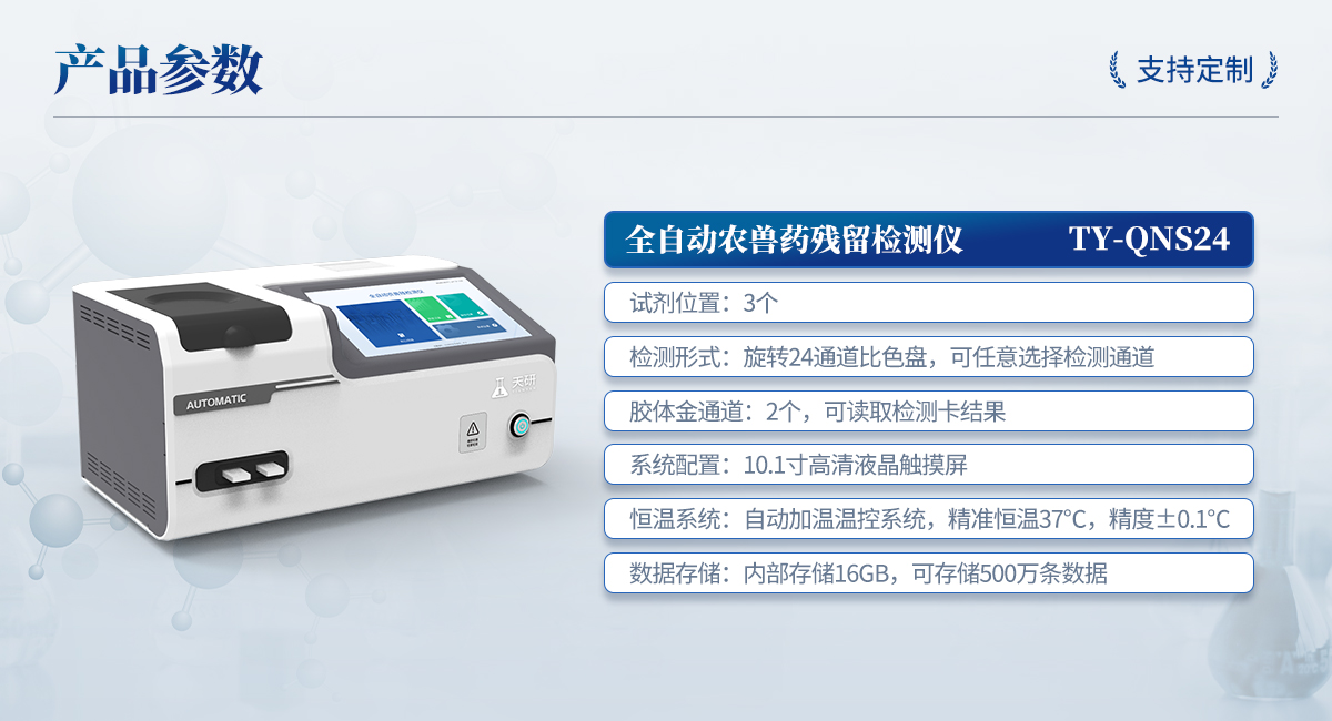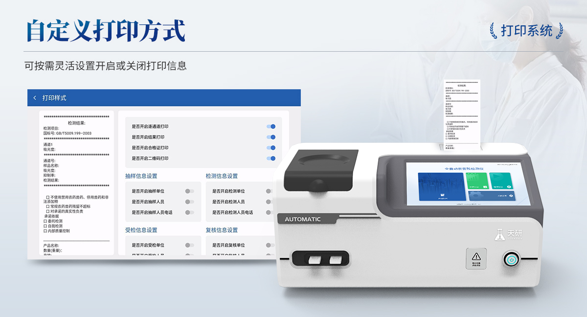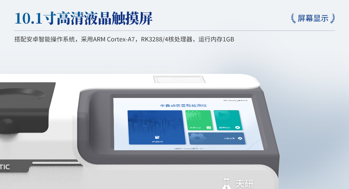 | 1. 試劑位置:3個 | 2. 農(nóng)殘檢測盤:旋轉(zhuǎn)24通道比色盤,可任意選擇檢測通道,自動對應(yīng)選擇通道。 | 3. 膠體金通道:2個,可讀取檢測卡結(jié)果,自動采集、處理分析,自動判斷檢測結(jié)果,并具備自動判空功能。 | 4.系統(tǒng)配置:10.1寸高清液晶觸摸屏,采用ARM Cortex?-A7,RK3288/4核處理器,運行內(nèi)存1GB。Android7.1.1 系統(tǒng)分辨率1280×800。 | 5.恒溫系統(tǒng):具有自動加溫溫控系統(tǒng),精準恒溫37℃,精度±0.1℃。 | 6.添加系統(tǒng):儀器按照試劑要求自動、按時、按量加入試劑,并且自動對未正常放置的樣本或異常的樣本進行檢查并提示。 | 7.清洗功能:儀器具備回流及自動清洗管路功能,避免試劑污染。 | 8.混勻功能:設(shè)備具備自動混勻功能。 | 9.光源校準:設(shè)備可自動校準,確保檢測準確度。 | 10.實時監(jiān)控:儀器測試過程中屏幕顯示運行狀態(tài),可實時查看。 | 11.數(shù)據(jù)存儲:內(nèi)部存儲16GB,可存儲500萬條數(shù)據(jù)。 | 12.樣品多選功能:設(shè)備具備樣品一鍵多選功能,選擇樣品自動匹配檢測通道。 | 13.項目預(yù)設(shè):可提前設(shè)置單個及多個相同或不相同的檢測任務(wù),可單次或者多次調(diào)取,減少檢測時間。 | 14.自定義打印系統(tǒng):內(nèi)置自定義打印系統(tǒng),可按需靈活設(shè)置開啟或關(guān)閉:產(chǎn)品合格證(國家農(nóng)業(yè)部標準),二維碼,抽樣信息、檢測信息,受檢信息等信息的打印。 | 15.A4版本報告打印功能:設(shè)備可自動生成A4版報告,A4報告帶二維碼,可掃描二維碼生成電子版,并可識別真?zhèn)巍?/td> | 16.傳輸方式:儀器配備無線通信模塊: 4G(APN)通訊模塊、Wifi模塊,藍牙傳輸模塊,同時具有USB接口以及RJ45接口能以多種方式實現(xiàn)數(shù)據(jù)保存和數(shù)據(jù)傳輸功能,設(shè)備數(shù)據(jù)可以同步上傳至平臺。 | 17.系統(tǒng)17.數(shù)據(jù)監(jiān)管系統(tǒng):設(shè)備自帶監(jiān)管平臺,并可同步對接監(jiān)管平臺,數(shù)據(jù)可局域網(wǎng)和互聯(lián)網(wǎng)數(shù)據(jù)上傳,檢測結(jié)果可直接傳至食品安全監(jiān)管平臺。達到食品安全問題預(yù)估、預(yù)警。 | 18.系統(tǒng)遠程更新功能:無需設(shè)備返廠,即可遠程實時升級全新系統(tǒng),節(jié)省時間成本及避免運輸造成設(shè)備損。 |