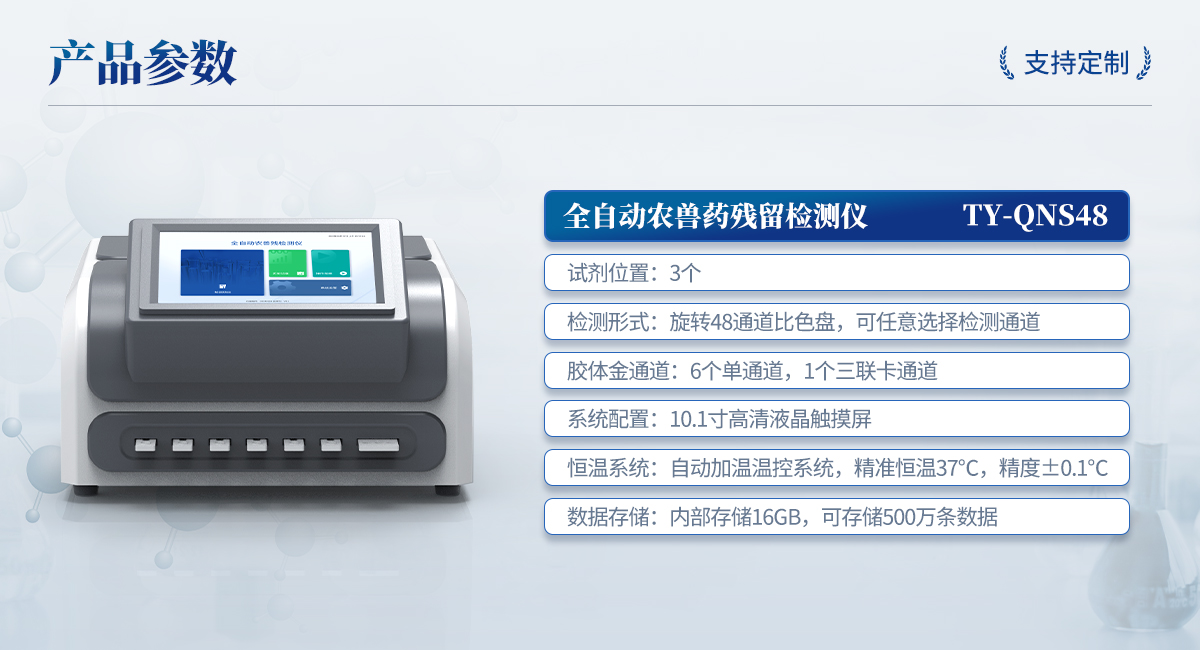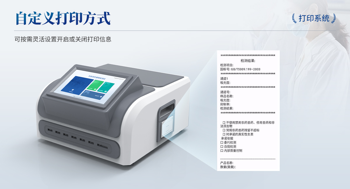 | 1. 試劑位置:3個 | 2. 農(nóng)殘檢測盤:旋轉(zhuǎn)48通道比色盤,可任意選擇檢測通道,自動對應選擇通道。 | 3. 膠體金通道:6個單通道,1個三聯(lián)卡通道,可讀取檢測卡結(jié)果,自動采集、處理分析,自動判斷檢測結(jié)果,并具備自動判空功能。 | 4.系統(tǒng)配置:10.1寸高清液晶觸摸屏,采用ARM Cortex-A7,RK3288/4核處理器,運行內(nèi)存1GB。Android7.1.1 系統(tǒng)分辨率1280×800。 | 5.恒溫系統(tǒng):具有自動加溫溫控系統(tǒng),精準恒溫37℃,精度±0.1℃。 | 6.添加系統(tǒng):儀器按照試劑要求自動、按時、按量加入試劑,并且自動對未正常放置的樣本或異常的樣本進行檢查并提示。 | 7.清洗功能:儀器具備回流及自動清洗管路功能,避免試劑污染。 | 8.混勻功能:設(shè)備具備自動混勻功能。 | 9.光源校準:設(shè)備可自動校準,確保檢測準確度。 | 10.實時監(jiān)控:儀器測試過程中屏幕顯示運行狀態(tài),可實時查看。 | 11.數(shù)據(jù)存儲:內(nèi)部存儲16GB,可存儲500萬條數(shù)據(jù)。 | 12.樣品多選功能:設(shè)備具備樣品一鍵多選功能,選擇樣品自動匹配檢測通道。 | 13.項目預設(shè):可提前設(shè)置單個及多個相同或不相同的檢測任務,可單次或者多次調(diào)取,減少檢測時間。 | 14.自定義打印系統(tǒng):內(nèi)置自定義打印系統(tǒng),可按需靈活設(shè)置開啟或關(guān)閉:產(chǎn)品合格證(國家農(nóng)業(yè)部標準),二維碼,抽樣信息、檢測信息,受檢信息等信息的打印。 | 15.A4版本報告打印功能:設(shè)備可自動生成A4版報告,A4報告帶二維碼,可掃描二維碼生成電子版,并可識別真?zhèn)巍?/td> | 16.傳輸方式:儀器配備無線通信模塊: 4G(APN)通訊模塊、Wifi模塊,藍牙傳輸模塊,同時具有USB接口以及RJ45接口能以多種方式實現(xiàn)數(shù)據(jù)保存和數(shù)據(jù)傳輸功能,設(shè)備數(shù)據(jù)可以同步上傳至平臺。 | 17.數(shù)據(jù)監(jiān)管系統(tǒng):設(shè)備自帶監(jiān)管平臺,并可同步對接監(jiān)管平臺,數(shù)據(jù)可局域網(wǎng)和互聯(lián)網(wǎng)數(shù)據(jù)上傳,檢測結(jié)果可直接傳至食品安全監(jiān)管平臺。達到食品安全問題預估、預警。 | 18.系統(tǒng)遠程更新功能:無需設(shè)備返廠,即可遠程實時升級全新系統(tǒng),節(jié)省時間成本及避免運輸造成設(shè)備損。 |