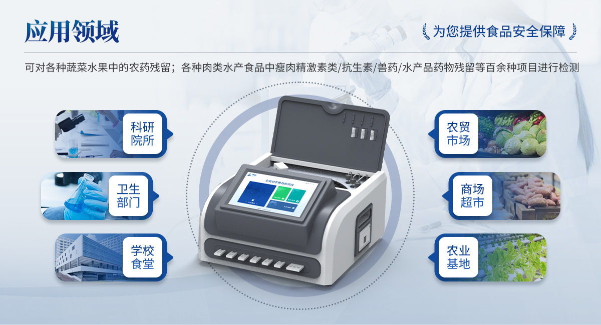 全自動農(nóng)獸藥殘留檢測儀可對各種蔬菜水果中有機磷和氨基甲酸酯類農(nóng)藥殘留;各種肉類水產(chǎn)食品中瘦肉精激素類殘留,抗生素殘留,獸藥殘留,水產(chǎn)品藥物殘留等百余種項目進行快速檢測。該設(shè)備廣泛應用于蔬菜批發(fā)市場、超市、商場、食藥監(jiān)等部門的蔬菜和水果中的農(nóng)藥殘留檢測。