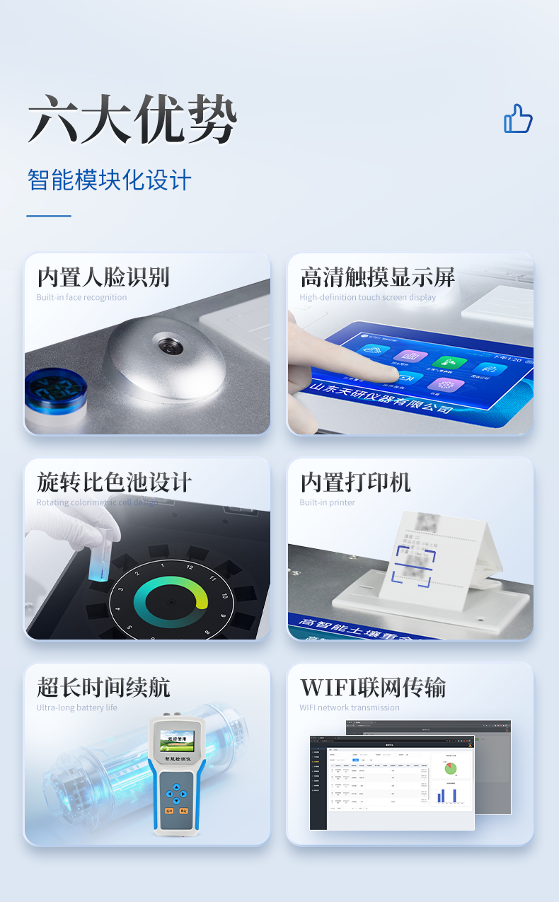 | ★1、安卓智能操作系統(tǒng)Android 7.1版本,主控芯片采用ARM Cortex-A7,RK3288/4核處理器,主頻1.88Ghz,運(yùn)轉(zhuǎn)速度更快速,穩(wěn)定性更強(qiáng)。 | ★2、可檢測各種土壤、肥料、作物、食品、水質(zhì)、環(huán)境等共200多個測試項目,一機(jī)多用,功能齊全。 | ★3、測試速度更快!無需空白對照和標(biāo)準(zhǔn)校準(zhǔn),省卻以往繁瑣的操作步驟,一鍵式操作,直接讀取數(shù)據(jù),**率,低消耗。 | ★4、采用精密旋轉(zhuǎn)比色池設(shè)計(**號:ZL 2018 2 1777724.7),光源一致性更加**,保證檢測精度。 | ★5、12個旋轉(zhuǎn)檢測通道,一次性可快速檢測12個樣品,極大提升檢測效率,降低檢測成本。 | ★6、采用高精度濾光片技術(shù)自主**分析方法(**號:ZL 2020 2 1763837.9),**認(rèn)證。 | ★7、具有自身保護(hù)功能,內(nèi)置人臉識別攝像頭可掃臉登錄,也可設(shè)置用戶名和密碼,防止非工作人員操作查看實驗數(shù)據(jù)。 | ★8、檢測過程中內(nèi)置校準(zhǔn)功能,智能恒流穩(wěn)壓,光強(qiáng)自動校準(zhǔn),確保檢測準(zhǔn)確度,取得中國計量科學(xué)研究院的《校準(zhǔn)證書》。 | ★9、儀器標(biāo)配wifi無線上傳、4G聯(lián)網(wǎng)傳輸、GPRS無線遠(yuǎn)傳,快速上傳數(shù)據(jù)。 | ★10、配有智慧云農(nóng)業(yè)平臺,儀器連入無線網(wǎng)絡(luò)后,可將檢測數(shù)據(jù)可選擇性或批量無線上傳,方便用戶進(jìn)行數(shù)據(jù)管理和長期分析。 | 11、儀器配同時具有USB接口、以太網(wǎng)接口,內(nèi)置大容量內(nèi)存,并可隨時用U盤拷貝數(shù)據(jù)。 | ★12、可用手機(jī)隨時登錄云平臺在線移動查看歷史數(shù)據(jù) | ★13、內(nèi)置作物專家施肥系統(tǒng),可對百余種全國農(nóng)業(yè)經(jīng)濟(jì)作物、果樹等的目標(biāo)產(chǎn)量計算推薦施肥量,依據(jù)施肥配方科學(xué)指導(dǎo)農(nóng)業(yè)生產(chǎn)。測土配方施肥結(jié)果可打印,打印內(nèi)容包含:作物種類、肥料種類、目標(biāo)產(chǎn)量、需求總量、建議施肥方案。 | ★14、內(nèi)置植物營養(yǎng)診斷標(biāo)準(zhǔn)圖譜,根據(jù)各農(nóng)作物營養(yǎng)缺失的圖片,進(jìn)行葉面對比,診斷豐缺。 | ★15、4波長專業(yè)測試?yán)涔庠矗t、藍(lán)、綠、橙),光源波長穩(wěn)定,長時間連續(xù)工作光源無溫漂現(xiàn)象,壽命長達(dá)10萬小時級別,重現(xiàn)性好,準(zhǔn)確度高。 | 16、比色池部分采用標(biāo)準(zhǔn)1cm比色皿,無機(jī)械位移及磨損,光路測試定位**,有效屏蔽外光干擾,保證檢測結(jié)果優(yōu)于國標(biāo)要求。 | ★17、儀器系統(tǒng)內(nèi)帶有樣品前處理操作視頻,各種樣品檢測方法點(diǎn)擊視頻模塊即可觀看,檢測人員無需自學(xué)說明書,指導(dǎo)教學(xué)方便快速,方便新手快速操作。 | 18、內(nèi)置新一代高速熱敏打印機(jī)(無需色帶),打印內(nèi)容包含:檢測單位、檢測人員、檢測項目、通道號、吸光度、養(yǎng)分含量(mg/kg)、檢測時間、以及二維碼等信息 | ★19、高靈敏7寸真彩觸摸屏,采用更加**和人性化操作,高清晰高交互顯示,大程度降低傳統(tǒng)儀器的繁瑣操作和失誤,并取得多項《軟件著作權(quán)》。 | 20、內(nèi)置時鐘功能,方便操作時間記錄,長期歷史追溯。 | 21、可設(shè)置多賬戶賬號密碼登錄,**UI交互界面,不同的用戶可自由添加編輯檢測信息,保存后可長期使用。 | 22、GPS功能:可在野外作業(yè)時記錄經(jīng)緯度地點(diǎn),滿足特殊用戶需求。 | 23、內(nèi)置低電壓提示功能,可在檢測時明確電量,避免測試數(shù)據(jù)偏移,同時具有斷電保護(hù)功能,斷電自動保存數(shù)據(jù),防止數(shù)據(jù)丟失。 | ★24、交直流兩用供電方式,內(nèi)置大容量充電鋰電池,滿電狀態(tài)下可連續(xù)工作10余小時,同時可外接車載電源蓄電。 | ★25、儀器具有中英文切換功能,可滿足出口要求。 | 26、高強(qiáng)度PVC工程塑料手提箱設(shè)計,堅固耐用,便于攜帶。 |