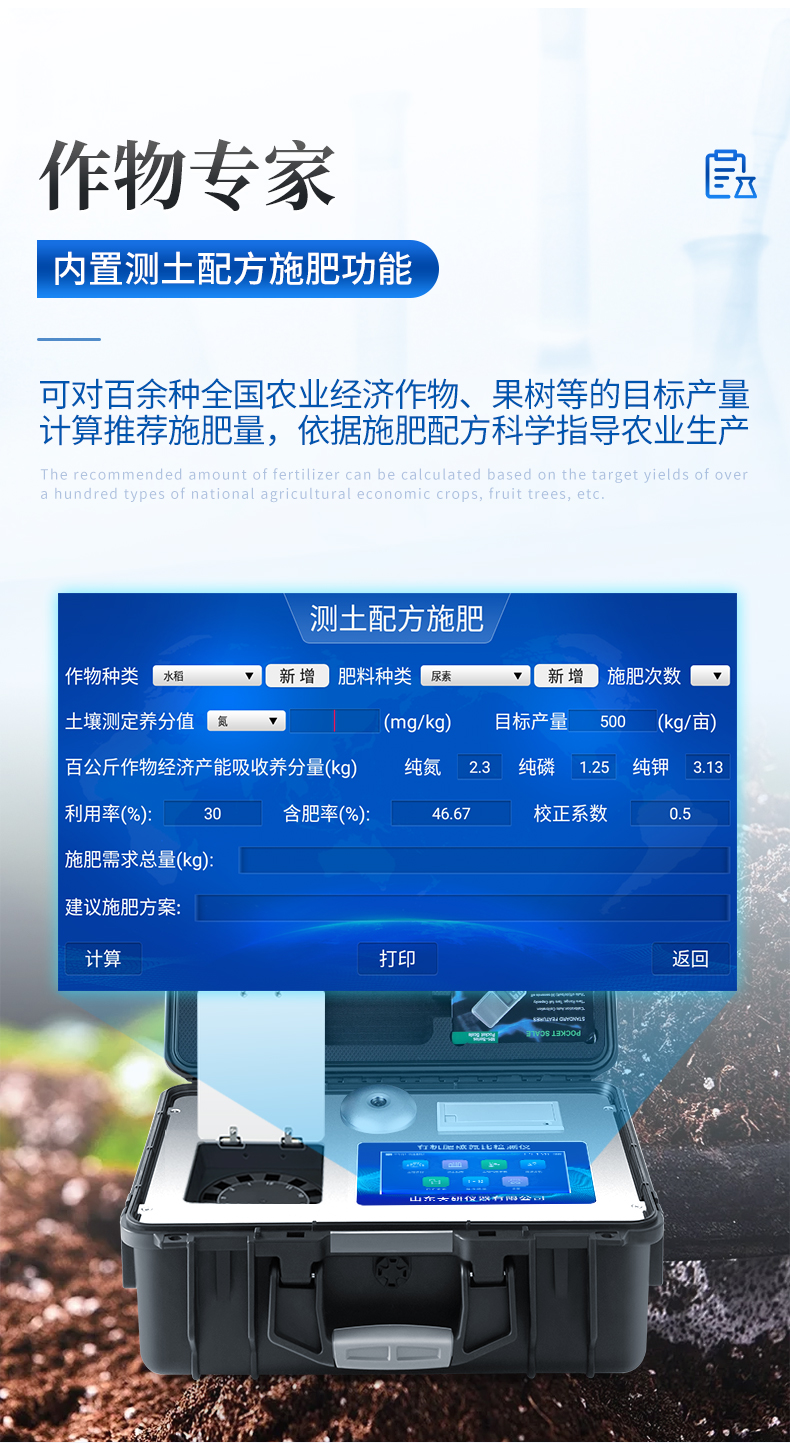 | 配套齊全:該儀器集藥、器、儀為一體,攜帶方便,相當(dāng)于一個小型移動實驗室,無需用戶自配附件,亦可靈活野外流動測試。適于農(nóng)業(yè)服務(wù)部門或農(nóng)資經(jīng)銷商、高教院校、科研院所、合作社、肥料廠商、大種植戶測土施肥和鑒別肥料真假及環(huán)保檢測應(yīng)用。 | 檢測功能全:測試項目國內(nèi)外全面,除標(biāo)配試劑外,其他各類藥劑均可加配選購。 | 速度快捷:無需空白對照和標(biāo)準(zhǔn)校準(zhǔn),操作簡便、直接測試,配套成品藥劑開瓶即用,無須配置。 |
