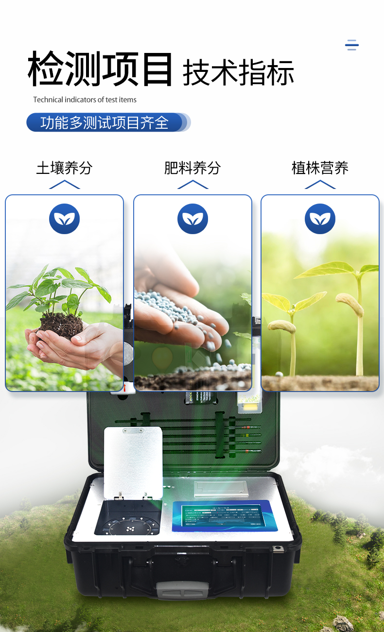 產(chǎn)品簡介: 配套齊全:該儀器集藥、器、儀為一體,攜帶方便,相當于一個小型移動實驗室,無需用戶自配附件,亦可靈活野外流動測試。適于農(nóng)業(yè)服務(wù)部門或農(nóng)資經(jīng)銷商、高教院校、科研院所、合作社、肥料廠商、大種植戶測土施肥和鑒別肥料真假及環(huán)保檢測應(yīng)用。 檢測功能全:測試項目國內(nèi)外全面,除標