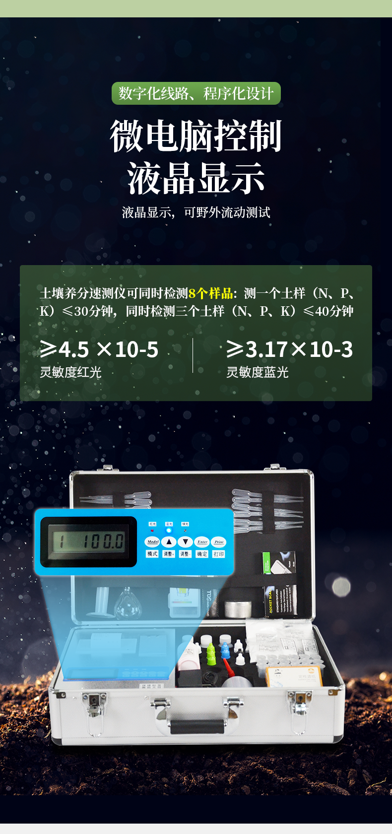 | ★《機箱/藥劑一體式鋁合金機箱》設(shè)計,便于攜帶、堅固耐用,配套檢測方法及成品藥劑。 | ★微電腦控制,數(shù)字化線路、程序化設(shè)計,液晶顯示,交直流兩用,測試數(shù)據(jù)可存儲查詢,可野外流動測試,大程度降低操作者的失誤和勞動強度。 | ★分辨率:0.001,觸摸式按鍵,內(nèi)置新型熱敏打印機,可打印測試結(jié)果。 | ★全項目土壤肥料養(yǎng)分速測儀可檢測土壤及化肥、有機肥(含葉面肥、水溶肥、噴施肥等)、植株中的速效氮、速效磷、有效鉀、全氮、全磷、全鉀、有機質(zhì)、酸堿度,鈣、鎂、硫、鐵、錳、硼、鋅、銅、氯、硅、鉬等各種中微量元素。 | ★采用高亮LED光源,濾光式處理,保證光源波長穩(wěn)定, 硅半導(dǎo)體作為信號接收系統(tǒng), 壽命長達10萬小時級別。光源穩(wěn)定,重現(xiàn)性好,準(zhǔn)確度高。 | ★比色槽部分采用單通道設(shè)計,無機械位移及磨損,光路測試定位**,保證測定結(jié)果精度。 | ★配套專家施肥系統(tǒng)數(shù)據(jù),可對百余種全國農(nóng)業(yè)、果樹、 經(jīng)濟作物的目標(biāo)產(chǎn)量科學(xué)計算推薦施肥量。 |