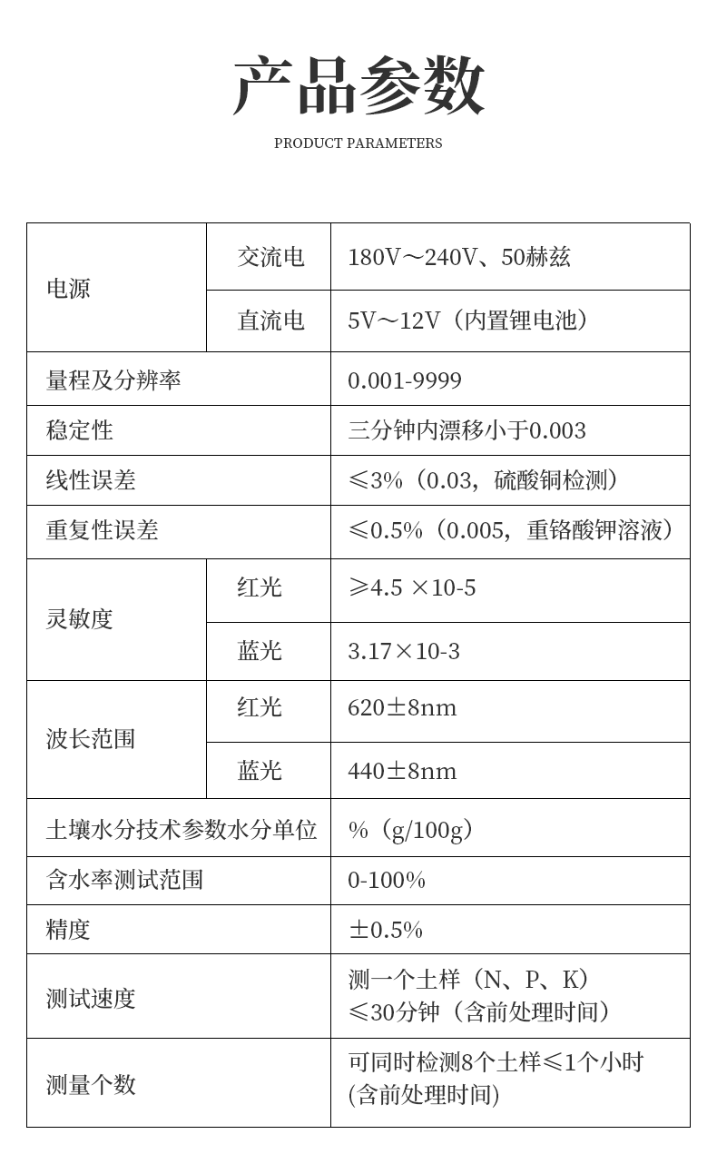 | 1.電源:交流 220±22V 直流 12V+5V(可用車載電源也可選擇儀器內(nèi)置鋰電池) | 2.功率: ≤5W | 3.量程及分辨率:0.001-9999 | 4.重復(fù)性誤差: ≤0.3%(0.003,重鉻酸鉀溶液) | 5.儀器穩(wěn)定性:三分鐘內(nèi)漂移小于0.2%(0.002,透光度測量)。儀器開機預(yù)熱5分鐘后,兩分鐘內(nèi)顯示數(shù)字無漂移(透光度測量),五分鐘內(nèi)數(shù)字漂移不超過0.3%(透光度測量);二十分鐘內(nèi)數(shù)字漂移不超過0.5%(透光度測量)、0.001(吸光度測量);三十分鐘內(nèi)數(shù)字漂移不超過0.7%(透光度測量)、0.002(吸光度測量)。 | 6.線性誤差: ≤1%(0.01,硫酸銅檢測) | 7.靈敏度:紅光≥4.5 ×10-5 藍光≥3.17×10-3 綠光≥2.35×10-3 橙光≥2.13×10-3 | 8.波長范圍 :紅光:680±2nm; 藍光:420±2nm;綠光:510±2nm;橙光:590±4nm | 9.PH值(酸堿度): (1)測試范圍:1~14 (2)精度:0.1 (3)誤差:±0.1(擴展) | 10.鹽量(電導(dǎo)):(1)測試范圍:0.01%~1.00% (2)相對誤差:±5%(擴展) | 11.土壤水分技術(shù)參數(shù)水分單位:﹪(g/100g);含水率測試范圍:0-100﹪;誤差小于0.5% | 12.土壤中速效N、P、K三種養(yǎng)分一次性同時浸提測定、科學(xué)指導(dǎo)施肥量 | 13.肥料中氮(N)、磷(P)、鉀(K)等養(yǎng)分同時、快速、準(zhǔn)確檢測 | 14.測試速度:測一個土樣(N、P、K)≤30分鐘(含前處理時間,不需用戶提供任何附件) | 15.同時測8個土樣≤1小時(含前處理時間) | 16.數(shù)據(jù)查詢打?。簻y試數(shù)據(jù)可存儲、查詢、打印,內(nèi)置新型一鍵式熱敏打印機 |