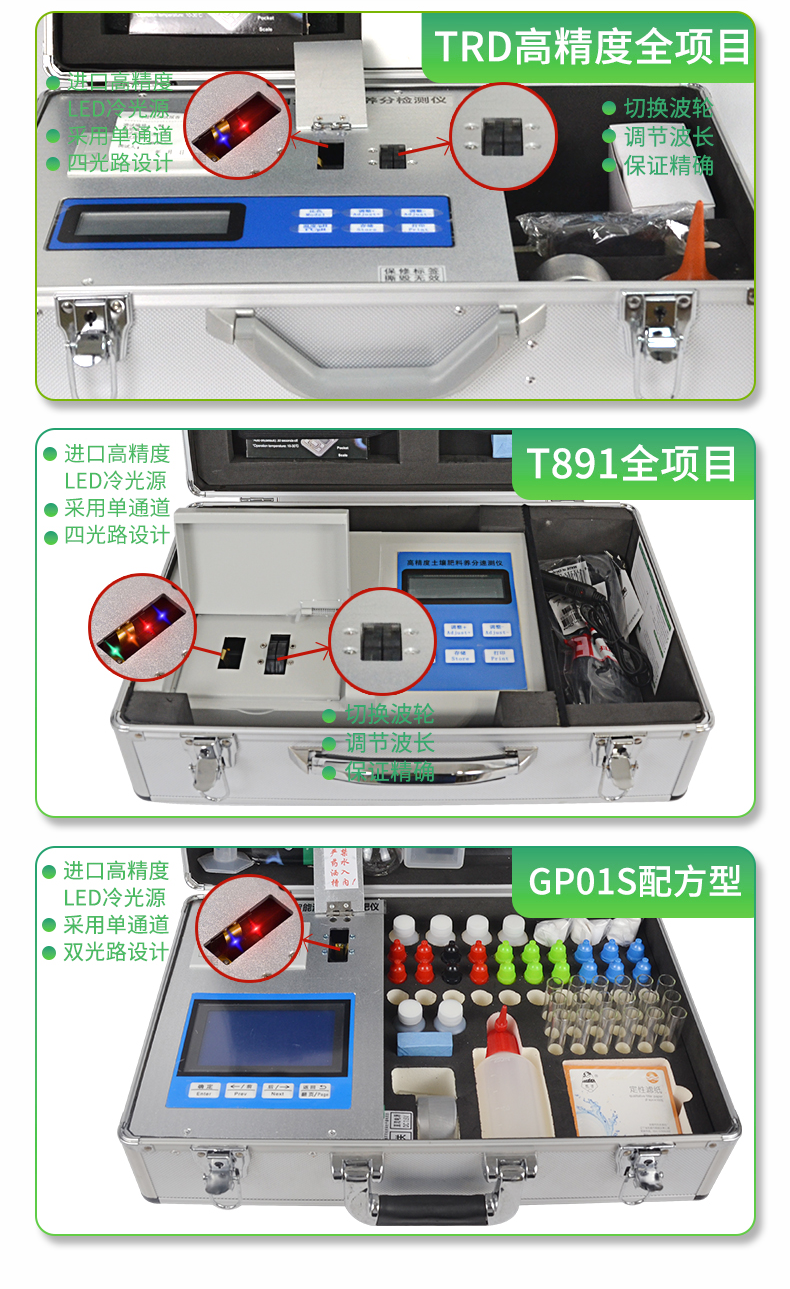 | 全項目土壤肥料養(yǎng)分速測儀功能全:測試項目國內(nèi)外最全(各類藥劑均可選購)。 | 配套齊全:該儀器集藥、器、儀為一體,攜帶方便,相當(dāng)于一個小型實驗室。適于農(nóng)業(yè)服務(wù)部門或農(nóng)資經(jīng)銷商、肥料廠商測土施肥和鑒別肥料真假。 | 操作簡便、速度快捷,成品藥劑開瓶即用,無須配置。 |