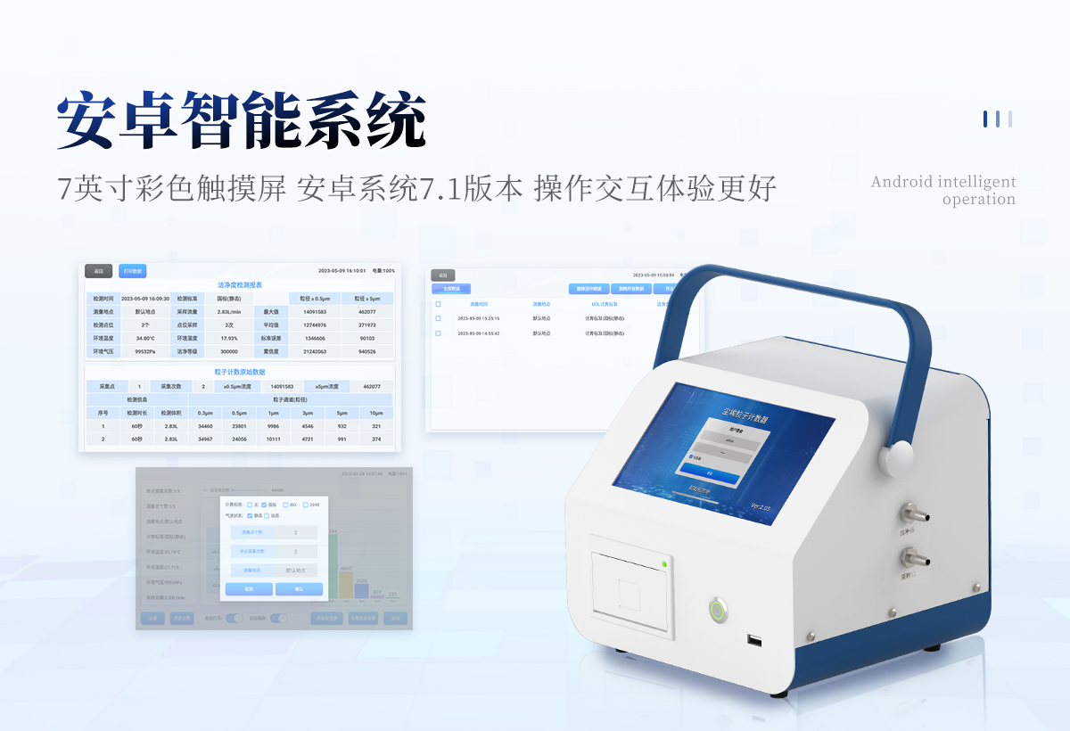 | 1、安卓系統(tǒng)7.1版本,操作交互體驗(yàn)更好。 | 2、內(nèi)置溫濕度傳感器、環(huán)境氣壓傳感器 | 3、核心部件光散射傳感器明顯消除腔體的雜散光,信噪比大為提高。從而使測(cè)量更準(zhǔn)確更可靠。 | 4、按95%置信度(UCL)計(jì)算,計(jì)數(shù)結(jié)果可換算成m3和ft3 | 5、依照凈化級(jí)別劃分和規(guī)定,自動(dòng)判定凈化級(jí)別,使用便利。 | 6、帶審計(jì)追蹤功能,可查詢、可追溯、可控制,符合FDA 21CFR PART11規(guī)范 | 7、支持wifi、藍(lán)牙傳輸,數(shù)據(jù)可無(wú)線上傳;同時(shí)支持U盤拷貝數(shù)據(jù),免驅(qū)動(dòng)插拔。 | 8、配置監(jiān)管平臺(tái),檢測(cè)結(jié)果可直接無(wú)線傳至平臺(tái),進(jìn)行潔凈度長(zhǎng)短期分析,輔助管理。 | 9、內(nèi)置新一代高速熱敏打印機(jī),可選擇所需要打印的粒徑通道,靈活打印結(jié)果。 | 10、交直流兩用,內(nèi)置充電鋰電池,環(huán)保耐用可支持連續(xù)采樣6小時(shí)以上。 | 11、便捷簡(jiǎn)易伸縮式云臺(tái)支架,安裝采樣操作更加方便。 |