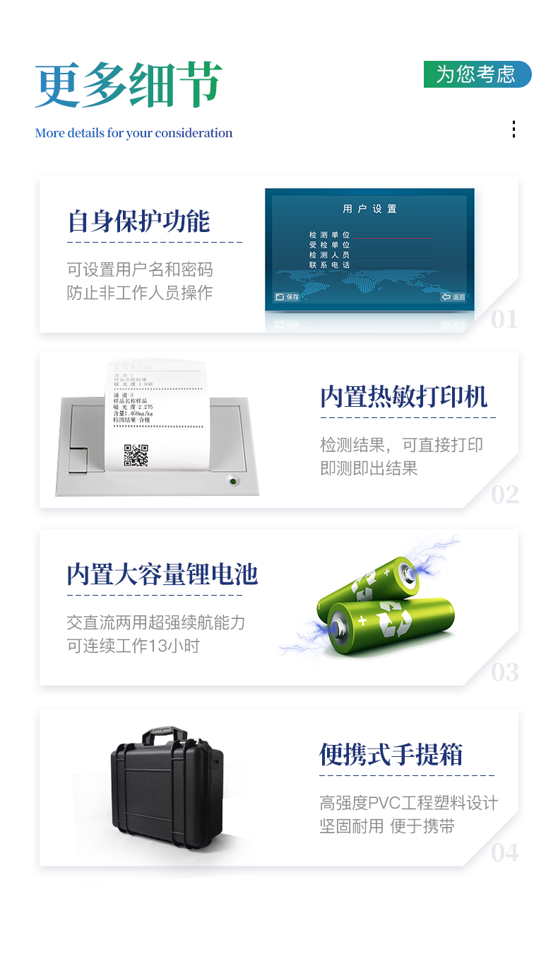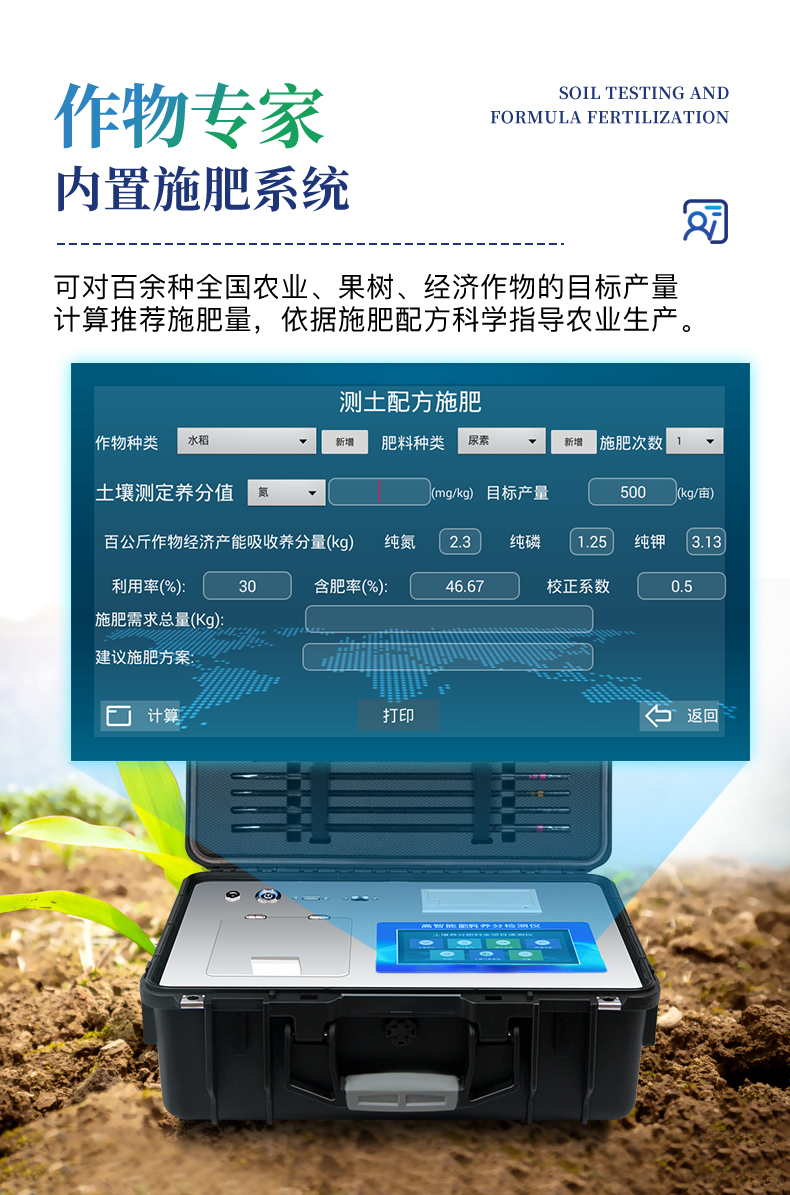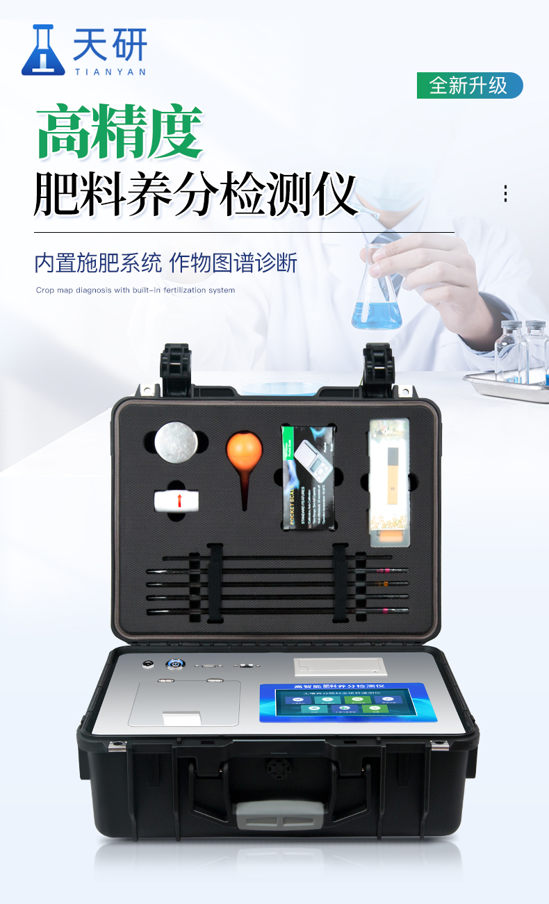 | 可檢測化肥、有機(jī)肥(含葉面肥、水溶肥、噴施肥等)、植株中的速效氮、速效磷、有效鉀、全氮、全磷、全鉀、有機(jī)質(zhì)、酸堿度,鈣、鎂、硫、鐵、錳、硼、鋅、銅、氯、硅、鉬等各種中微量元素以及鉛、鉻、鎘、汞、砷、鎳、鋁、氟、鈦、硒等各種重金屬含量。 | 安卓智能操作系統(tǒng),采用更加**和人性化操作,儀器標(biāo)配wifi聯(lián)網(wǎng)上傳、4G聯(lián)網(wǎng)傳輸、GPRS無線遠(yuǎn)傳,快速上傳數(shù)據(jù)。 | 內(nèi)置作物專家施肥系統(tǒng),可對(duì)百余種全國農(nóng)業(yè)、果樹、經(jīng)濟(jì)作物的目標(biāo)產(chǎn)量計(jì)算推薦施肥量,依據(jù)施肥配方科學(xué)指導(dǎo)農(nóng)業(yè)生產(chǎn)。 | 采用精密旋轉(zhuǎn)比色池設(shè)計(jì),光源一致性更加**保證檢測精度。一次性可快速檢測12個(gè)樣品,極大提升檢測效率,降低檢測成本。 | 內(nèi)置植物營養(yǎng)診斷標(biāo)準(zhǔn)圖譜,根據(jù)各農(nóng)作物營養(yǎng)缺失的圖片,進(jìn)行葉面對(duì)比,診斷豐缺。 | 采用高精度濾光片技術(shù)自主**分析方法(**號(hào):ZL 2018 2 1777724.7),比色槽部分采用標(biāo)準(zhǔn)1cm比色皿,無機(jī)械位移及磨損,光路測試定位**,保證檢測結(jié)果優(yōu)于國標(biāo)要求。 | 儀器配有數(shù)據(jù)接收平臺(tái),無需數(shù)據(jù)線,數(shù)據(jù)可直接局域網(wǎng)和互聯(lián)網(wǎng)無線上傳,方便進(jìn)行數(shù)據(jù)管理和數(shù)據(jù)長期分析。 | 儀器內(nèi)置新一代高速熱敏打印機(jī),檢測完成可自動(dòng)打印檢測報(bào)告和二維碼。 | 高靈敏7寸電容觸摸屏,高清晰高交互顯示,大程度降低傳統(tǒng)儀器的繁瑣操作和失誤。 | 每個(gè)通道均配置四波長冷光源,所有光源實(shí)現(xiàn)恒流穩(wěn)壓,保證波長穩(wěn)定。 硅半導(dǎo)體作為信號(hào)接收系統(tǒng),壽命長達(dá)10萬小時(shí)級(jí)別。重現(xiàn)性好,準(zhǔn)確度高。 | 高強(qiáng)度PVC工程塑料手提箱設(shè)計(jì),堅(jiān)固耐用,便于攜帶,供電方式為交直流兩用,可野外流動(dòng)測試配套成品藥劑。 |