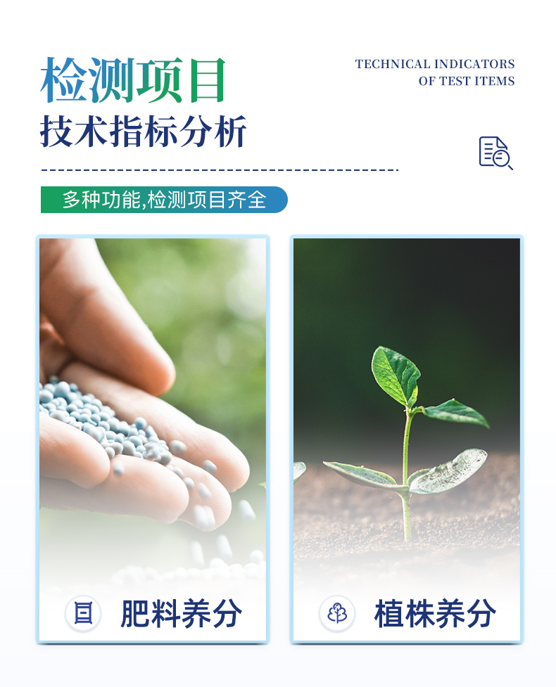 儀器特點(diǎn): 可檢測化肥、有機(jī)肥(含葉面肥、水溶肥、噴施肥等)、植株中的速效氮、速效磷、有效鉀、全氮、全磷、全鉀、有機(jī)質(zhì)、酸堿度,鈣、鎂、硫、鐵、錳、硼、鋅、銅、氯、硅、鉬等各種中微量元素以及鉛、鉻、鎘、汞、砷、鎳、鋁、氟、鈦、硒等各種重金屬含量。